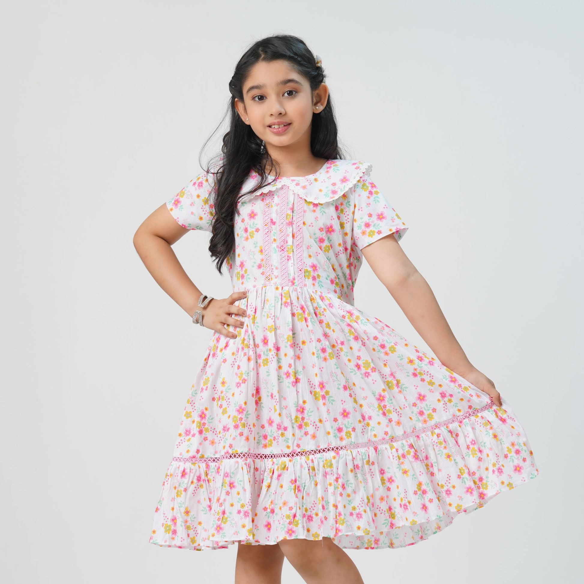 This adorable pink frock is crafted from 100% cotton, ensuring softness and comfort for all-day wear. Designed with a breathable and lightweight feel, it’s perfect for casual outings or special occasions. The classic silhouette adds a touch of charm, making it a must-have for any little girl’s wardrobe.