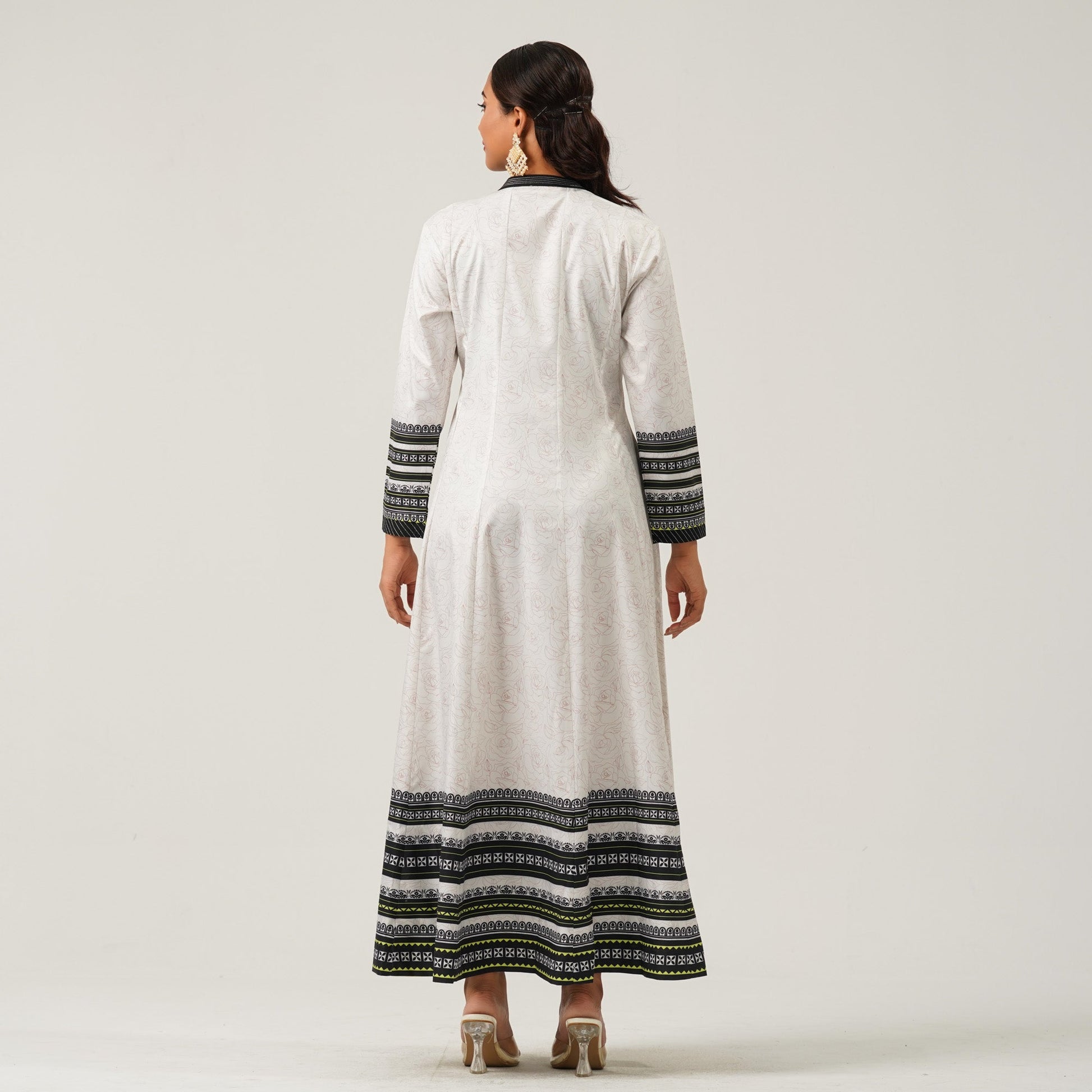 This elegant ethnic gown features classic black and white digital floral and border designs on a pearl white base. Crafted for a graceful silhouette, it blends tradition with modern flair perfect for festive or semi-formal occasions.