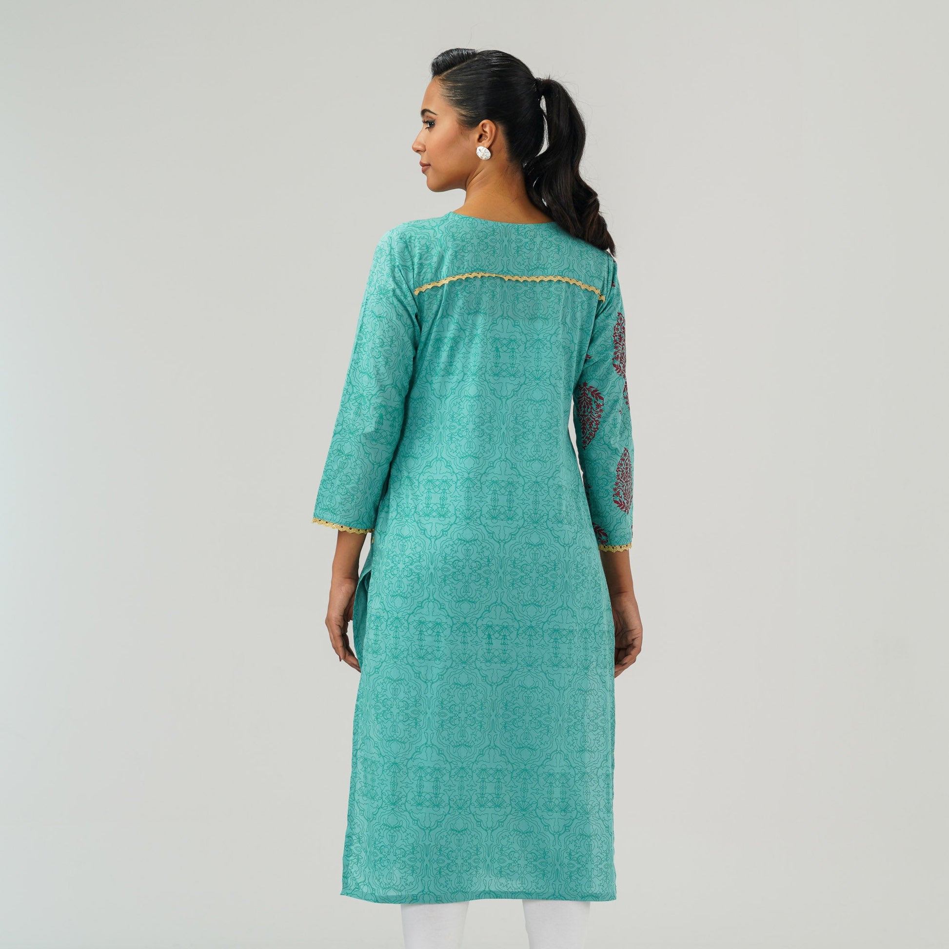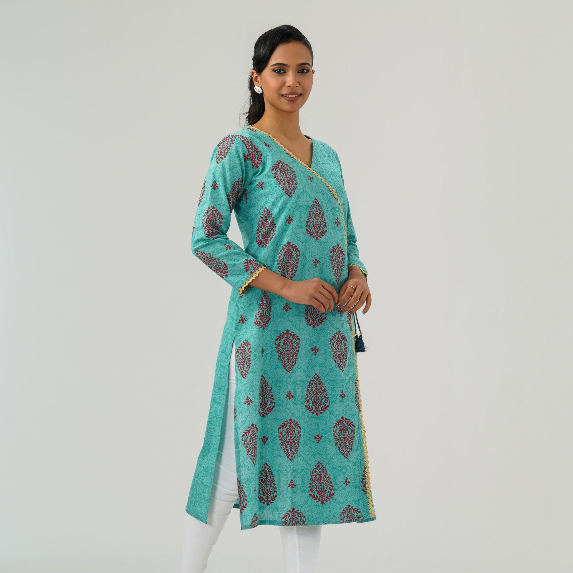 This elegant kurti in deep pastel features intricate screen print, delicate lace accents, and stylish tassel work for a graceful touch. Crafted from soft cotton fabric, it ensures comfort while maintaining a sophisticated look. Perfect for casual outings and festive occasions, this piece adds timeless charm to your wardrobe.