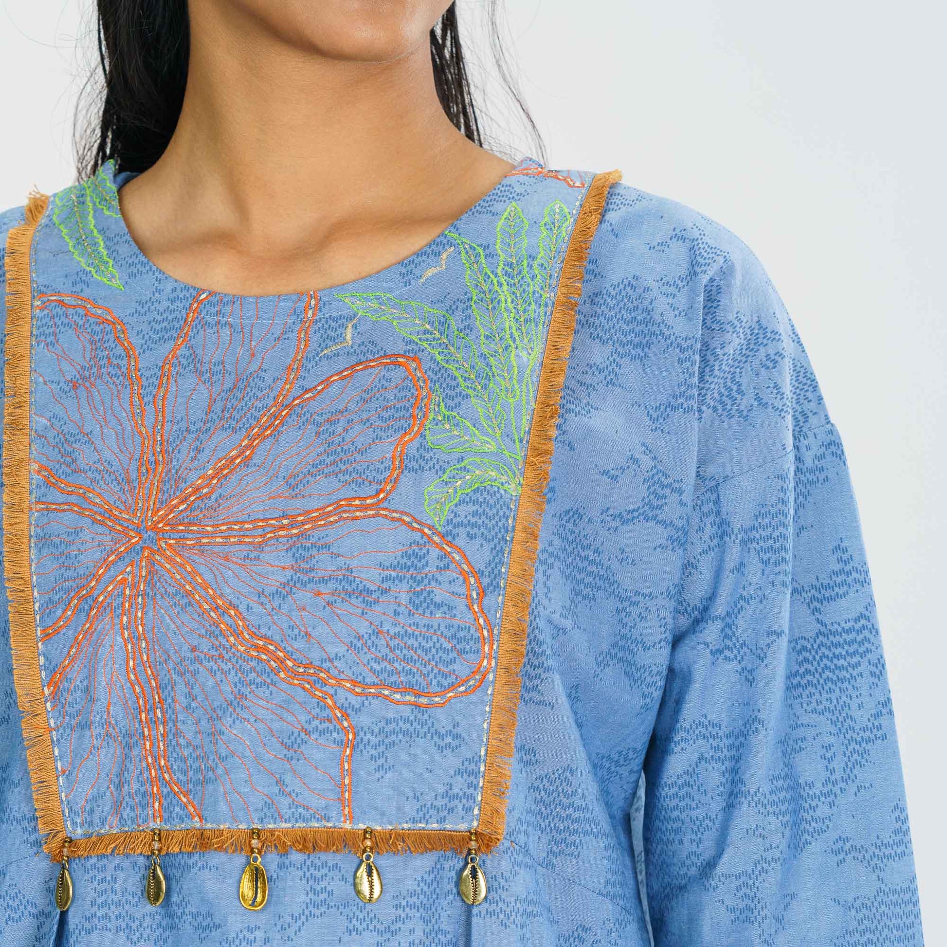 Elevate your style with this blue screen-printed ethnic top. Featuring detailed half-yoke embroidery and elegant shell work, it’s crafted from a comfortable mixed cotton fabric in a regular fit. Perfect for casual or festive occasions.