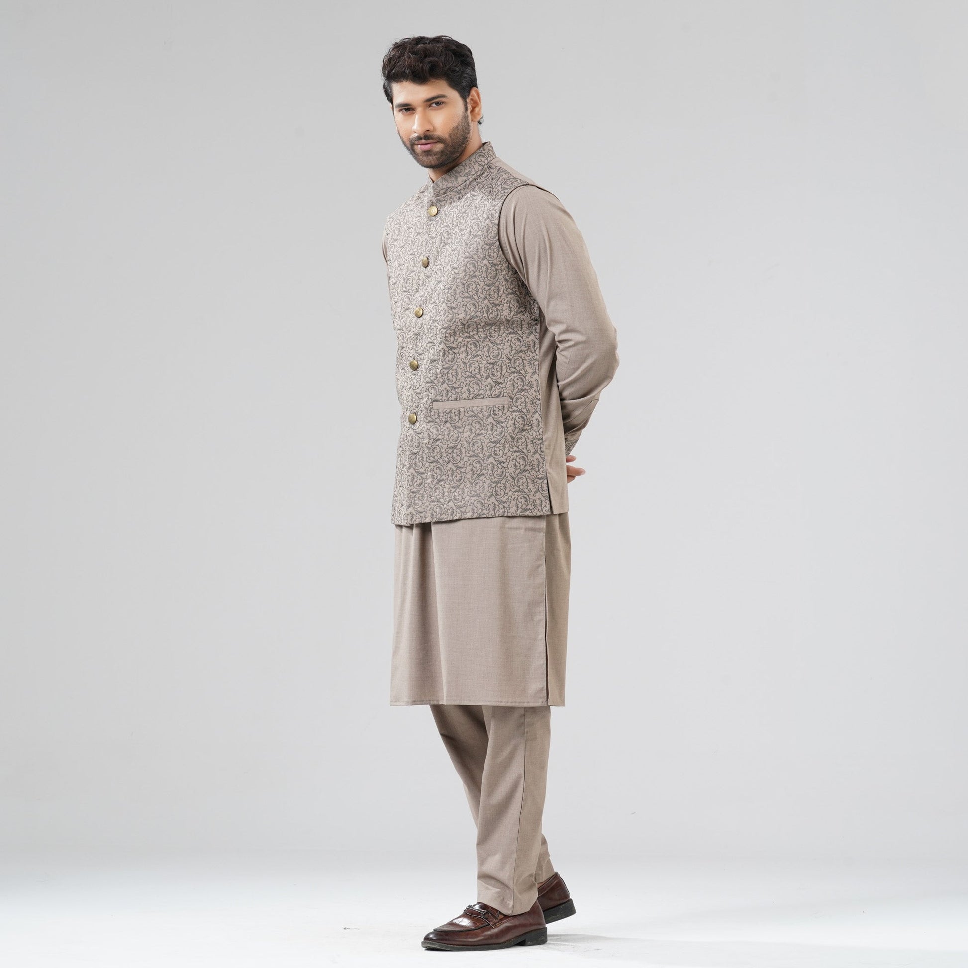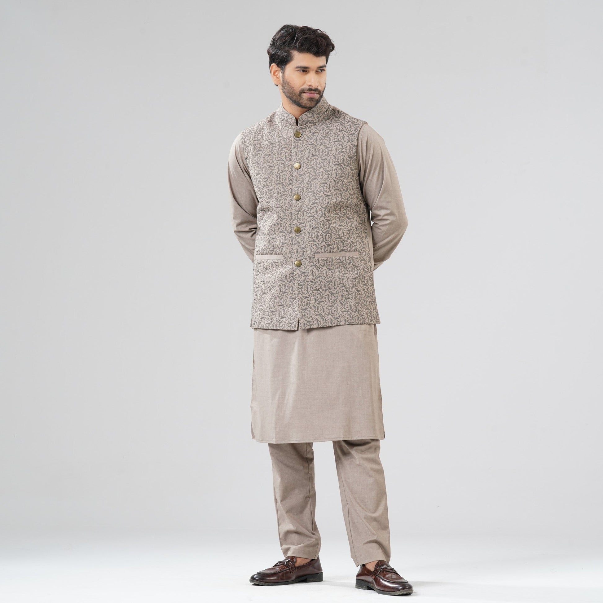 This men’s bronze brown panjabi set showcases intricate machine embroidery on the vest front, collar, and cuffs for a sophisticated finish. Made from high-quality fabric, it provides a comfortable regular fit and a polished look. Ideal for festive gatherings or formal occasions, this three piece ensemble blends traditional elegance with modern charm.