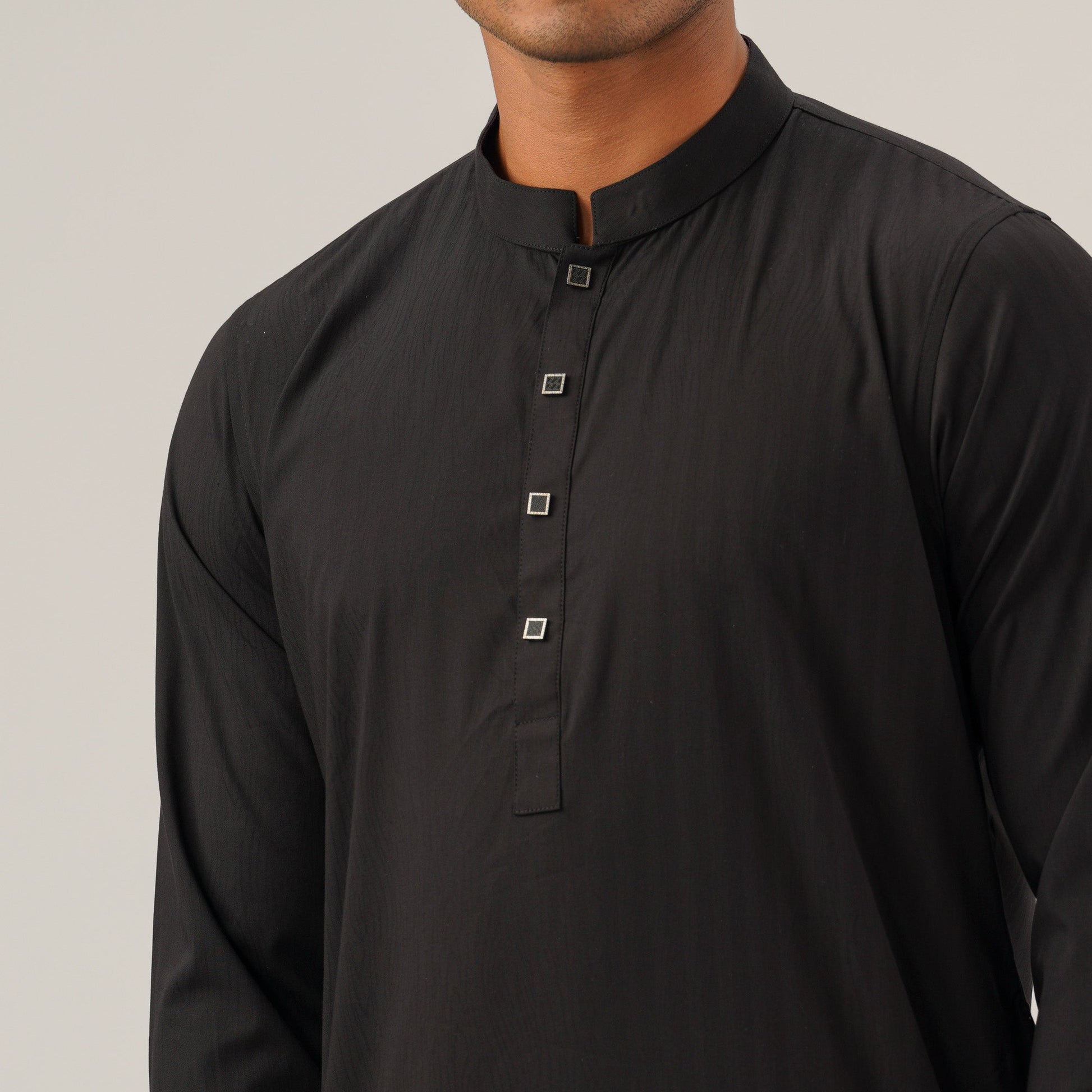 Mens black Panjabi crafted from luxurious bamboo silk fabric, offering a smooth and breathable feel. Designed in a solid color with a slim fit silhouette, it provides a refined and elegant look. Perfect for festive occasions, cultural events, or evening wear.
