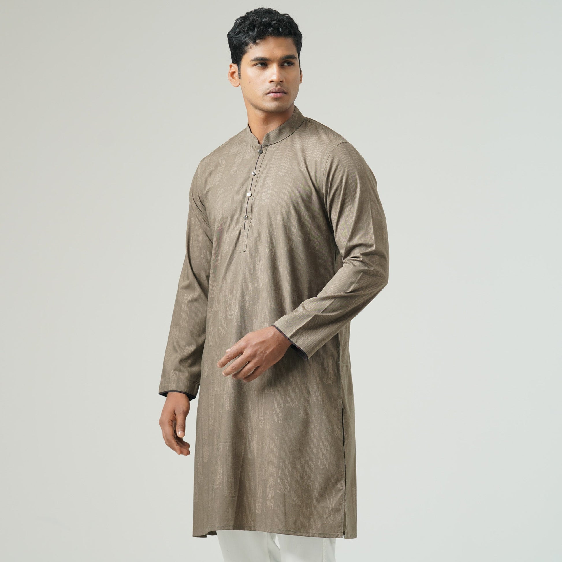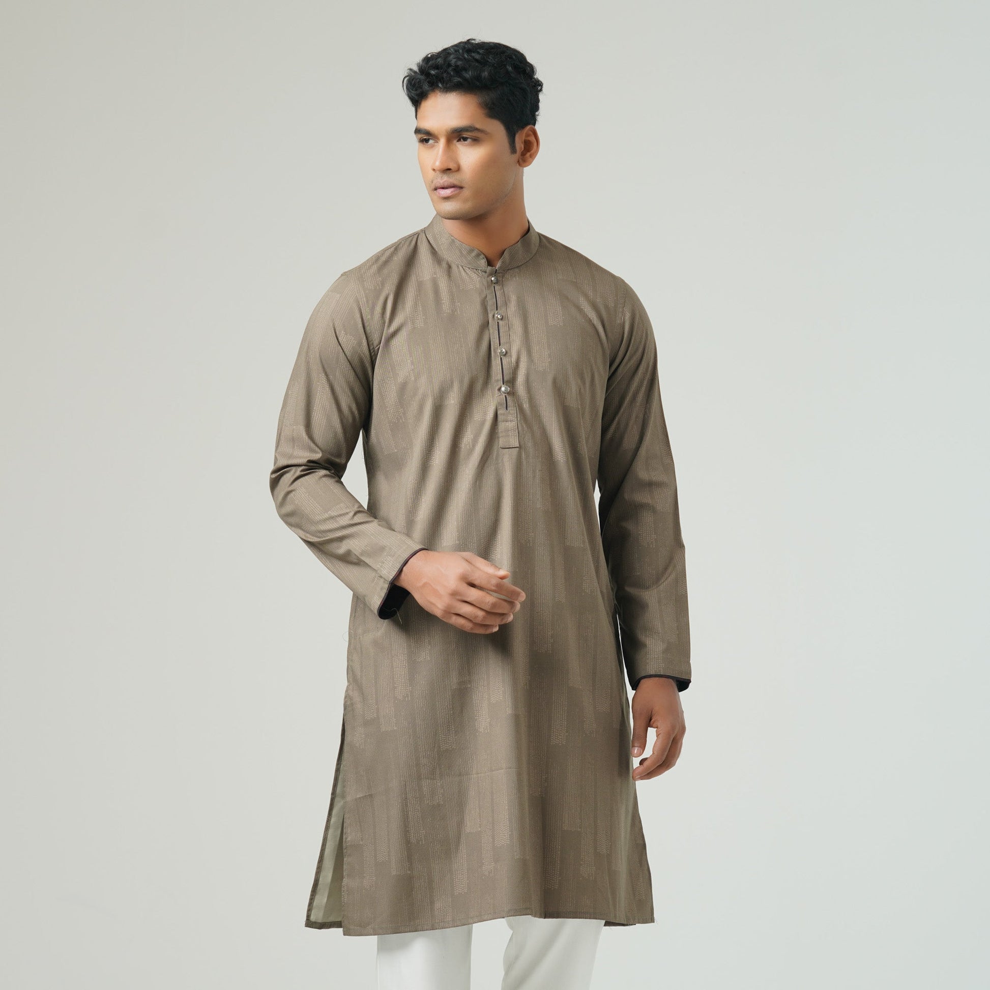 Elevate your traditional look with this classic slim-fit Panjabi in an elegant olive brown shade. Crafted from a premium cotton blended fabric, it ensures comfort and breathability. A perfect choice for festive occasions and cultural gatherings,