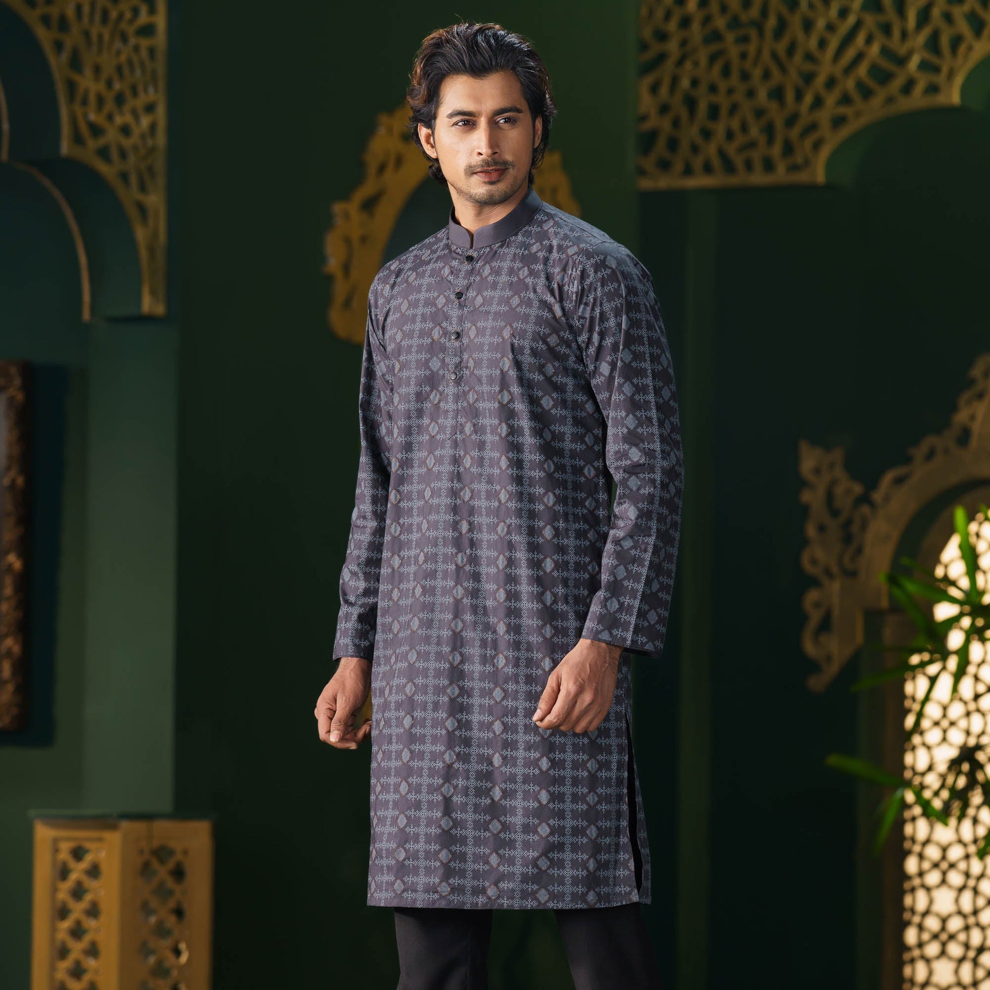 This men's gray Panjabi is crafted from soft cotton fabric and features a stylish print with a mandarin collar. The regular fit ensures comfort and a sleek appearance, making it perfect for both casual wear and festive occasions. A modern choice for men who appreciate subtle design with traditional elements.