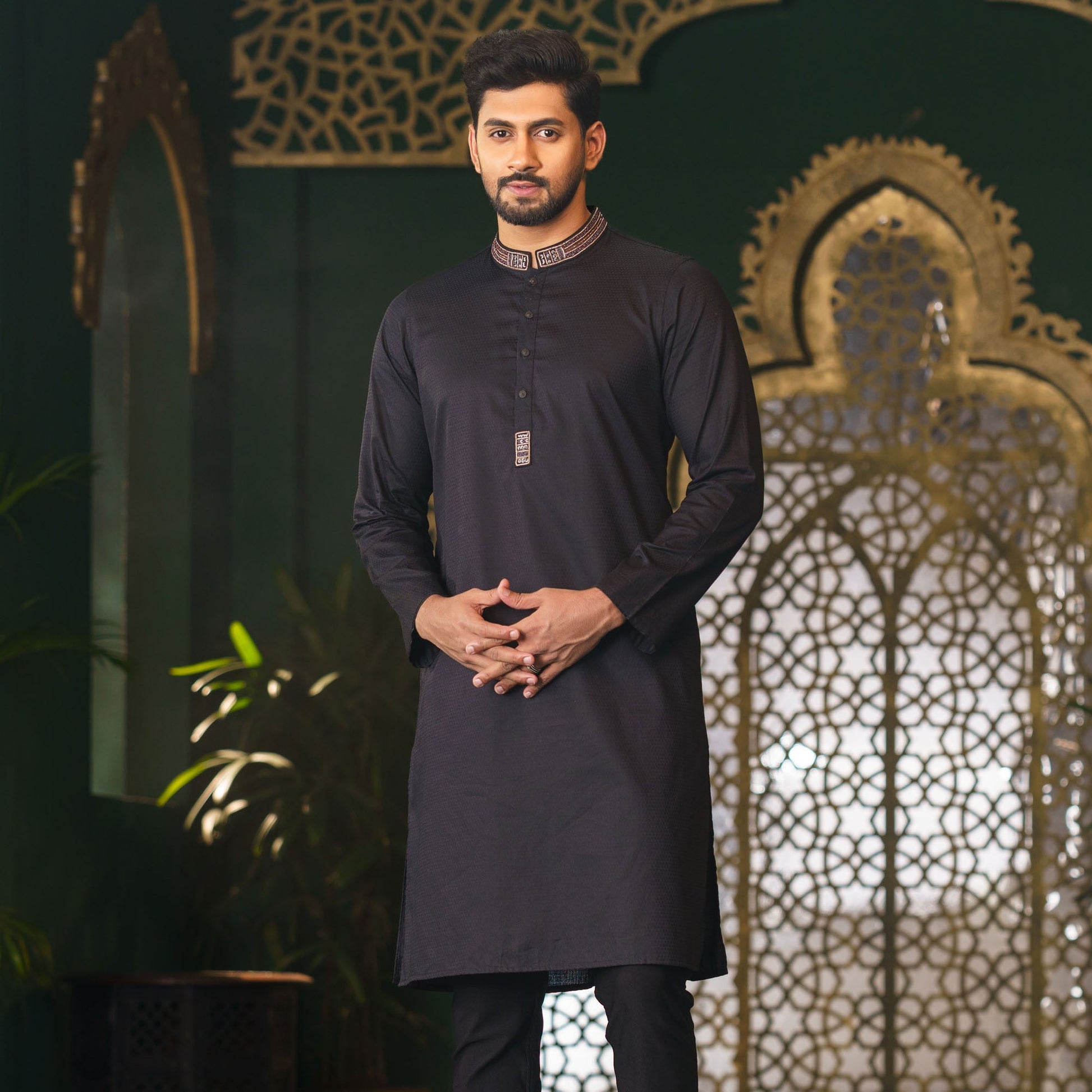 This men’s black karchupi Panjabi features a mandarin collar with elegant zardozi embroidery and metal shank buttons. Crafted from poly cotton, it provides a regular fit and is available in Panjabi size, making it a perfect choice for traditional and formal events.
