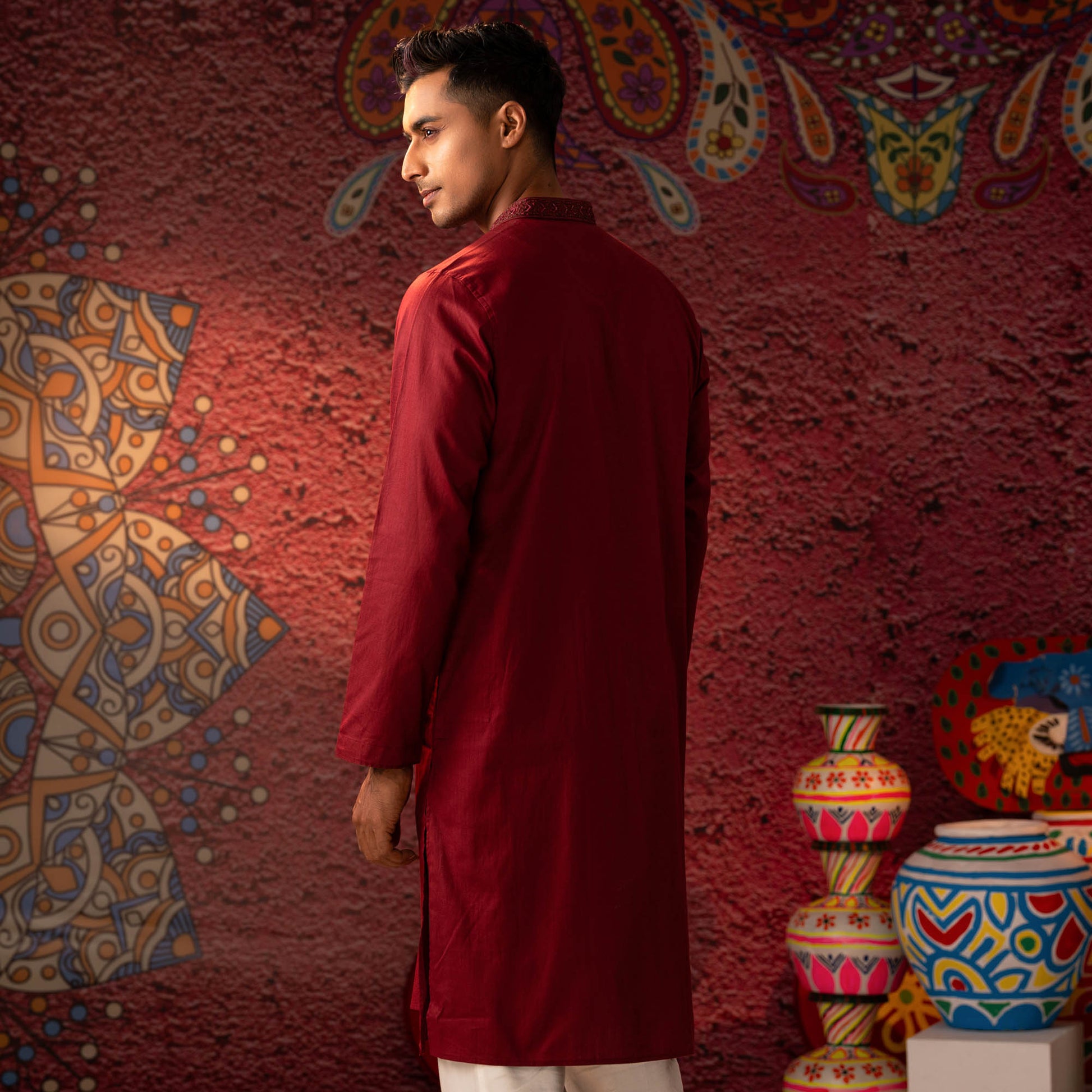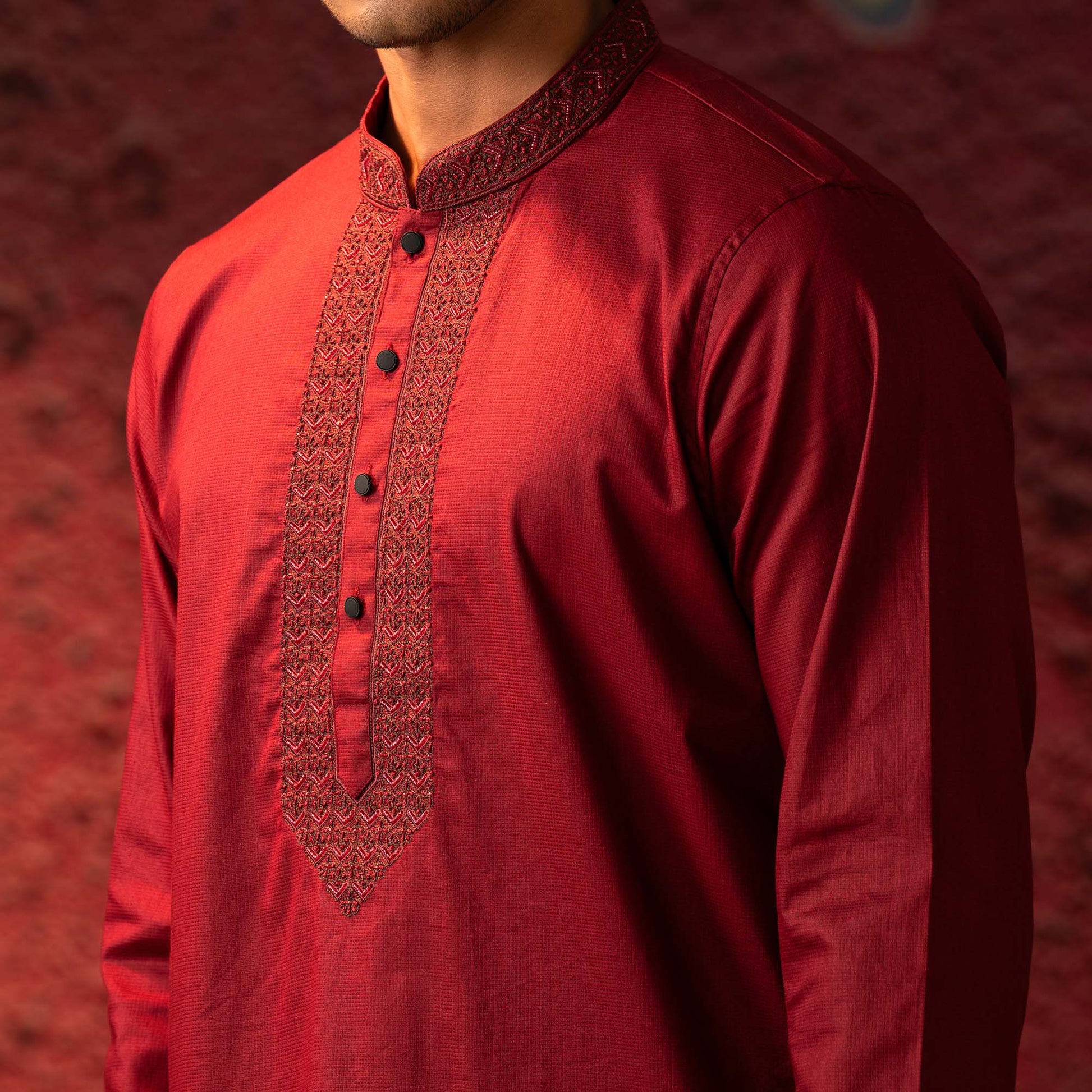 Elevate your festive look with this elegantly crafted maroon karchupi panjabi. Made from blended cotton, it offers a slim fit with intricate embroidery detailing for a refined traditional appeal. Perfect for special occasions and celebrations.