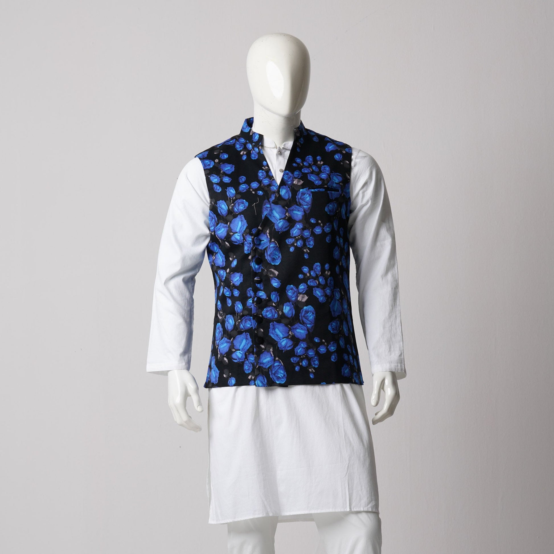 This black blue colored men’s vest is tailored from cotton fabric, offering a soft and comfortable feel. Its rich tone adds a touch of elegance, making it a perfect layering piece for both traditional and festive looks.