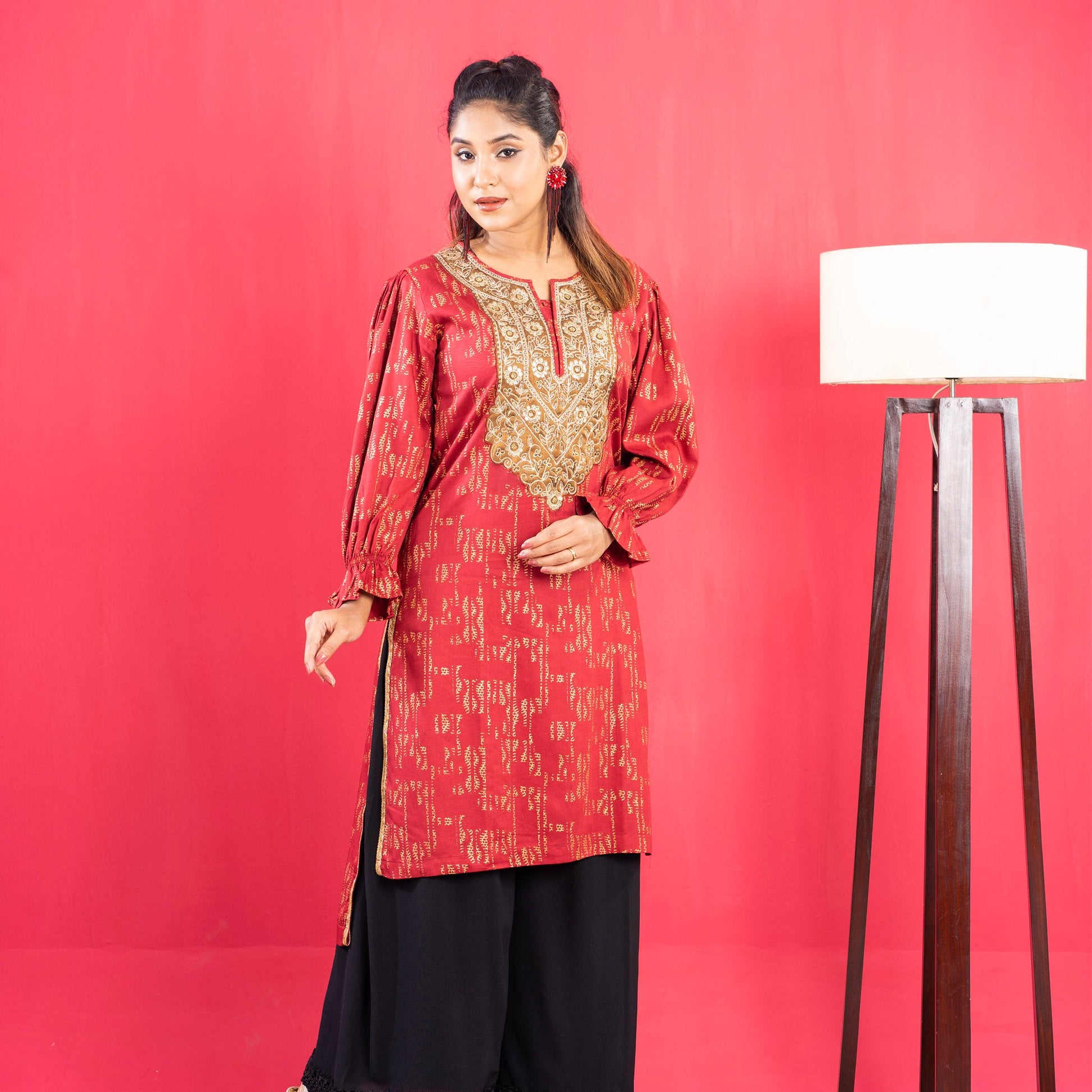 This Ladies Premium Kurti In Maroon Is Crafted From High-Quality Fabric And Features A Bishop Flounce Sleeve, Heavy Embroidery At The Neck, And All-Over Print On The Body. The Unique Design Makes It Perfect For Special Occasions Or Everyday Wear.