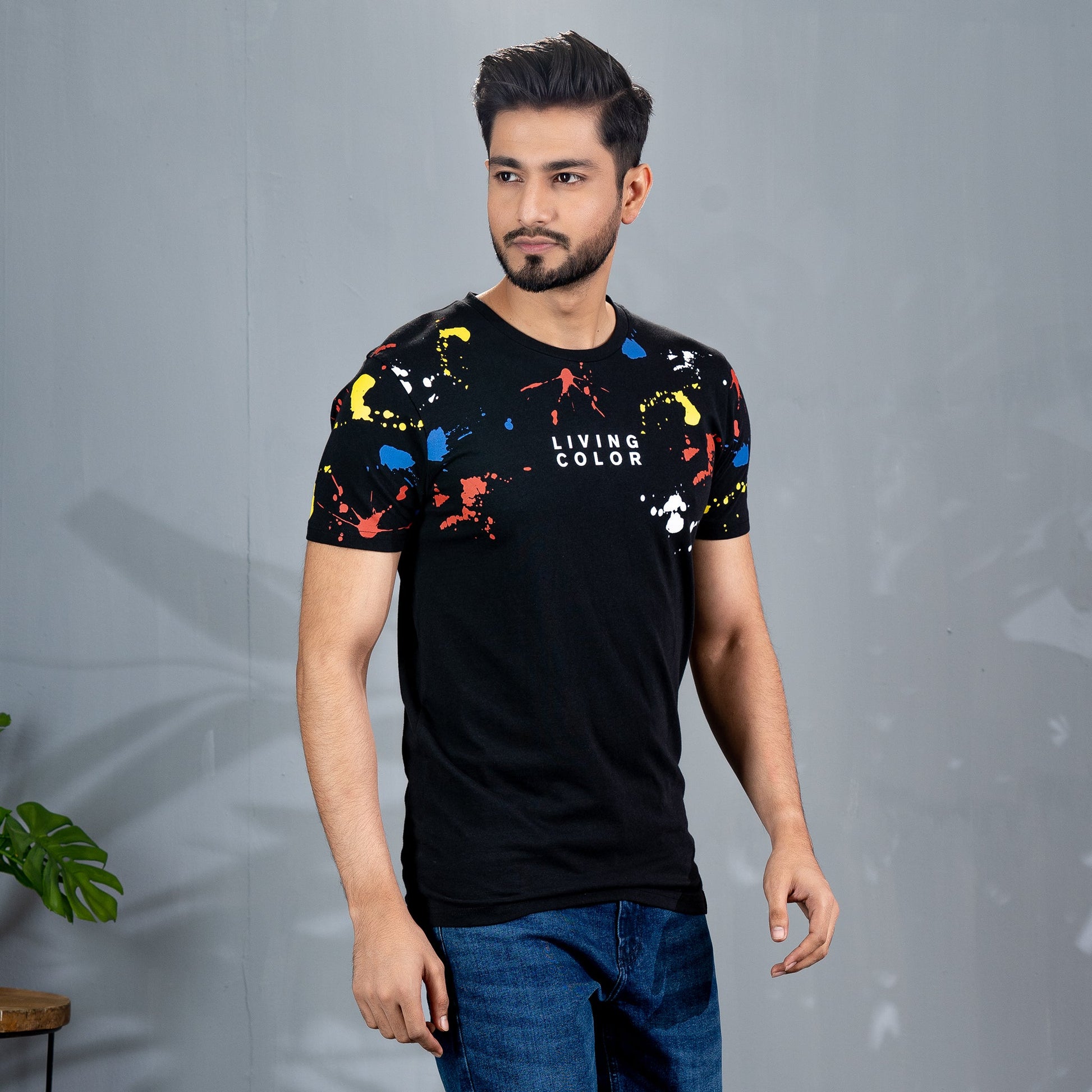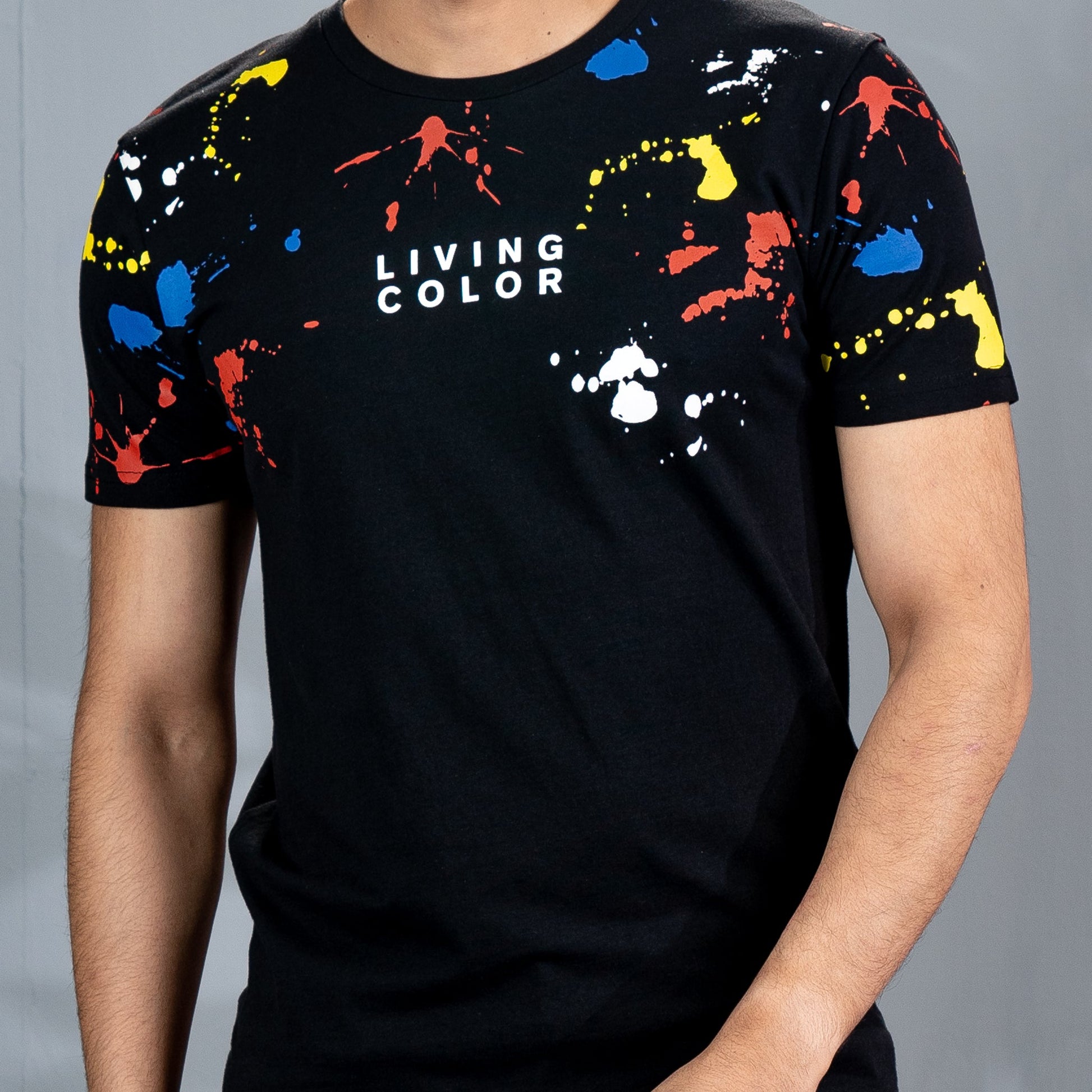 This men's slim fit T-shirt features an abstract colorful print with striking chest lettering, perfect for a bold, standout look. Crafted from 100% cotton, it ensures all-day comfort and breathability. The black fabric complements the vibrant design, making it an essential piece for casual wear. Ideal for expressing creativity and style.