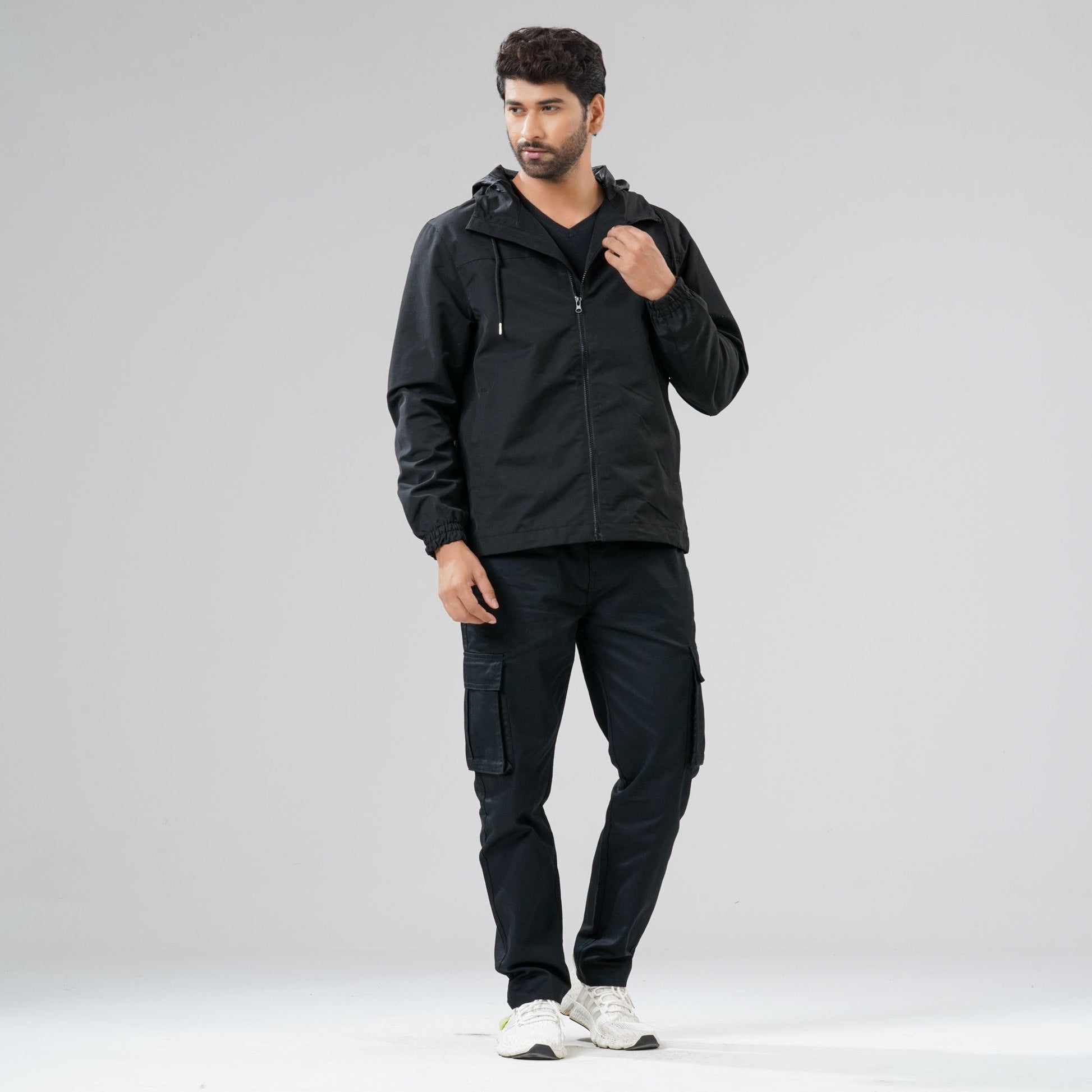 This men’s black windbreaker is made from 100% polyester, offering lightweight protection against wind and light rain. It features a zipper closure and a subtle “XII SQD” print on the left chest for a modern, sporty look. Perfect for casual wear or outdoor activities.