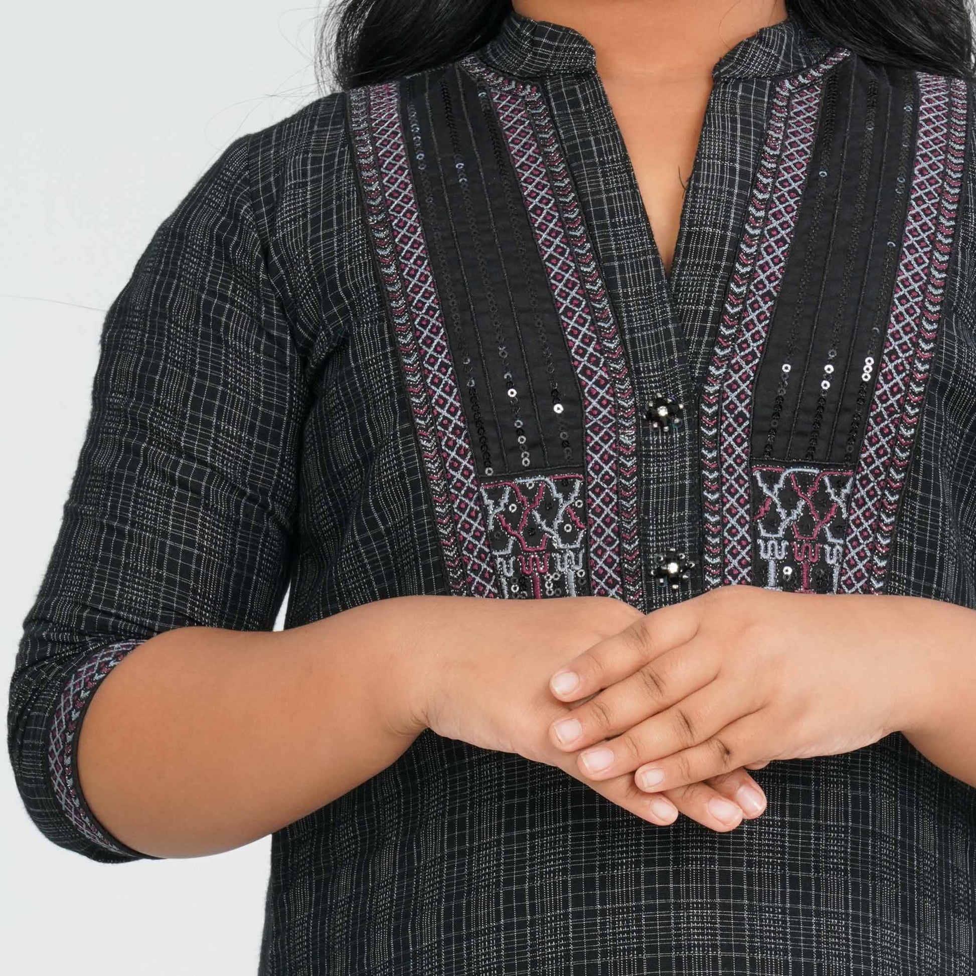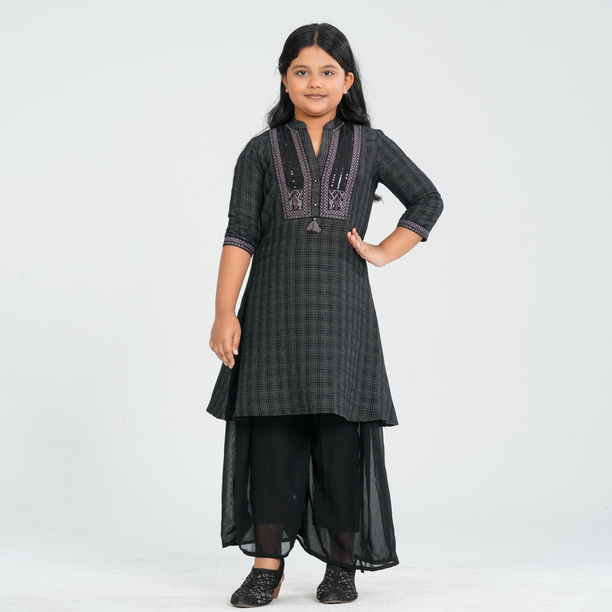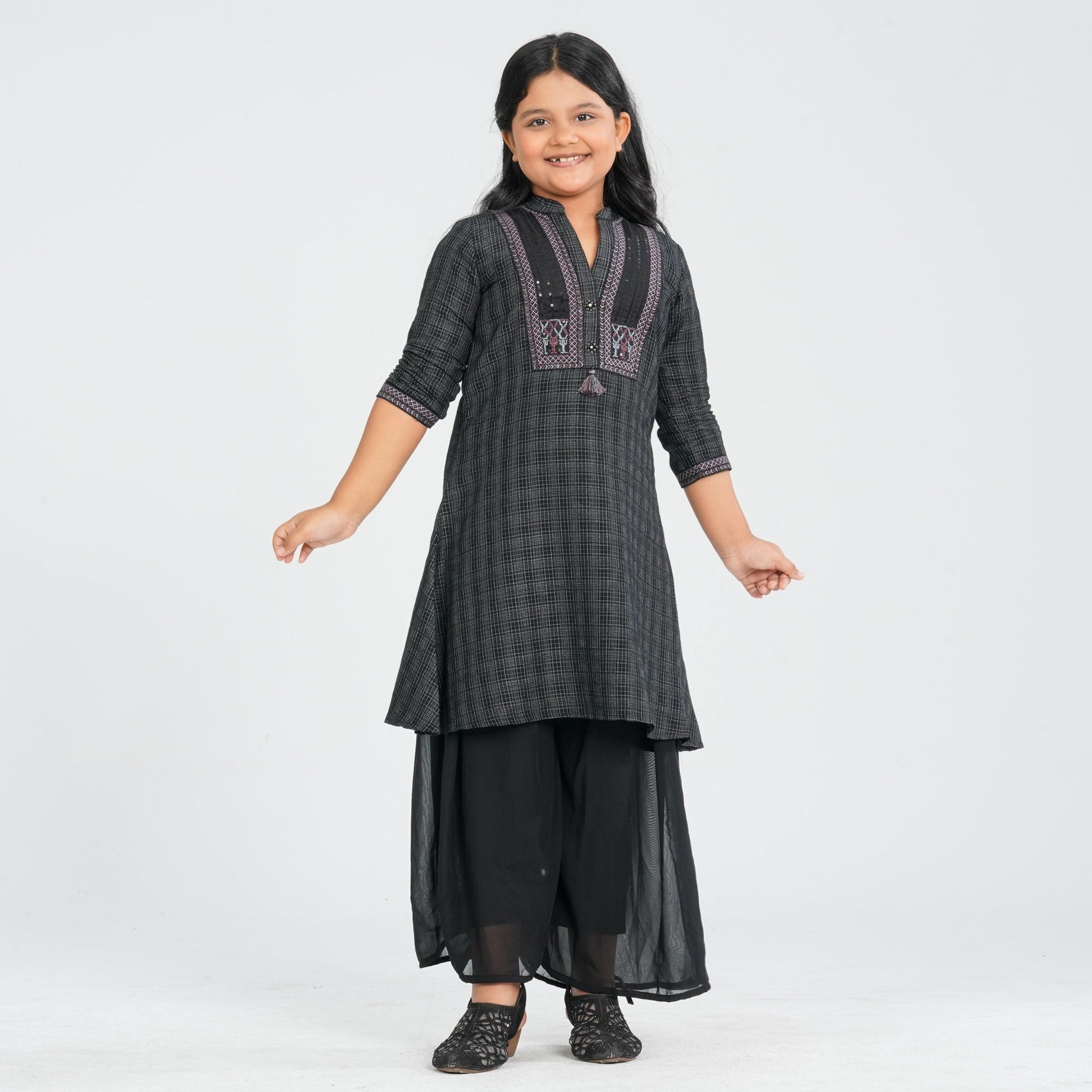 This girl’s cotton two-piece set combines comfort and style, featuring a mandarin collar ethnic kameez adorned with delicate sequin embroidery and decorative tassels. The kameez is paired with wide-leg cotton pants, offering a relaxed and comfortable regular fit. Perfect for festive occasions or casual gatherings, this set blends traditional elegance with modern design.