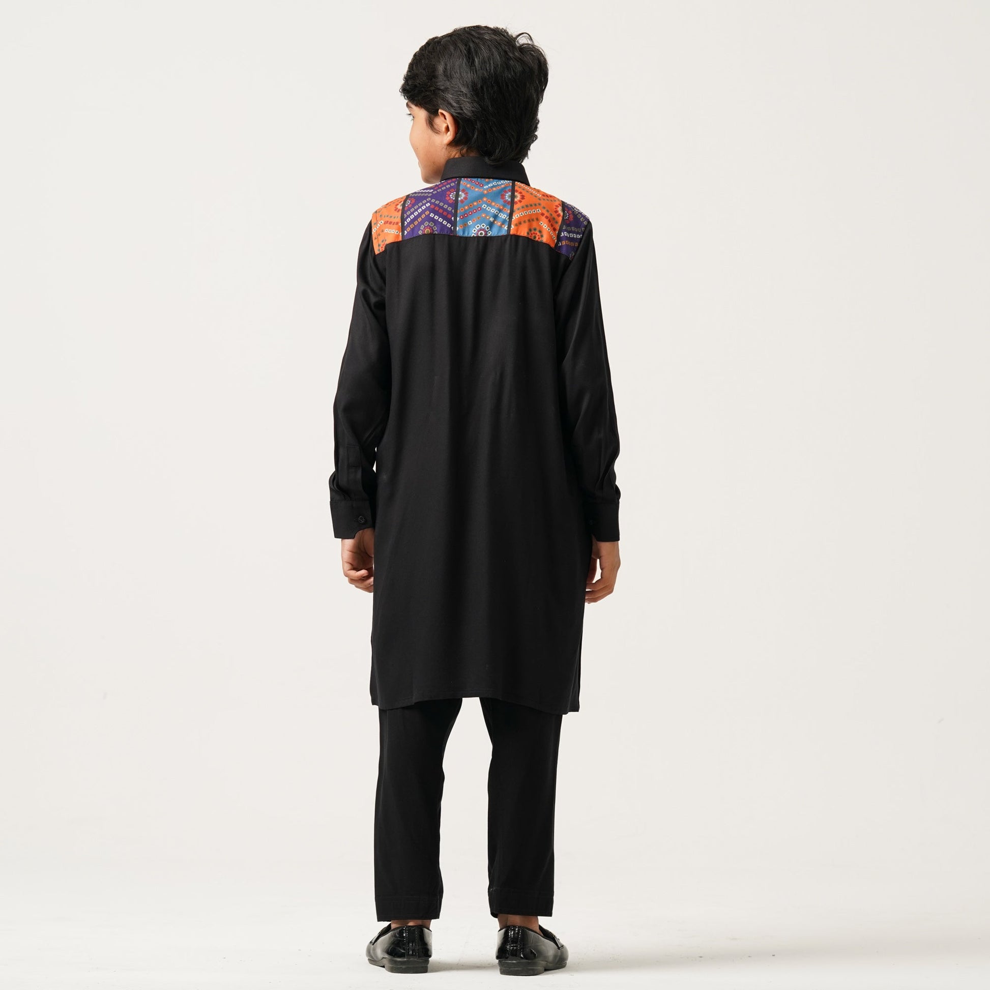 This stylish boys Kabli features a cut-and-sew design with a vibrant chunri print on the half body and pocket. Made from breathable linen fabric, it offers comfort and durability perfect for casual and festive wear.
