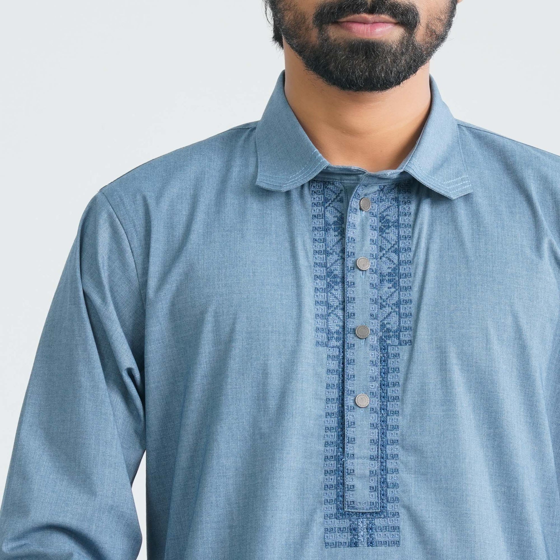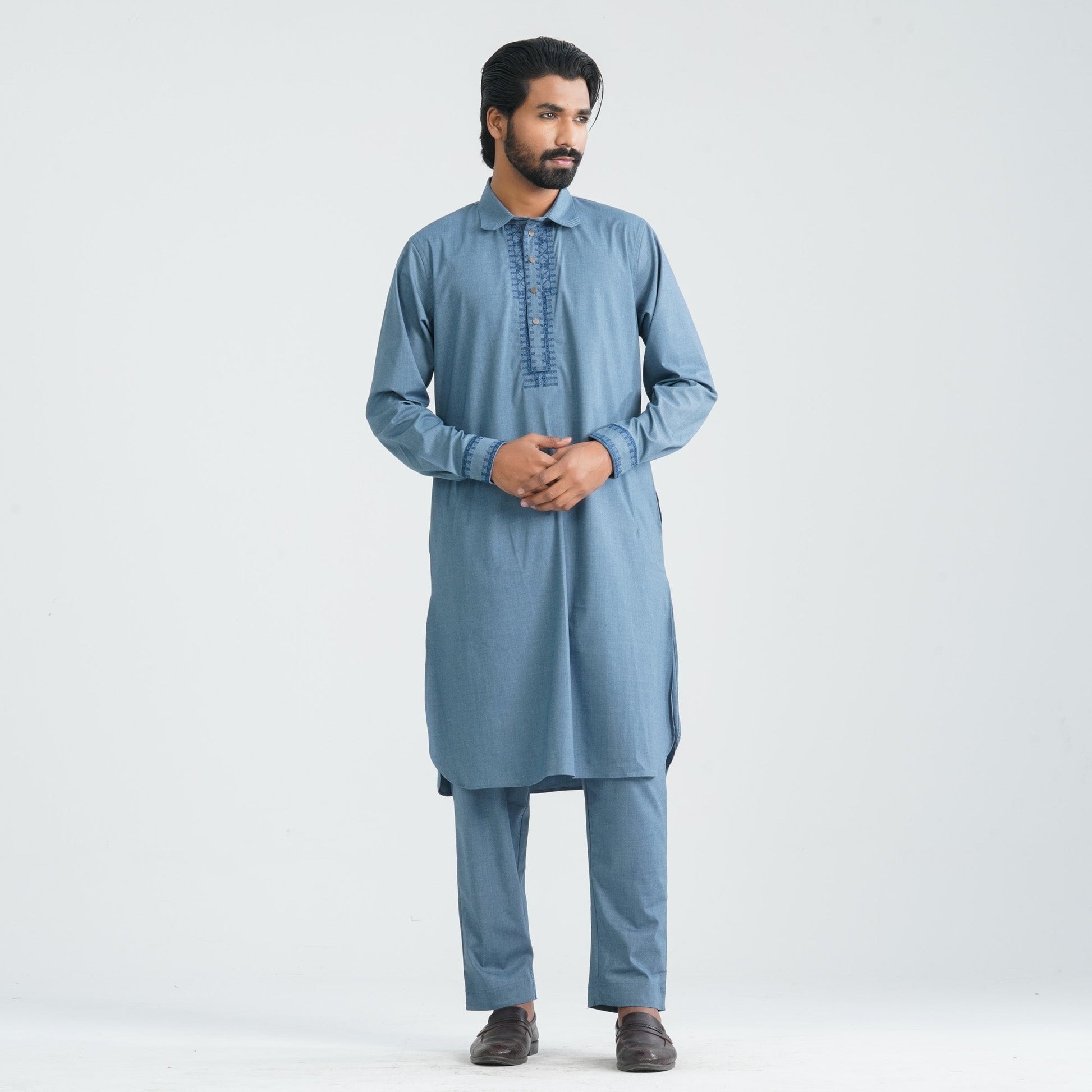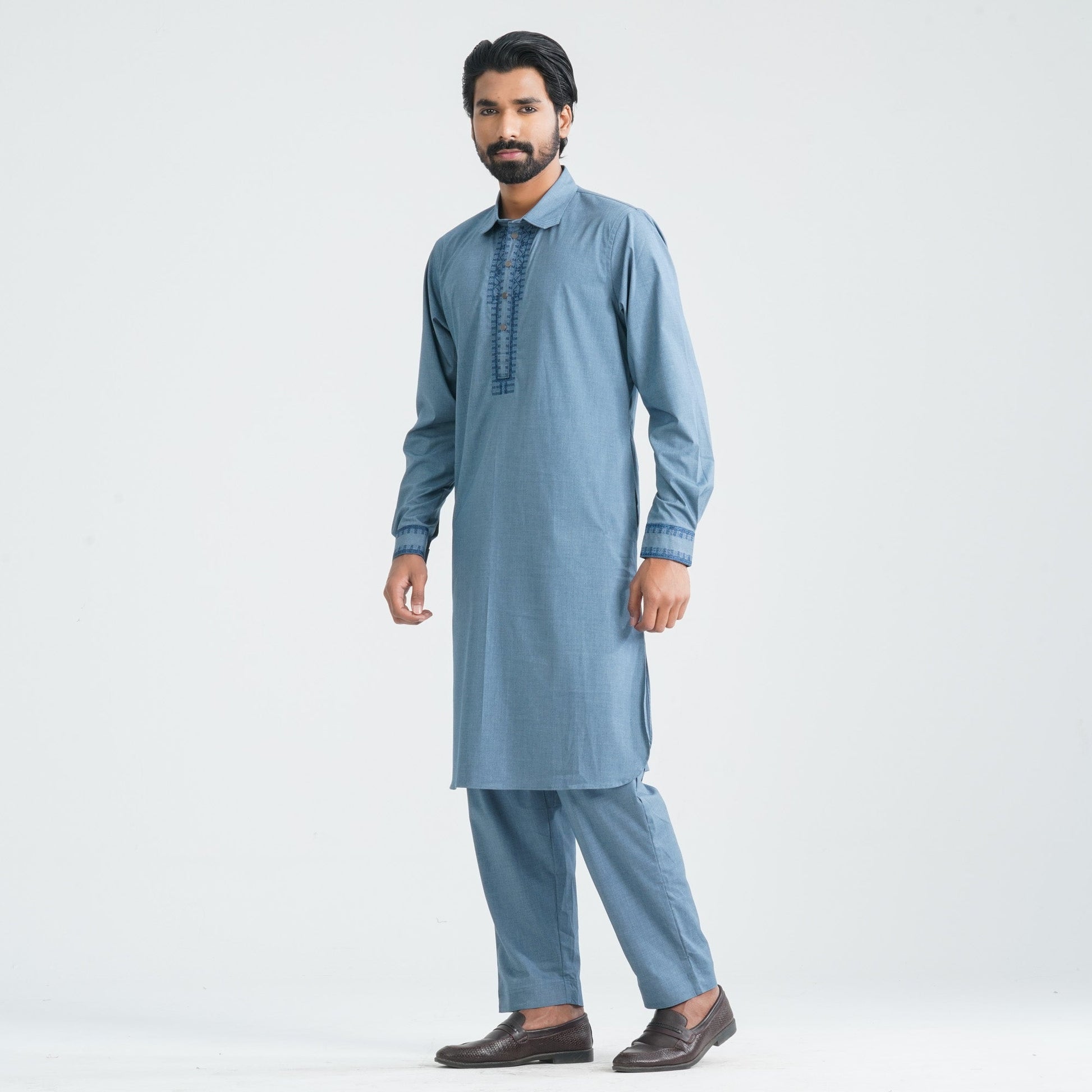This Kabli set is tailored from refined suiting fabric, featuring geometry-inspired embroidery that adds a subtle yet sophisticated touch. The minimal ethnic aesthetic makes it perfect for celebrations, cultural gatherings, and polished traditional styling.