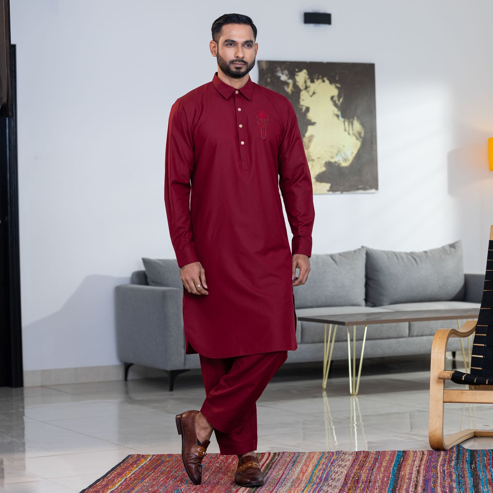 This Men's Maroon Karchupi Kabli Set features a shirt collar and intricate zardosi embroidery on one side of the chest. Crafted from soft cotton fabric with a regular fit, it combines traditional design with modern comfort. The metal shank buttons add a touch of sophistication, while the rich maroon color enhances its elegance, making it perfect for special occasions and cultural events.