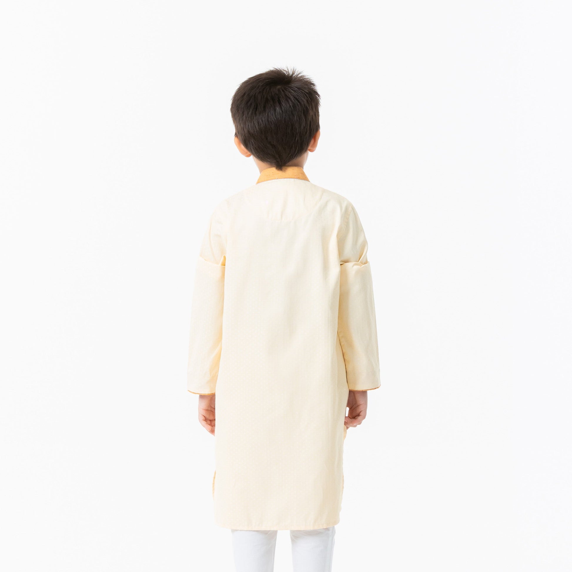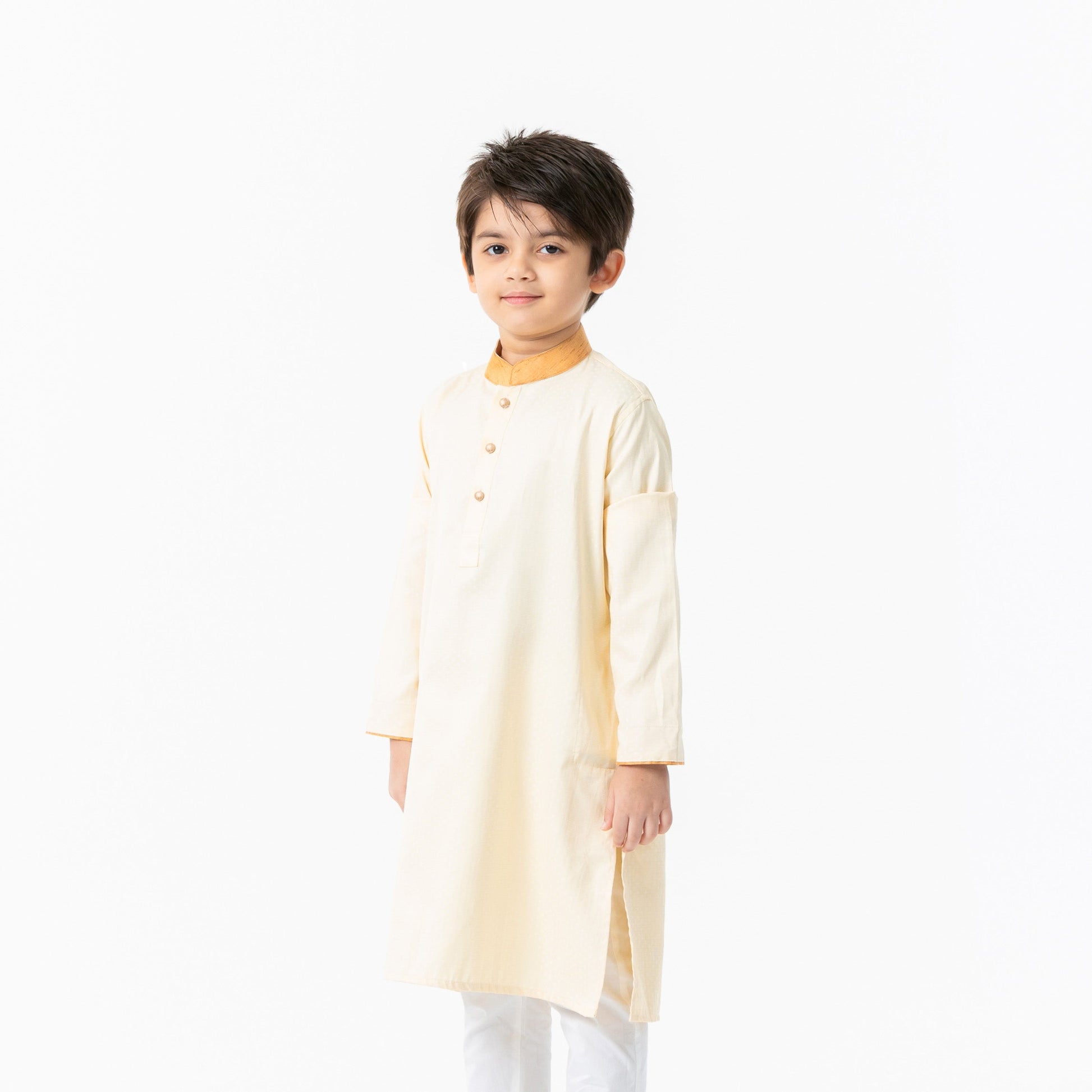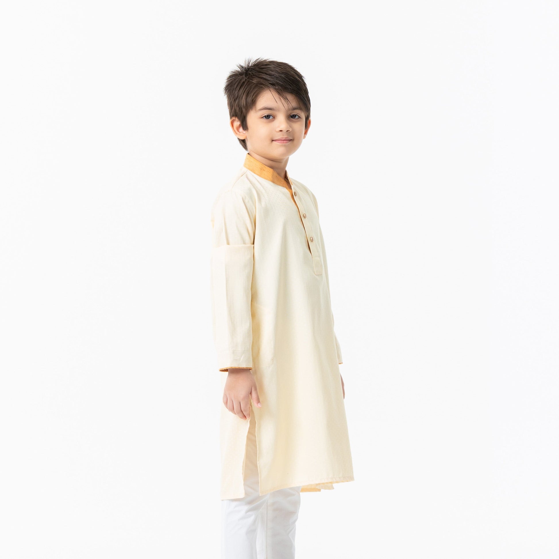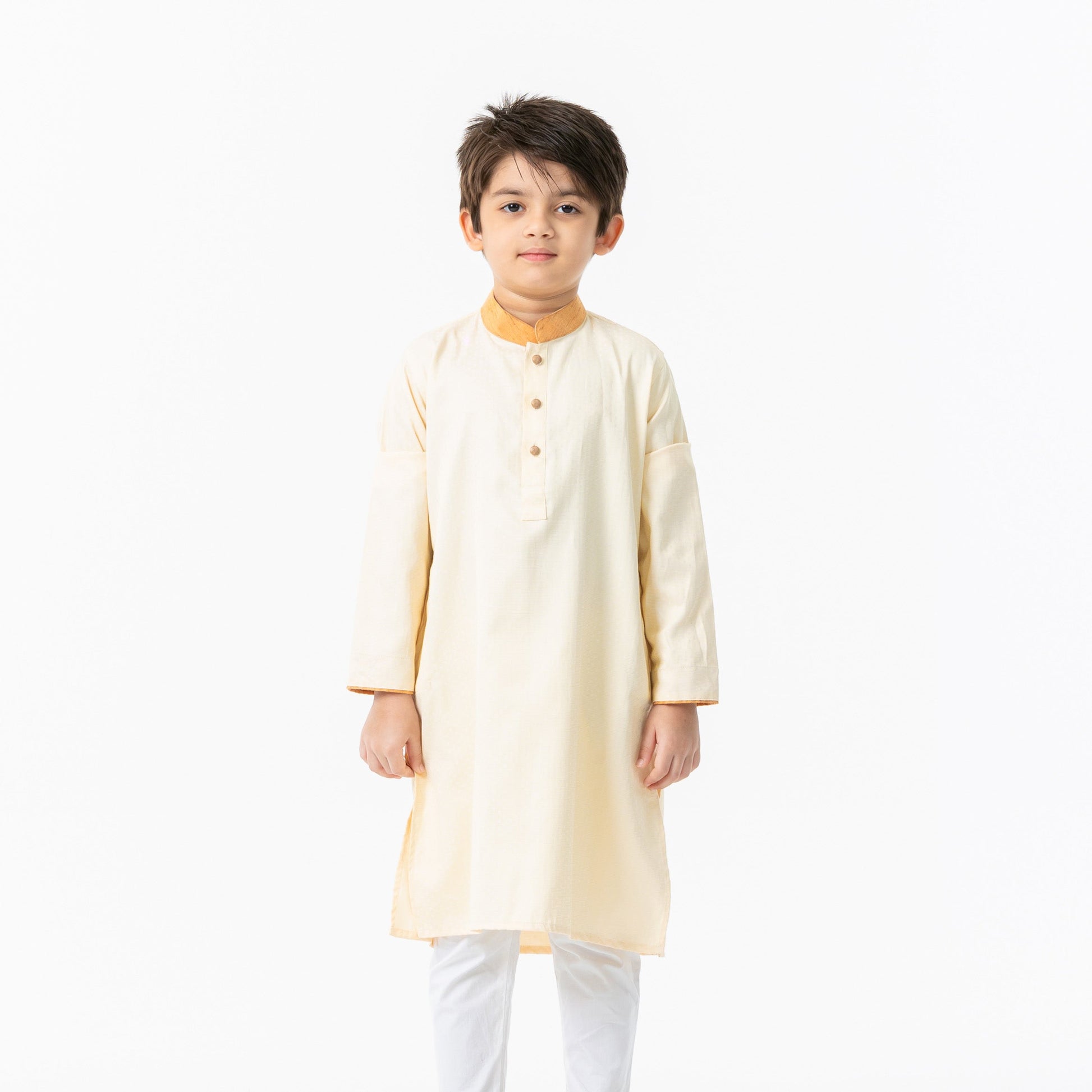 This soft beige boys Panjabi features contrast detailing on the collar, inner placket, and sleeve openings for a stylish look. Embellished with decorative metal buttons, it adds a refined touch to traditional attire. Crafted from cotton jacquard fabric, the slim fit ensures comfort and a modern silhouette, perfect for festive occasions.