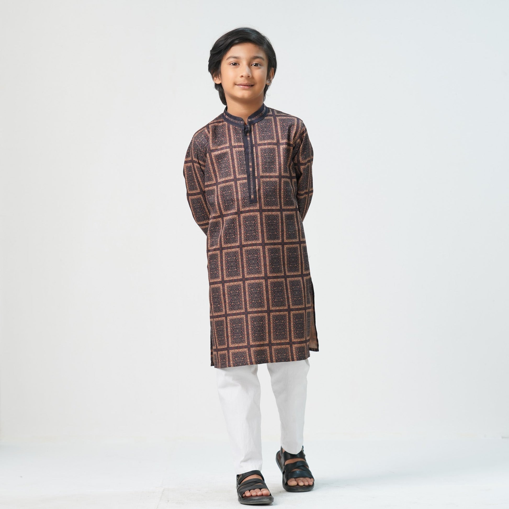 This boys' basic Panjabi features a stylish contrast design with intricate digital prints and fabric manipulation for a modern touch. Crafted from premium Torray fabric, it ensures comfort and durability, making it perfect for both casual and festive occasions.