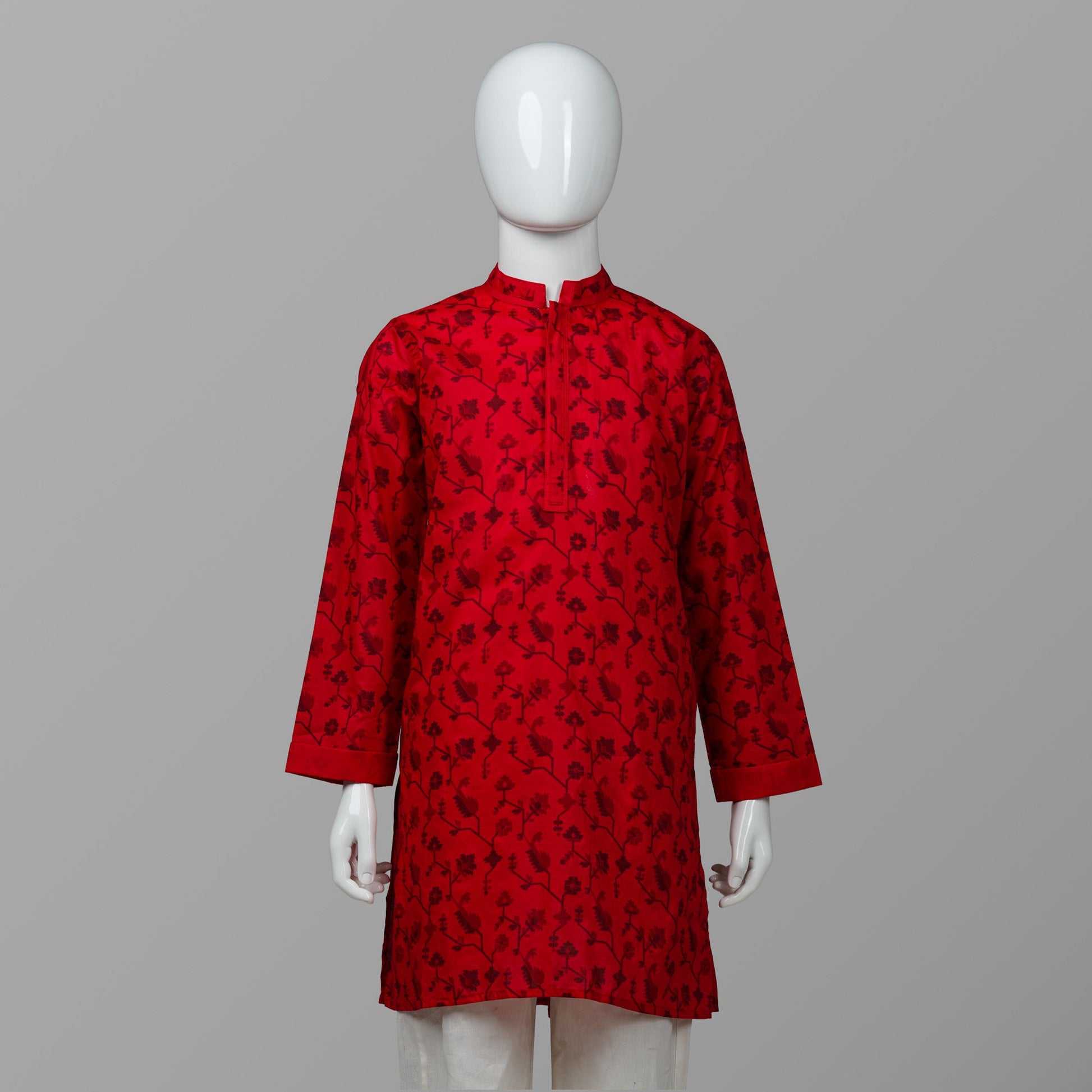 Bright red boys panjabi crafted from soft cotton fabric for comfort and breathability. Features a traditional jamdani-inspired screen print, finished with a decorative metal button for added charm. Perfect for festive occasions, cultural events, or family gatherings.