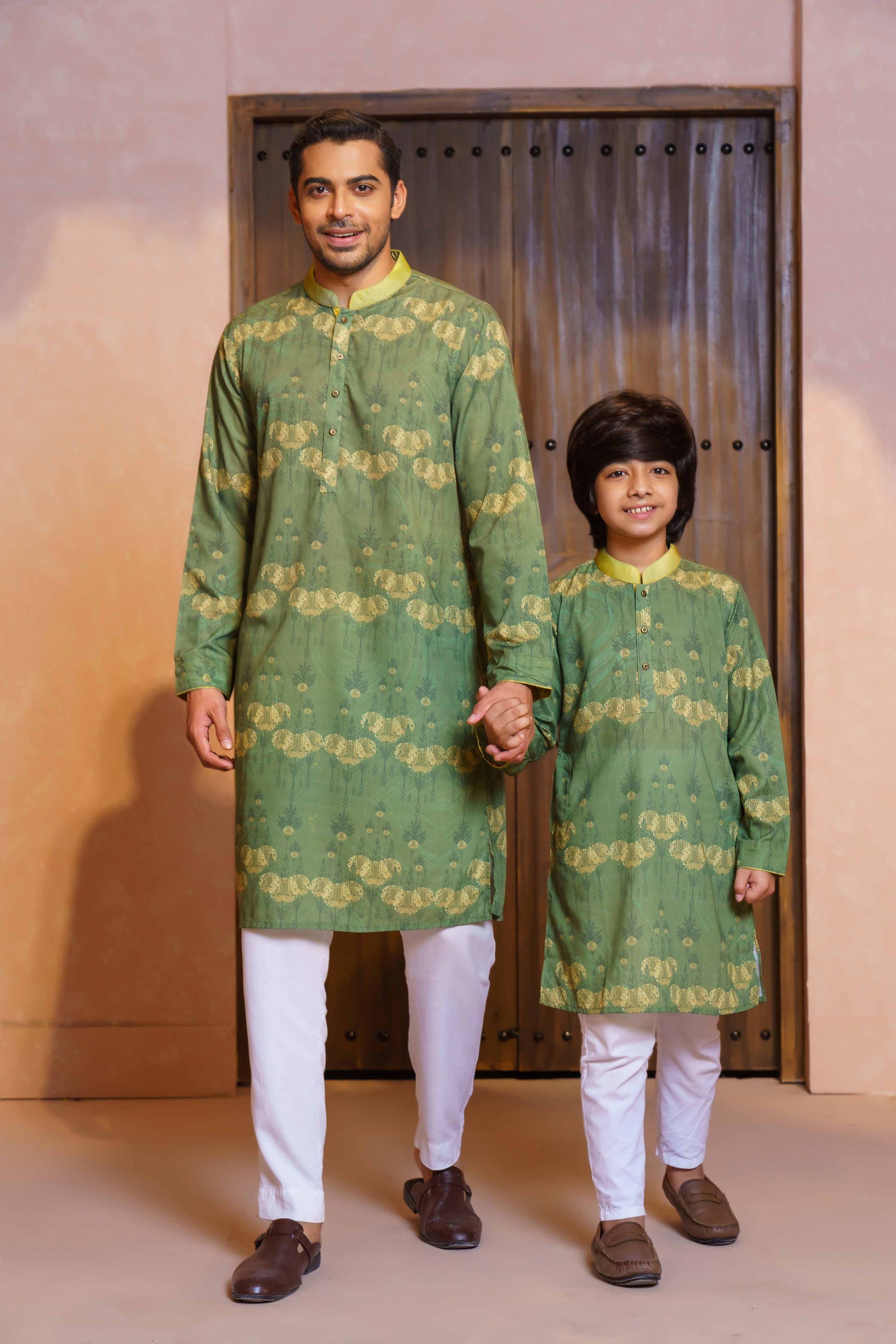 This men's basic panjabi is the perfect way to bring a summery, cheerful vibe to your wardrobe. Featuring a digital print and a contrasting collar for a subtle hint of color, this panjabi is incredibly comfortable and great for any occasion.
