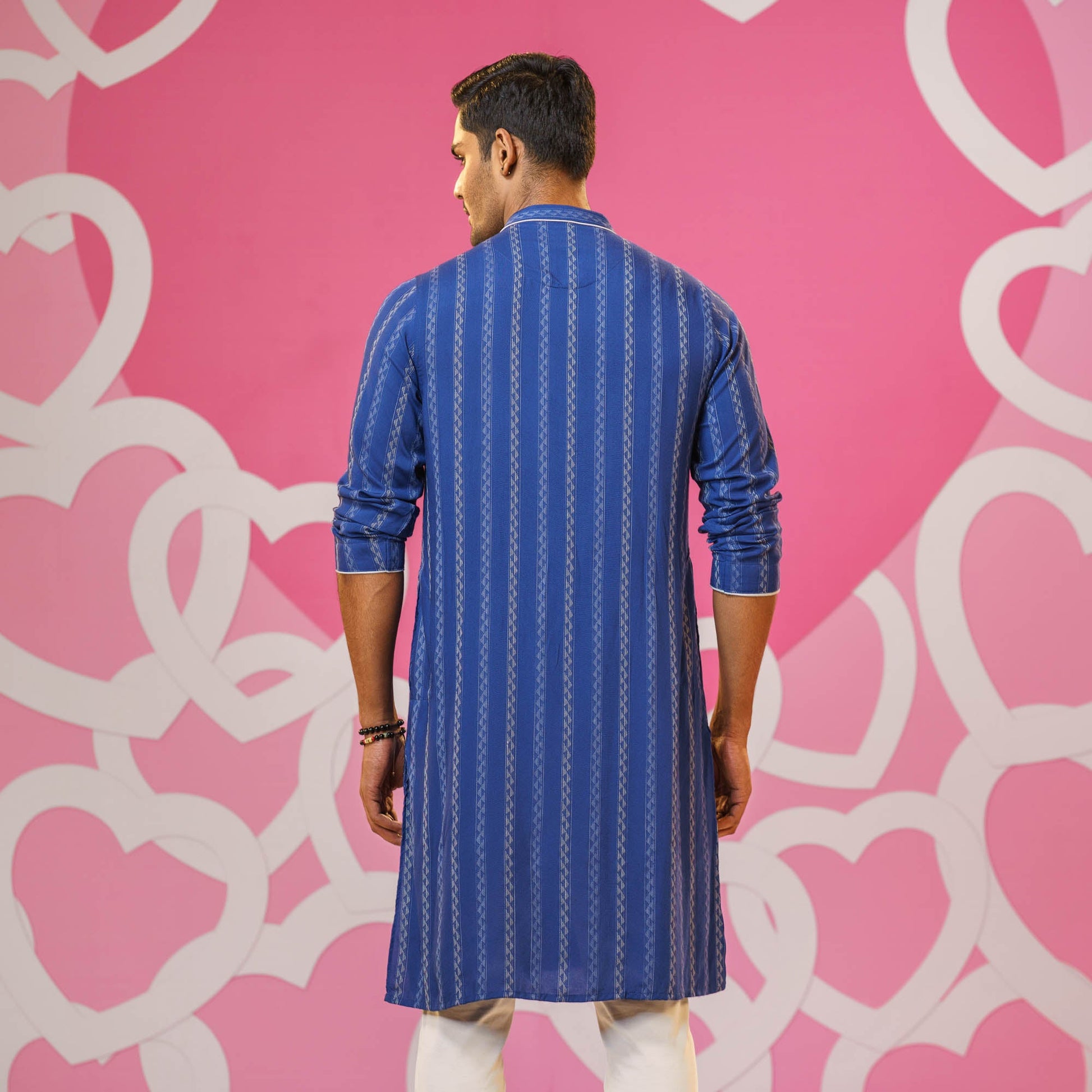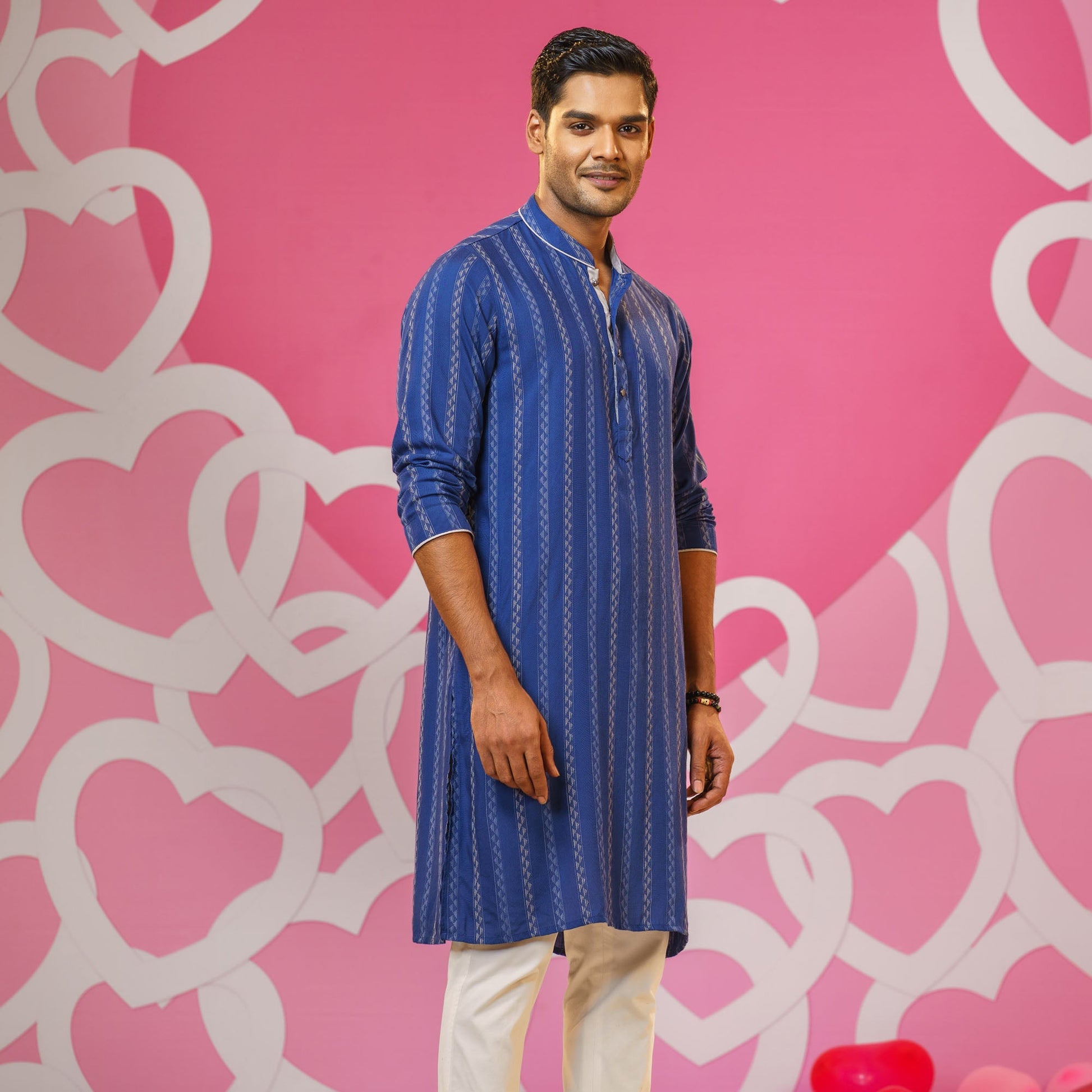 This men's blue panjabi is made from premium linen, featuring a contrast placket and metal shank buttons. The regular fit provides comfort and a refined look. Perfect for both formal events and casual gatherings, this Panjabi adds a sophisticated touch to your wardrobe.
