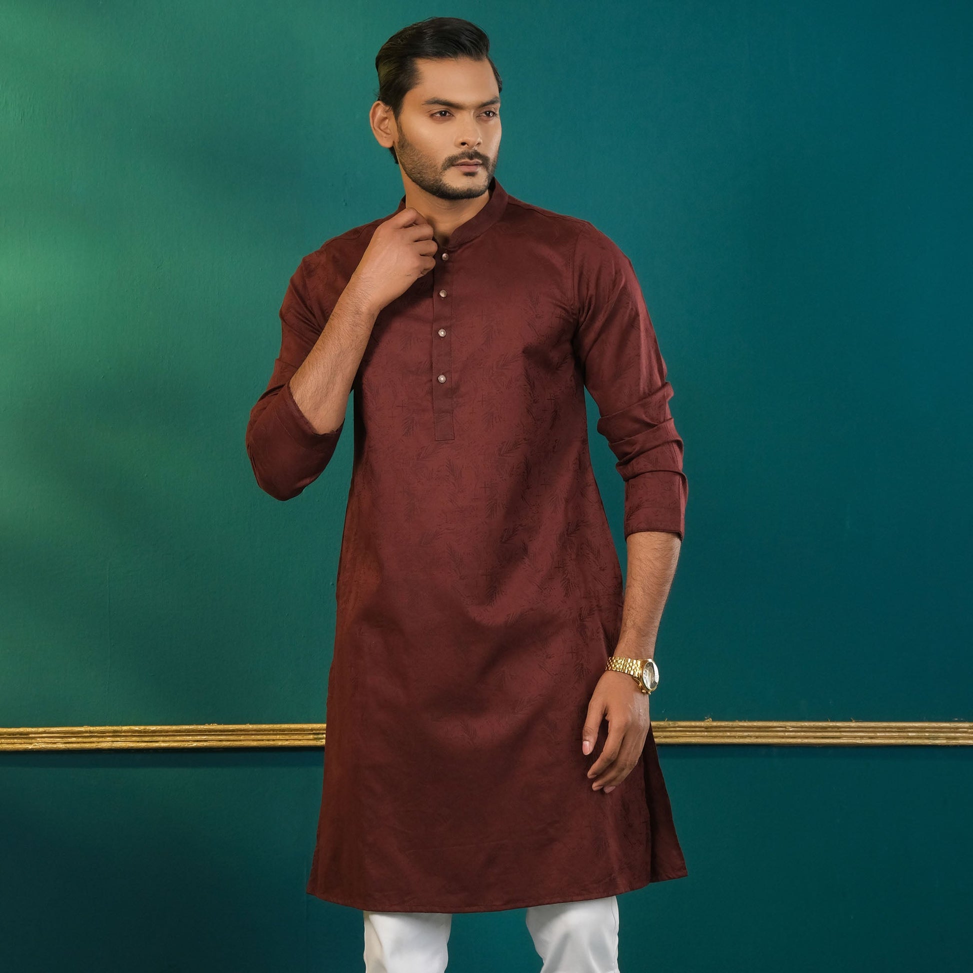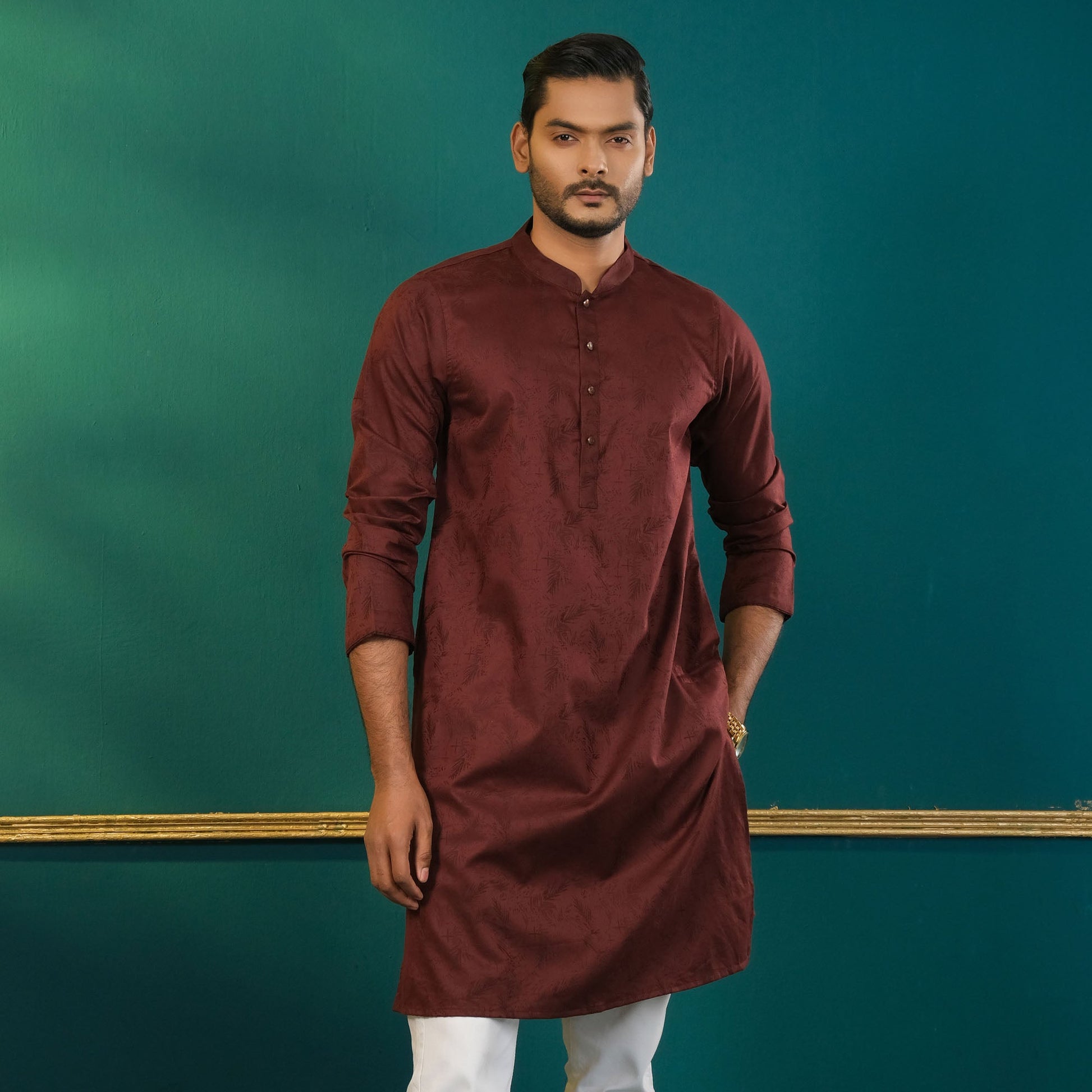This men's deep purple Panjabi is crafted from linen jacquard fabric for a luxurious feel. It features metal shank buttons and a regular fit, combining traditional style with modern elegance. Ideal for formal or festive occasions, this Panjabi adds a touch of sophistication to any wardrobe.