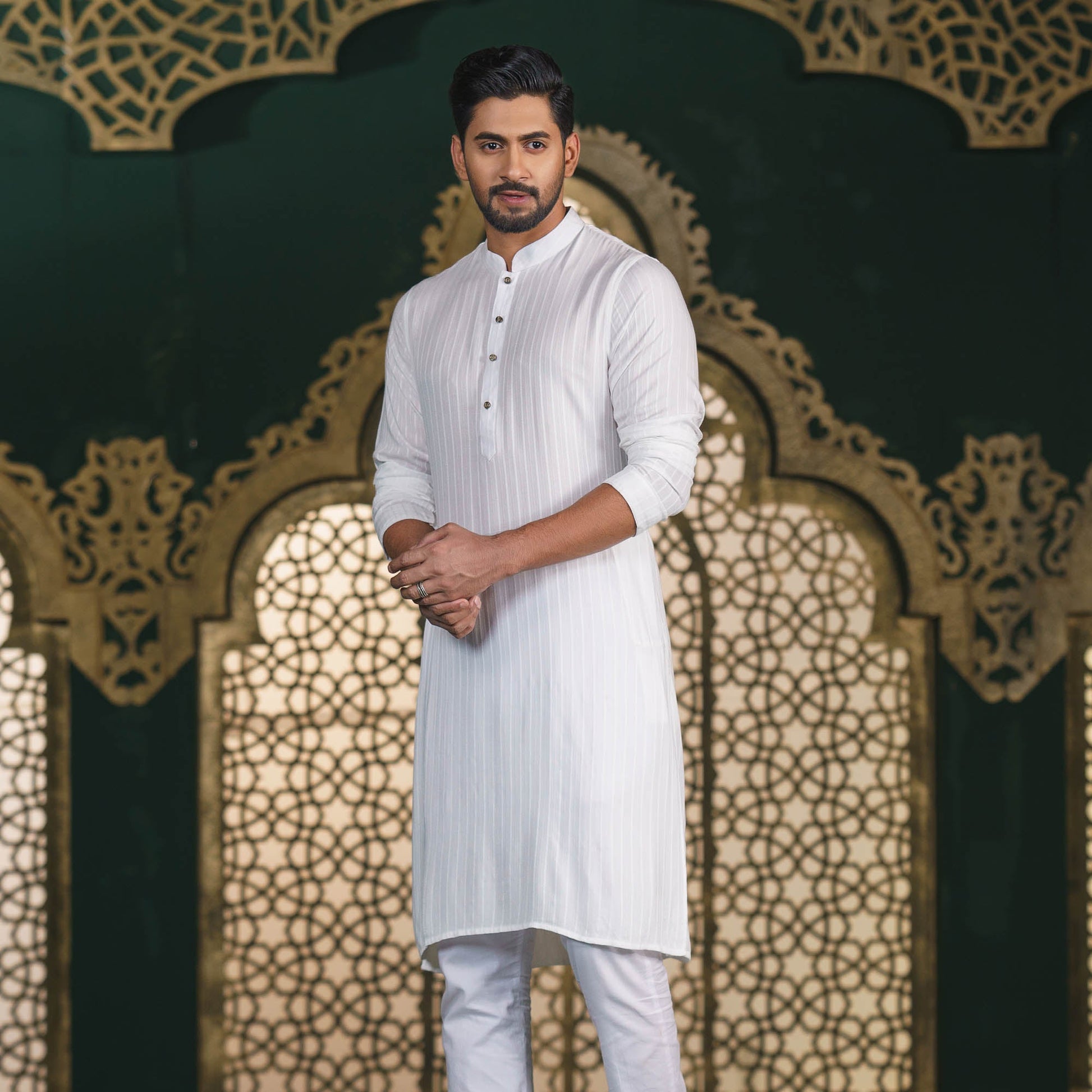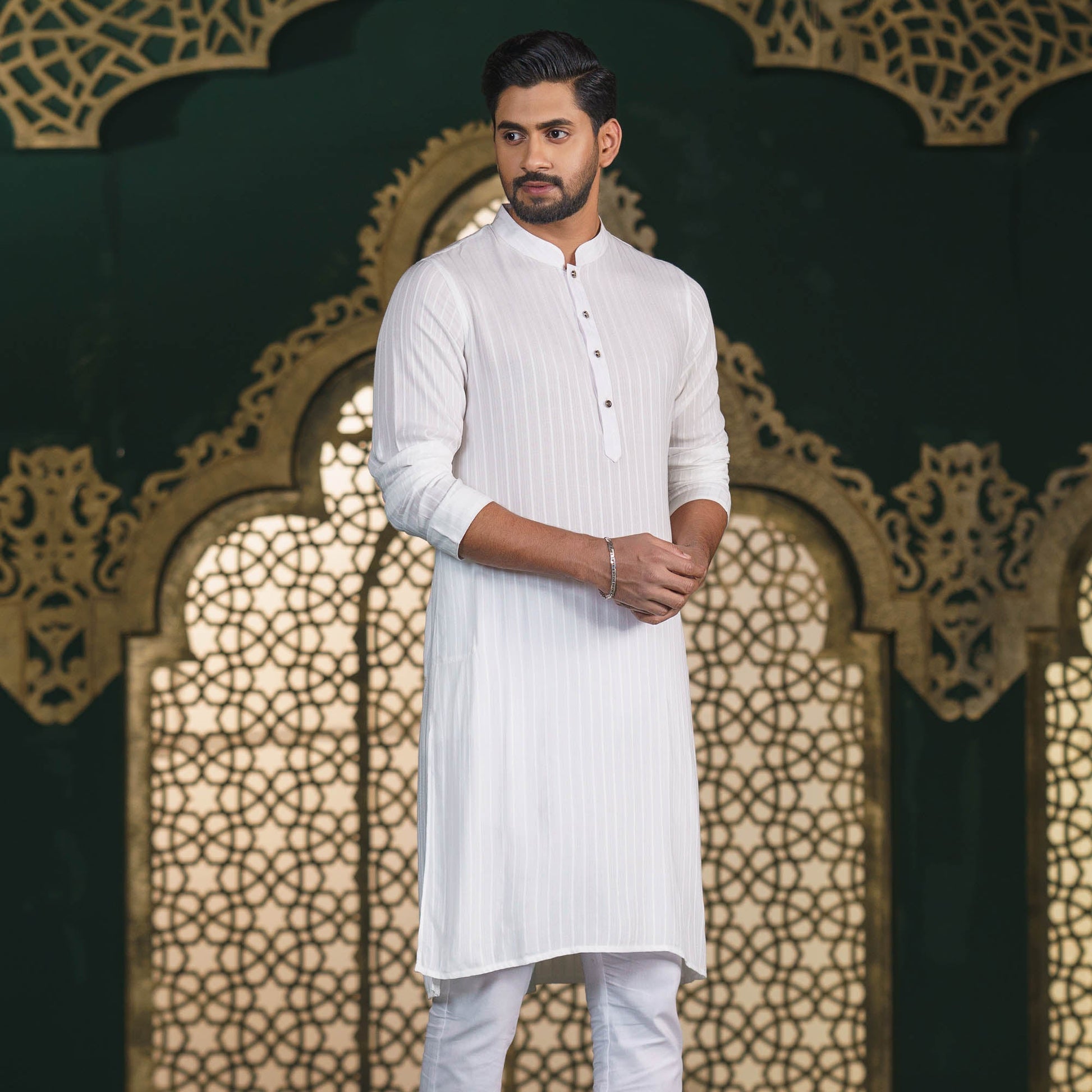 This men's white Panjabi is made from soft cotton and features a clean, minimalist design accented by metal shank buttons. The regular fit ensures comfort, while the mandarin collar adds a timeless, classic appeal. Ideal for both casual wear and festive occasions, it’s a versatile choice for men who appreciate simplicity and elegance in their ethnic wardrobe.