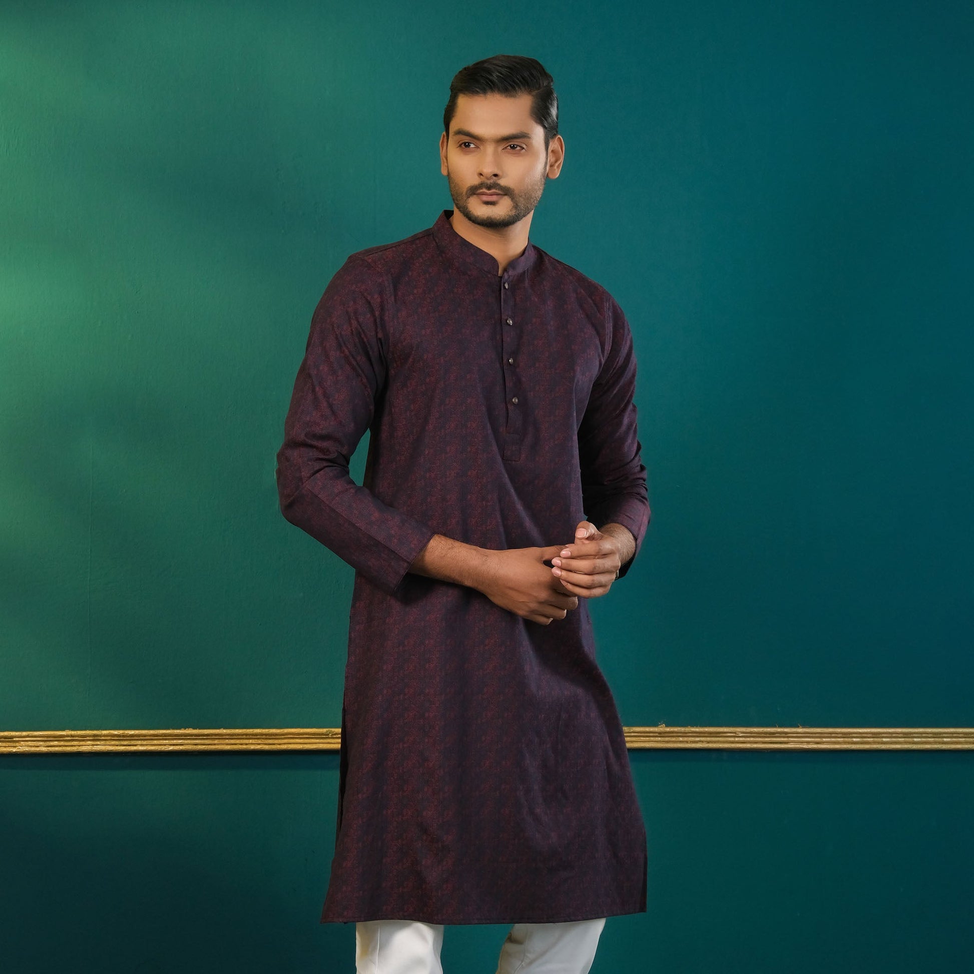 This men’s purple basic Panjabi features metal shank buttons and is crafted from elegant jacquard fabric. It offers a regular fit, combining classic style with a touch of sophistication for traditional and formal occasions.