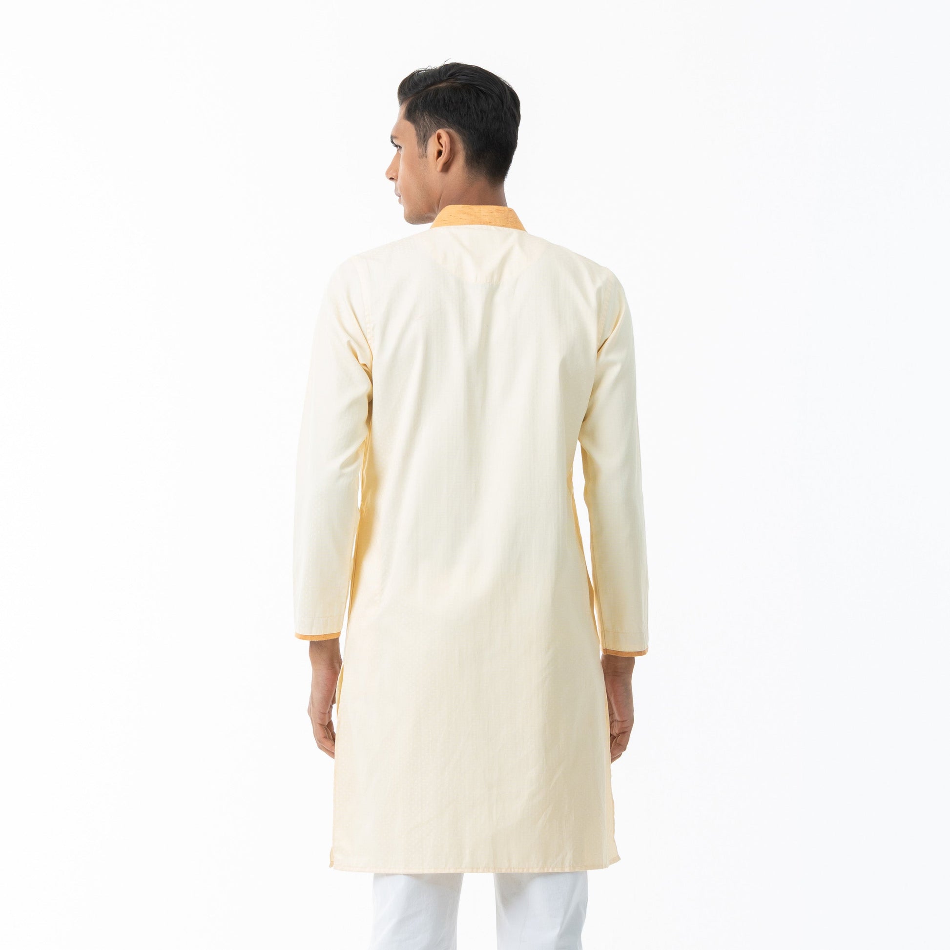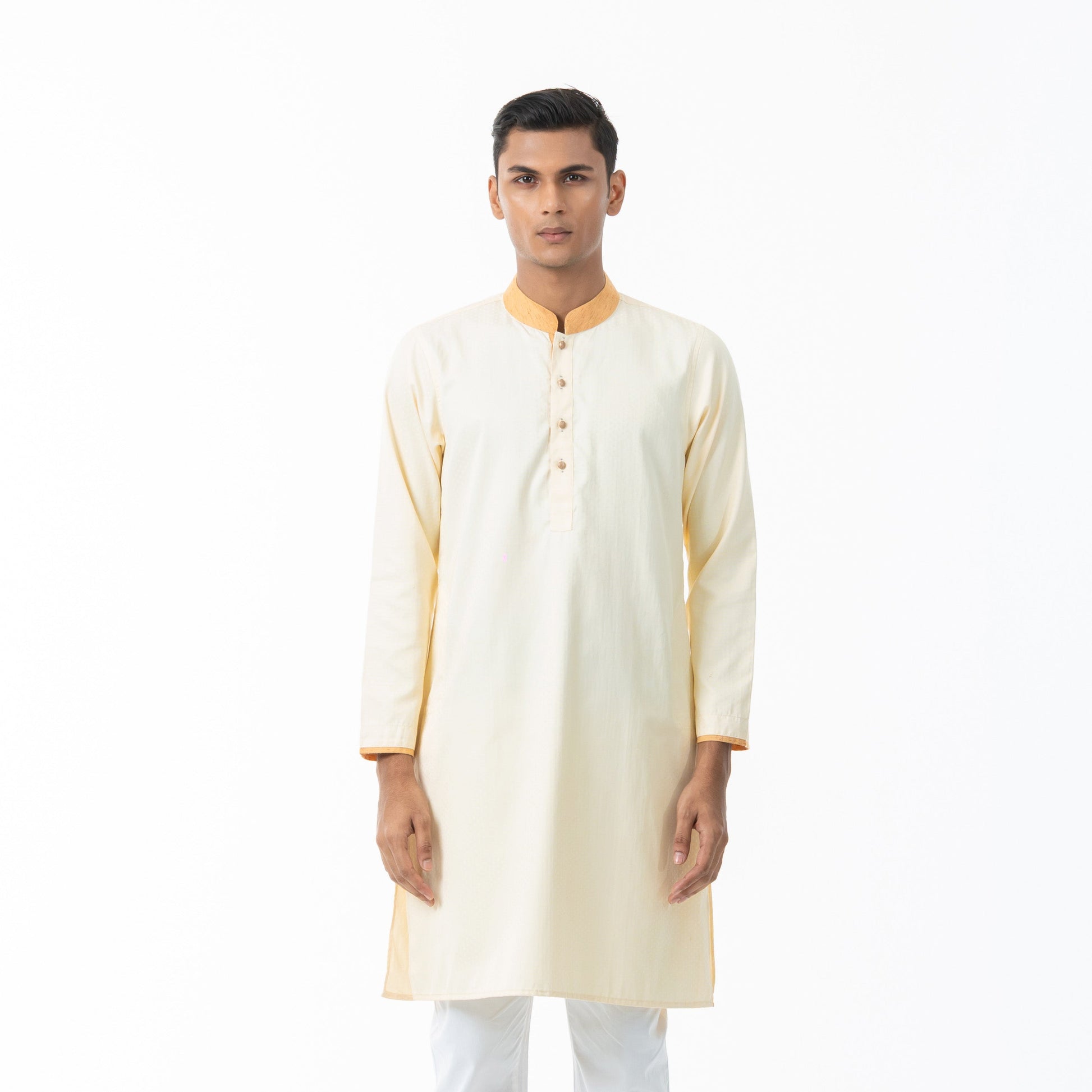 This soft beige panjabi, made from elegant silk jacquard fabric, features subtle contrast detailing on the collar, inner placket, and sleeve openings. Embellished with decorative metal buttons, it brings a touch of sophistication to any outfit. Designed with a regular fit, it offers both comfort and style, making it a perfect choice for cultural events and celebrations.