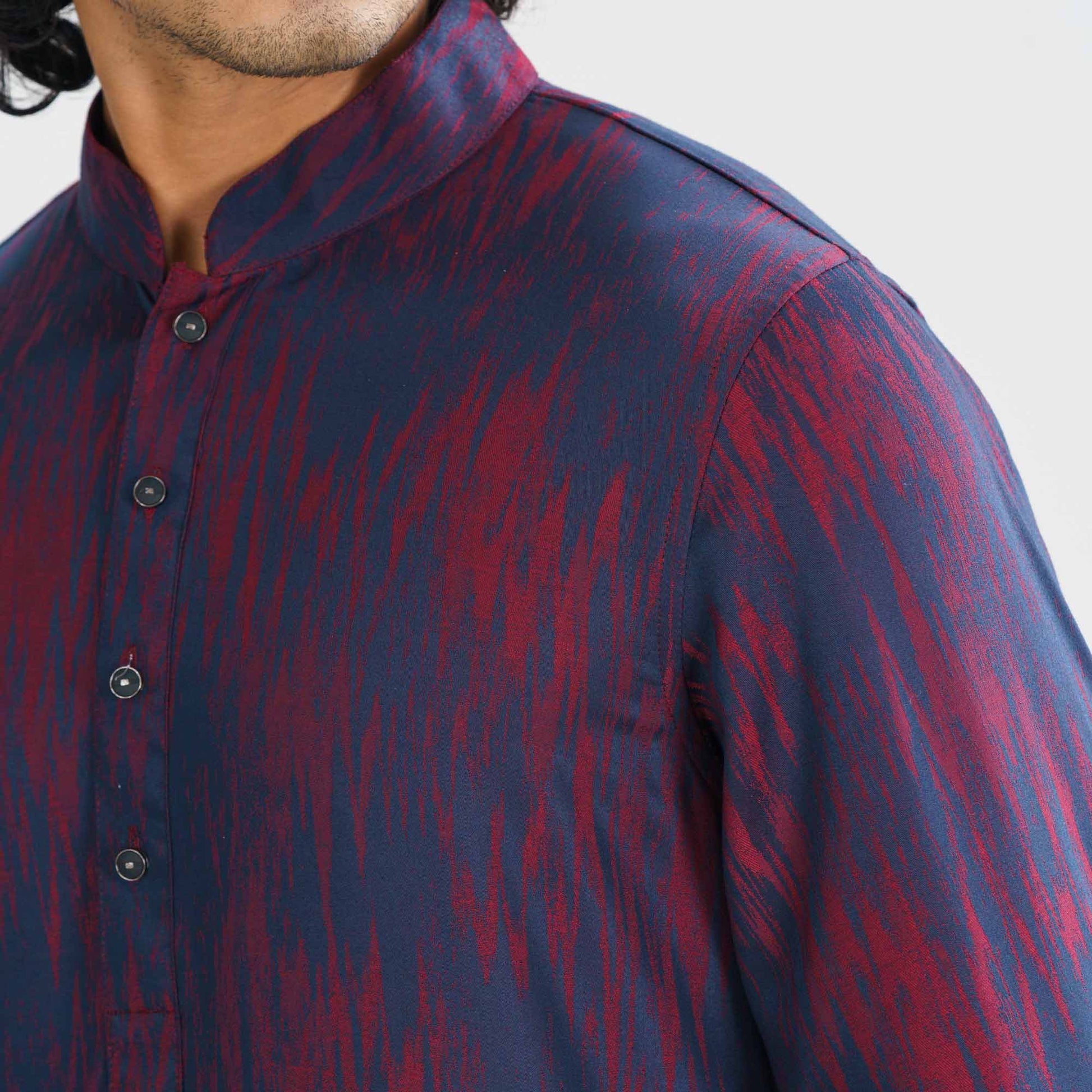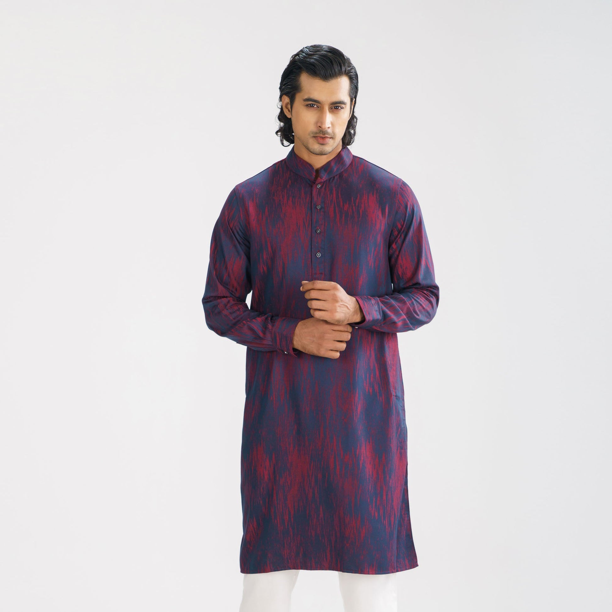 This maroon basic panjabi features a premium cut collar, detailed placket, and cuff design, crafted from cotton-based jacquard fabric. Offering a comfortable fit, it combines traditional style with a modern touch, making it perfect for festive occasions or casual gatherings. A versatile addition to any ethnic wardrobe.