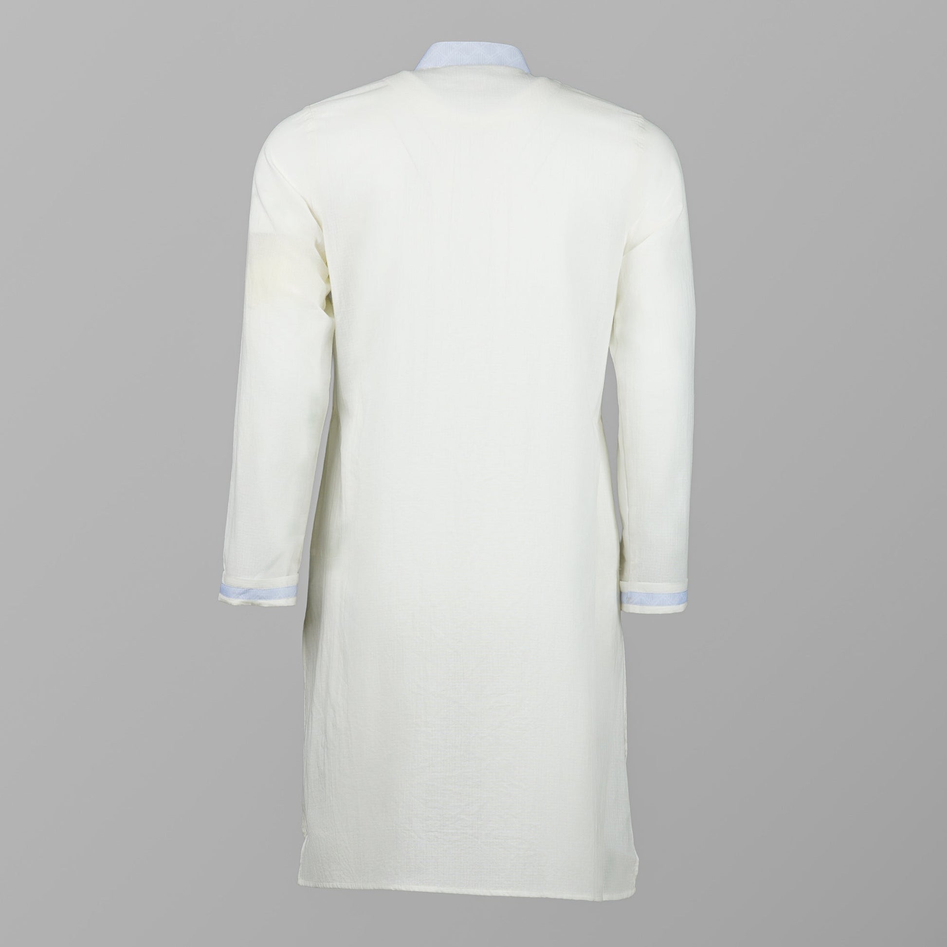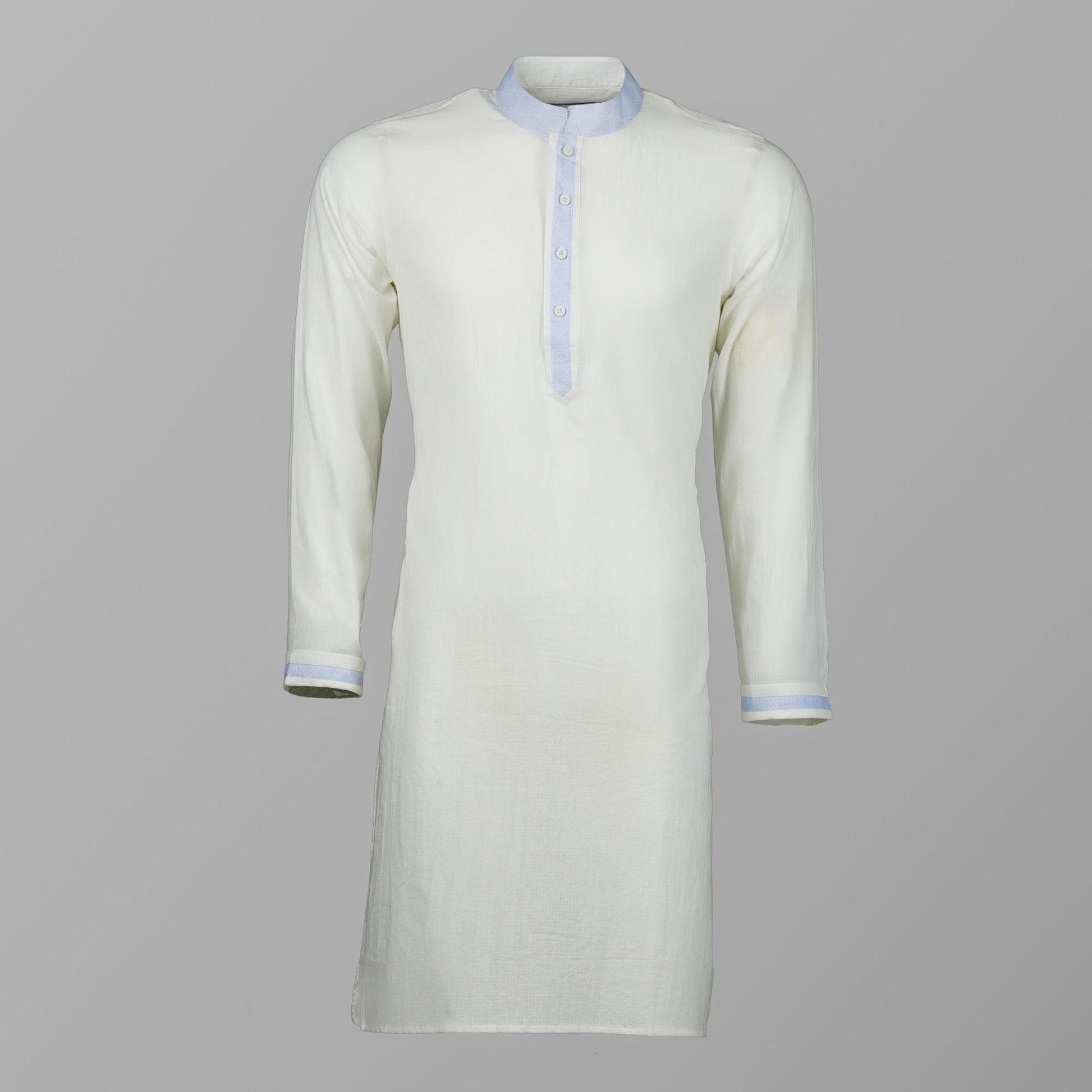 Elevate your traditional wardrobe with our white slim-fit Panjabi. Made from a comfortable cotton fabric, this Panjabi is designed for a modern and sleek look. The elegant sky-blue contrasting collar and cuffs add a touch of unique style, making it a perfect choice for any occasion.