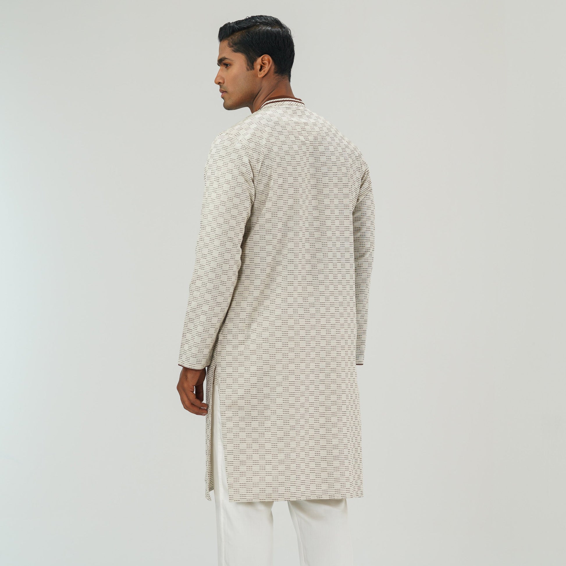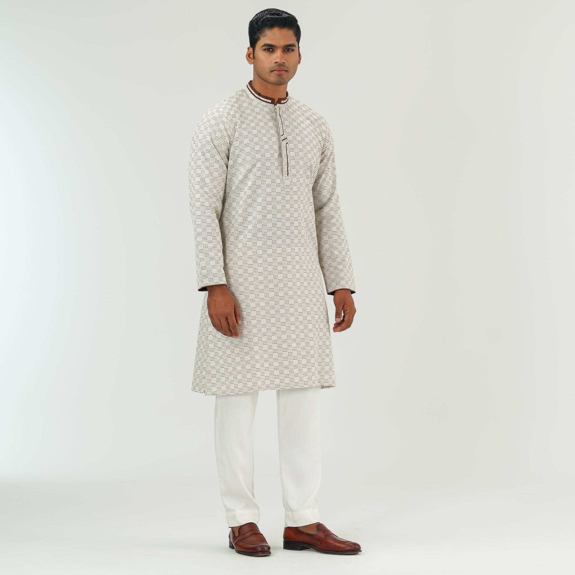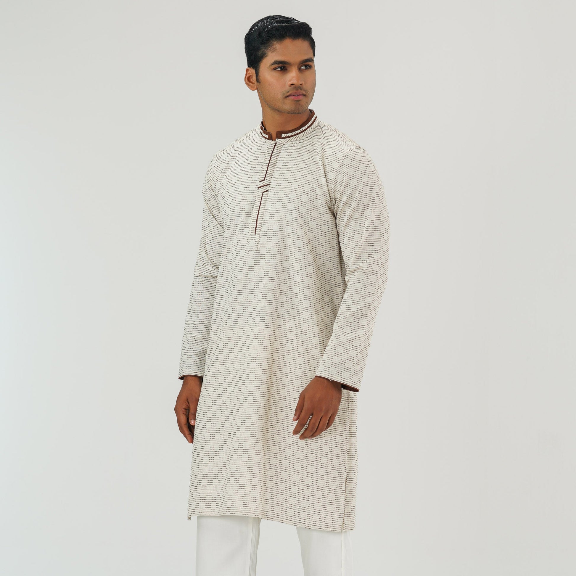 This stylish cream slim-fit panjabi is crafted from a comfortable blended fabric, featuring contrast detailing and unique fabric manipulation for a modern touch. The tailored fit enhances the silhouette, making it perfect for festive and semi-formal occasions.