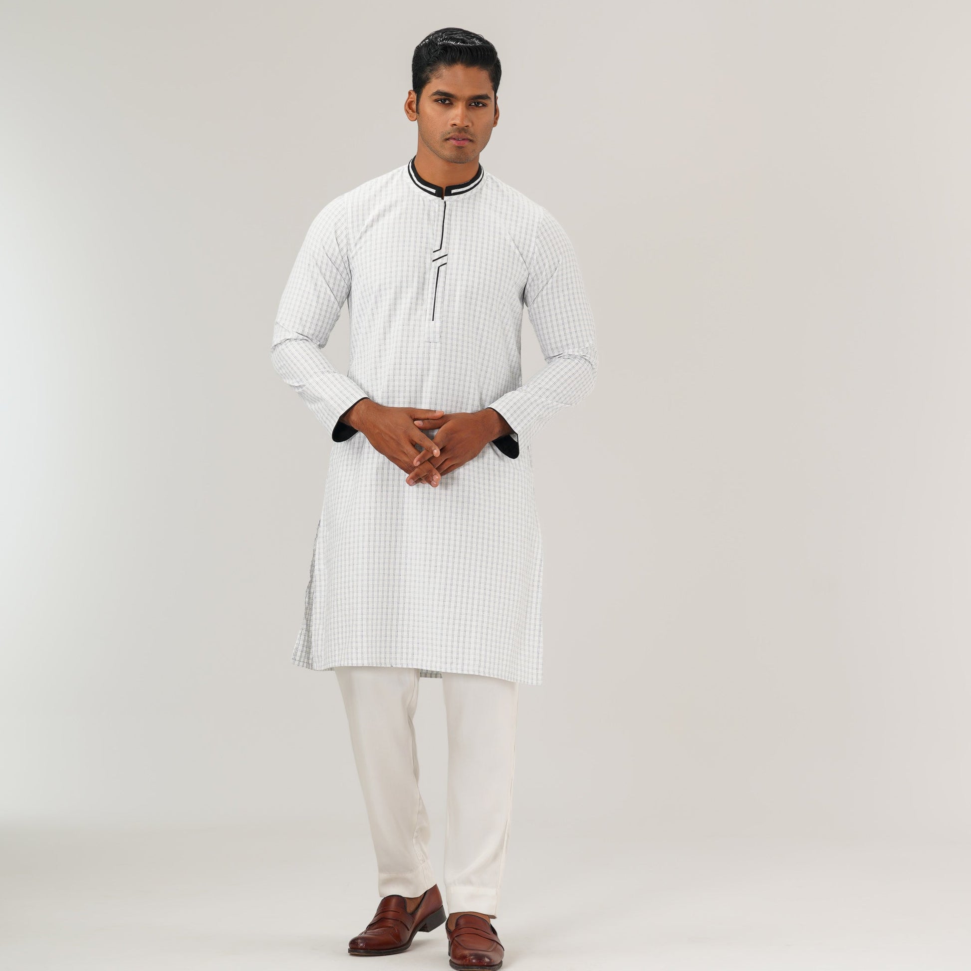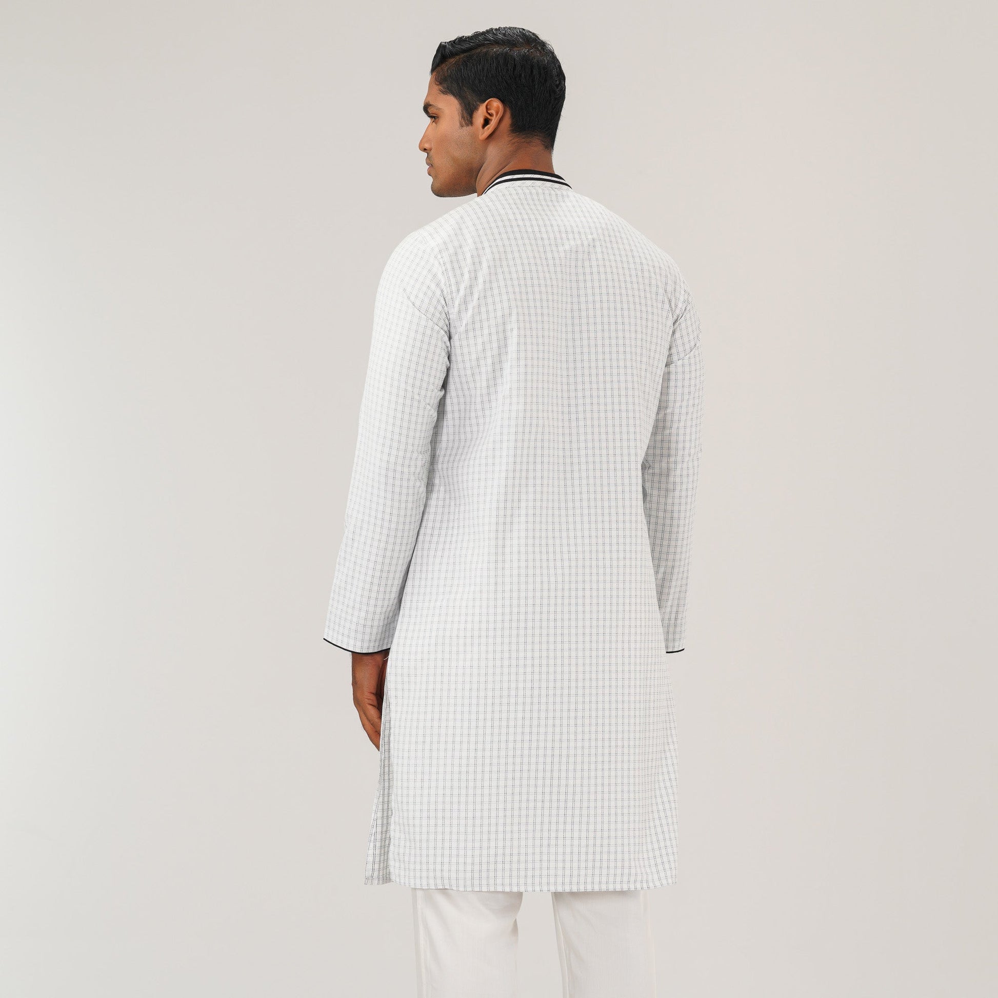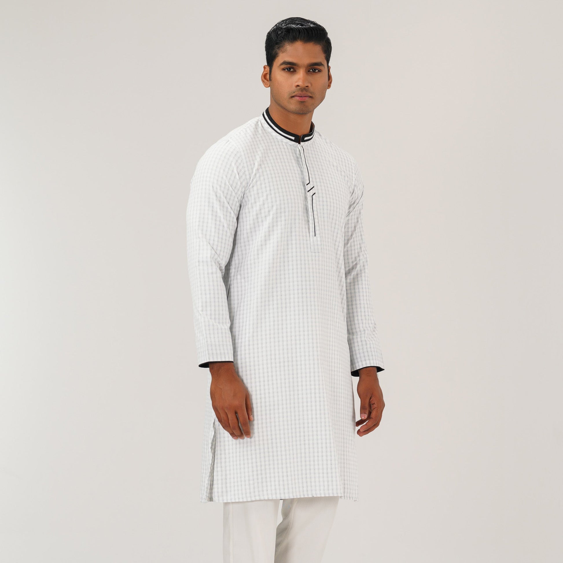 This stylish white slim-fit panjabi is crafted from a comfortable blended fabric, featuring contrast detailing and unique fabric manipulation for a modern touch. The tailored fit enhances the silhouette, making it perfect for festive and semi-formal occasions.