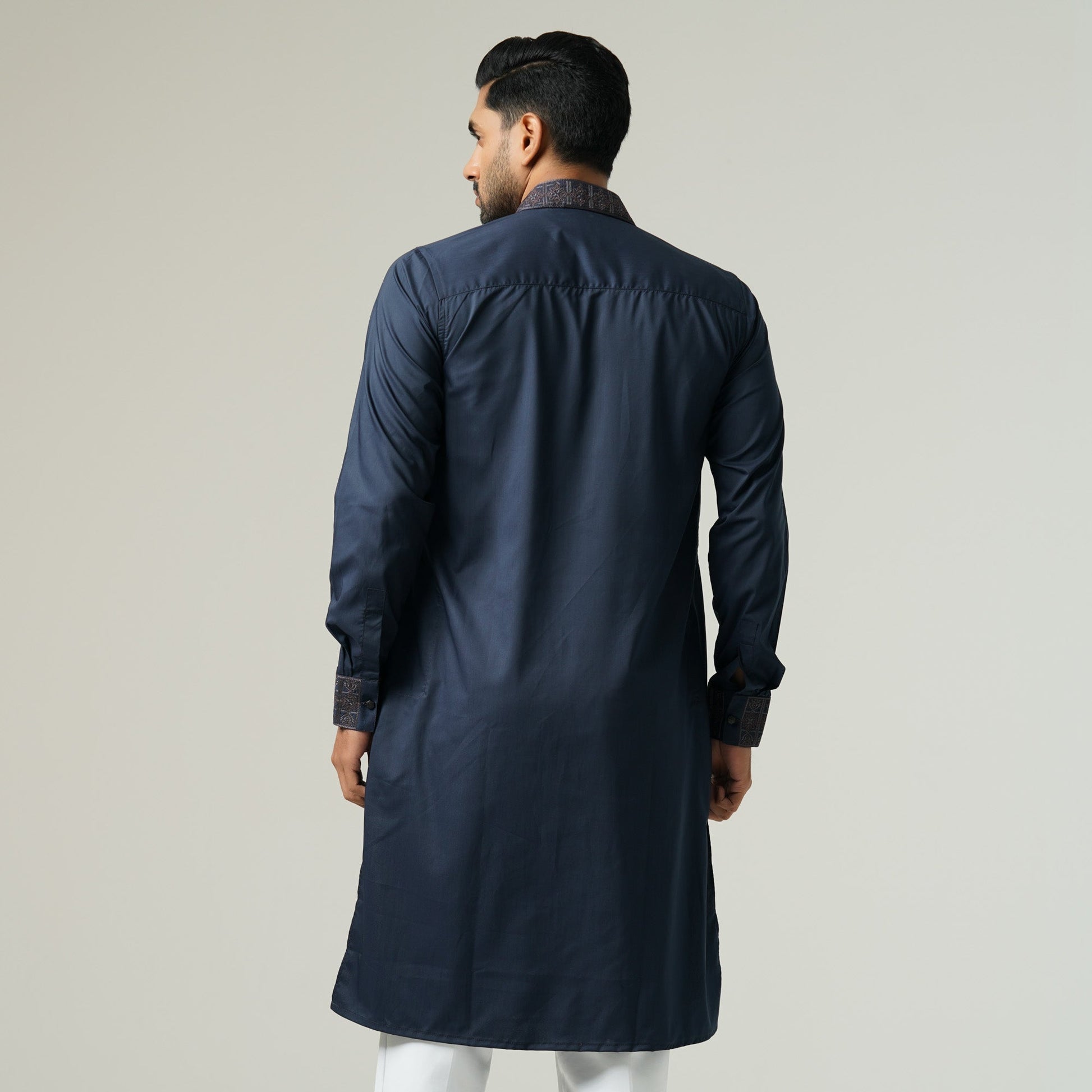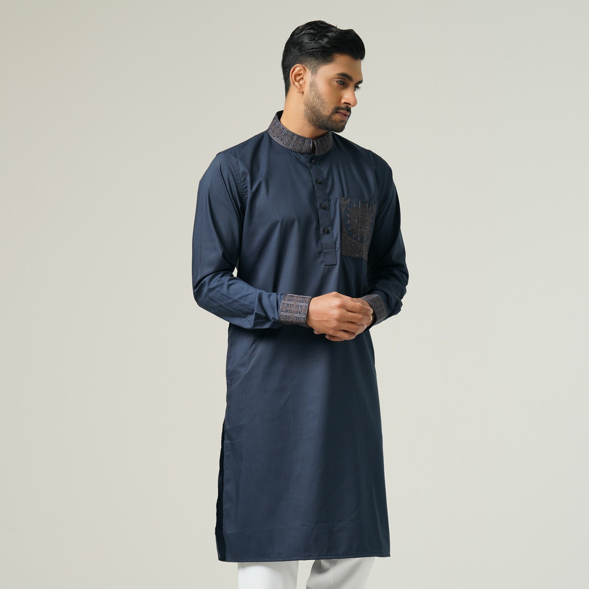 Elevate your style with this Navy color Panjabi, featuring intricate embroidery on cotton blended fabric. Designed in a slim fit for a modern and sophisticated look.