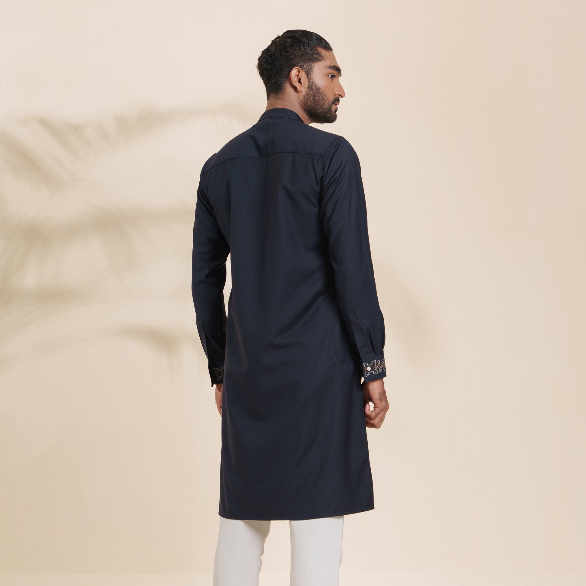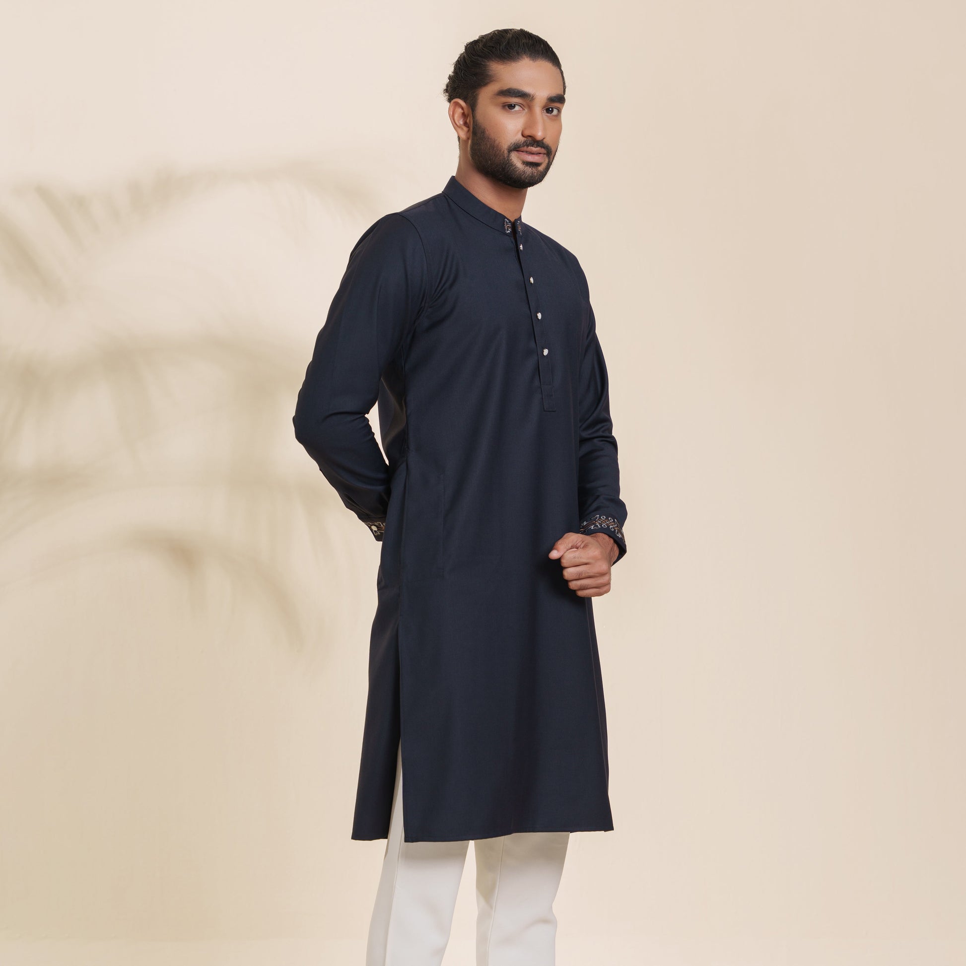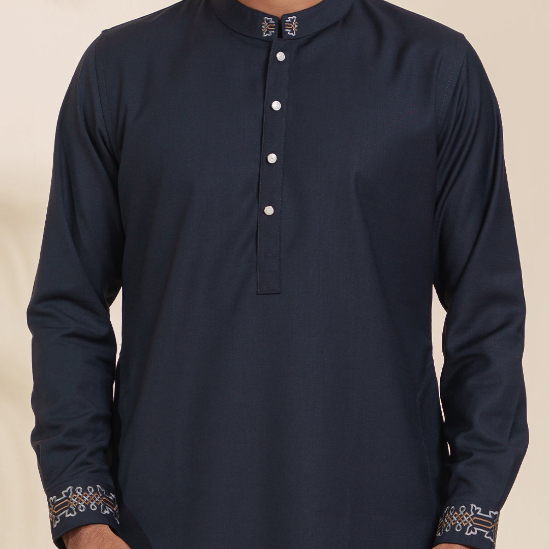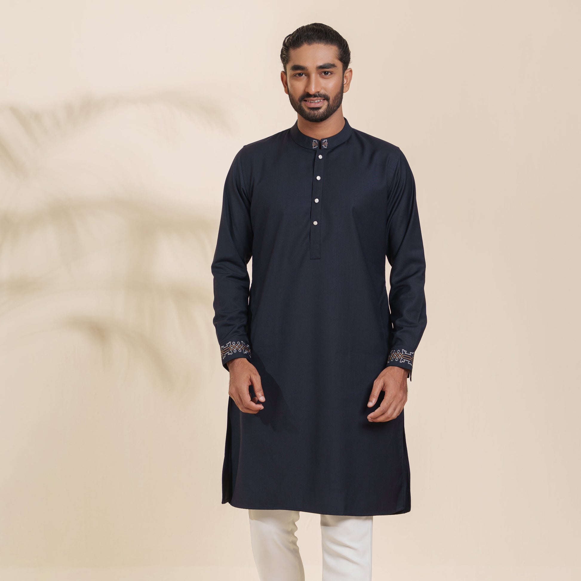 This Mens Premium Panjabi Features A Blend Of Cotton And Linen Fabrics In A Classic Dark Navy Color. It'S Designed With Decorative Embroidery, Making It Perfect For Formal Occasions. Soft And Breathable, It Provides Remarkable Comfort And Style.