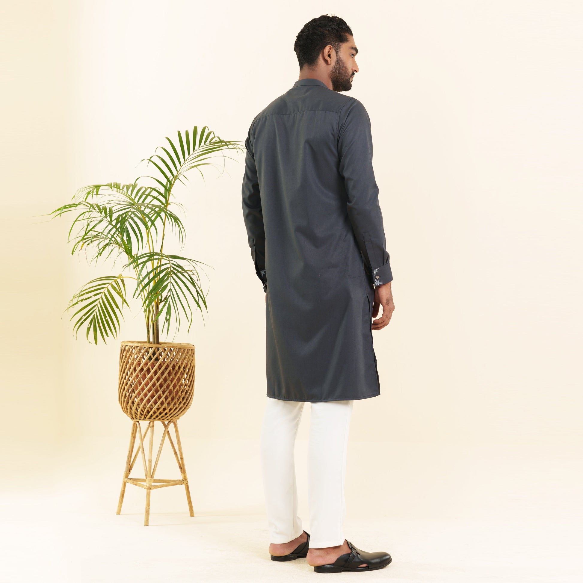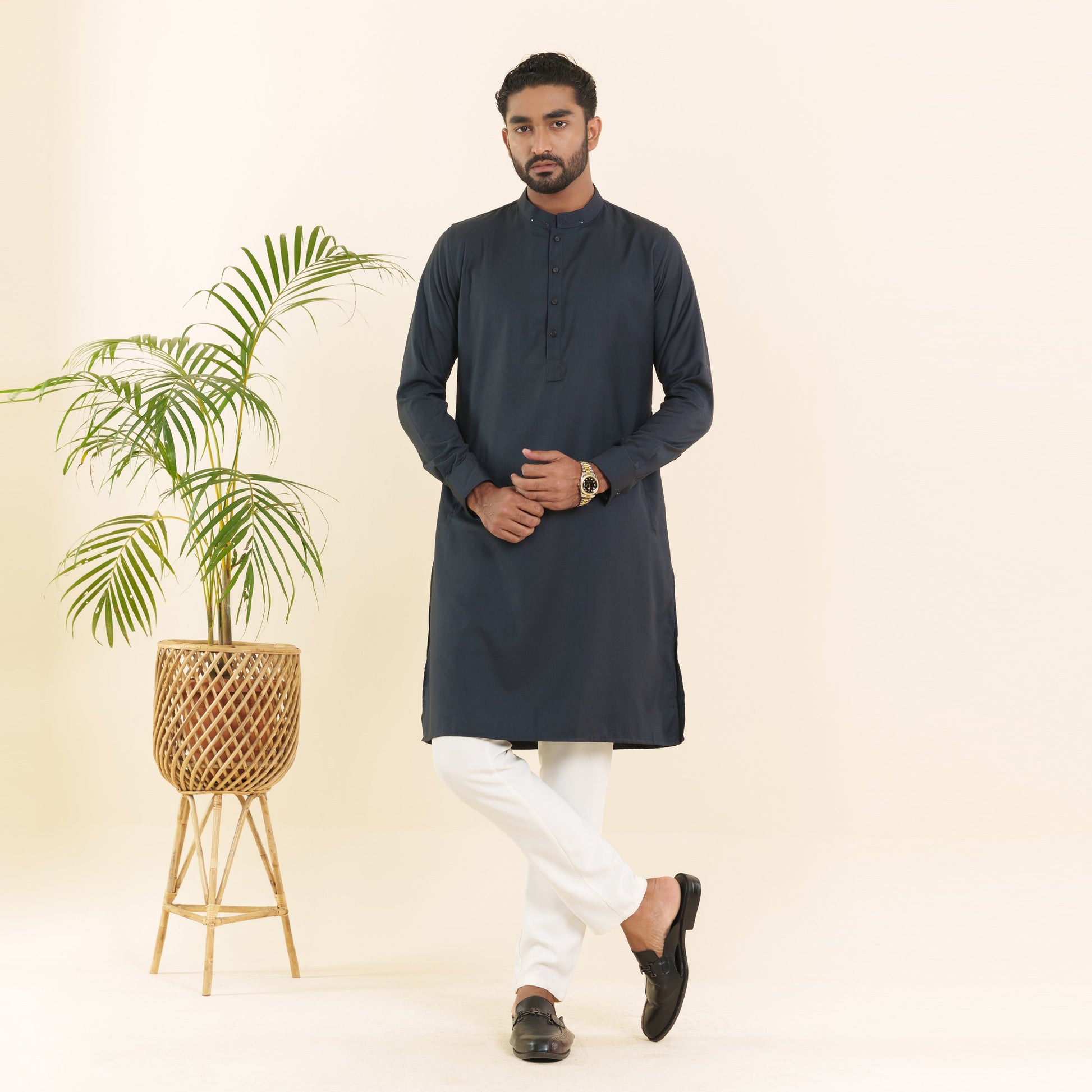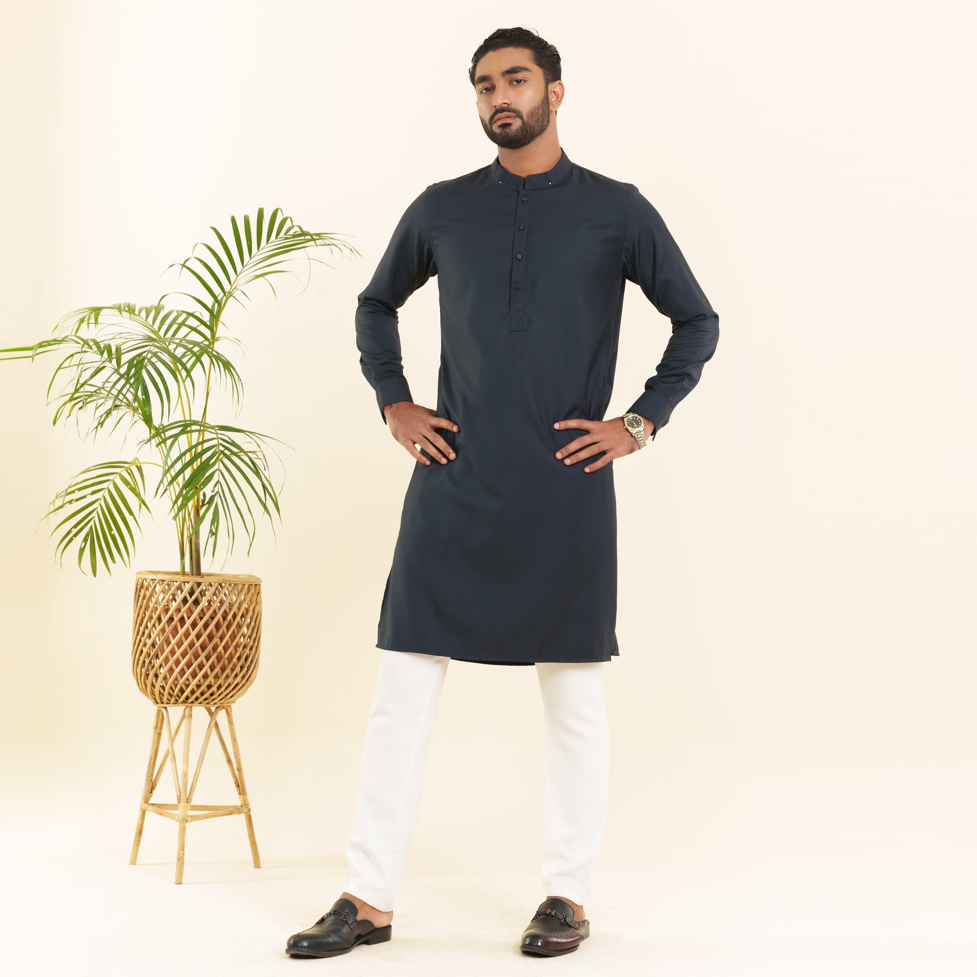 This Men'S Dark Navy Panjabi Combines The Power Of Cotton And Linen Fabrics For A Formal Safari Suit That Exudes Style And Sophistication. Boasting Attractive Decorative Embroidery, This Premium Panjabi Will Effortlessly Elevate Any Special Occasion Look.