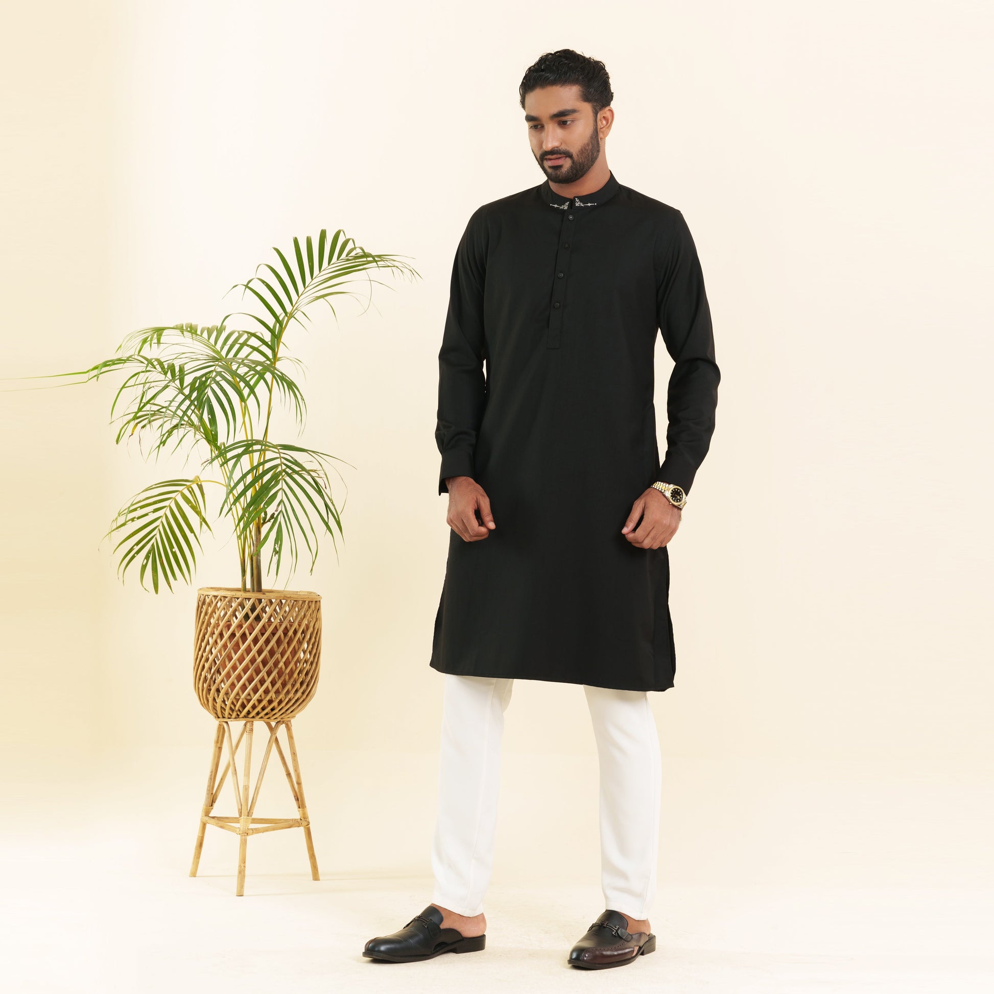 This Men'S Premium Panjabi Is Crafted From A Luxurious Blend Of Cotton And Linen For A Comfortable, Lightweight Feel. It Has A Jet Black Finish And Decorative Embroidery For A Timeless, Formal Look. Perfect For Dressy Occasions Or For Everyday Wear, This Panjabi Will Keep You Cool And Stylish.