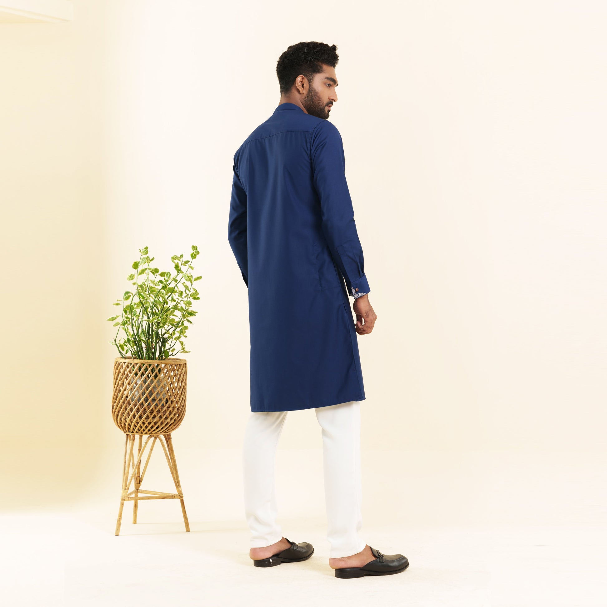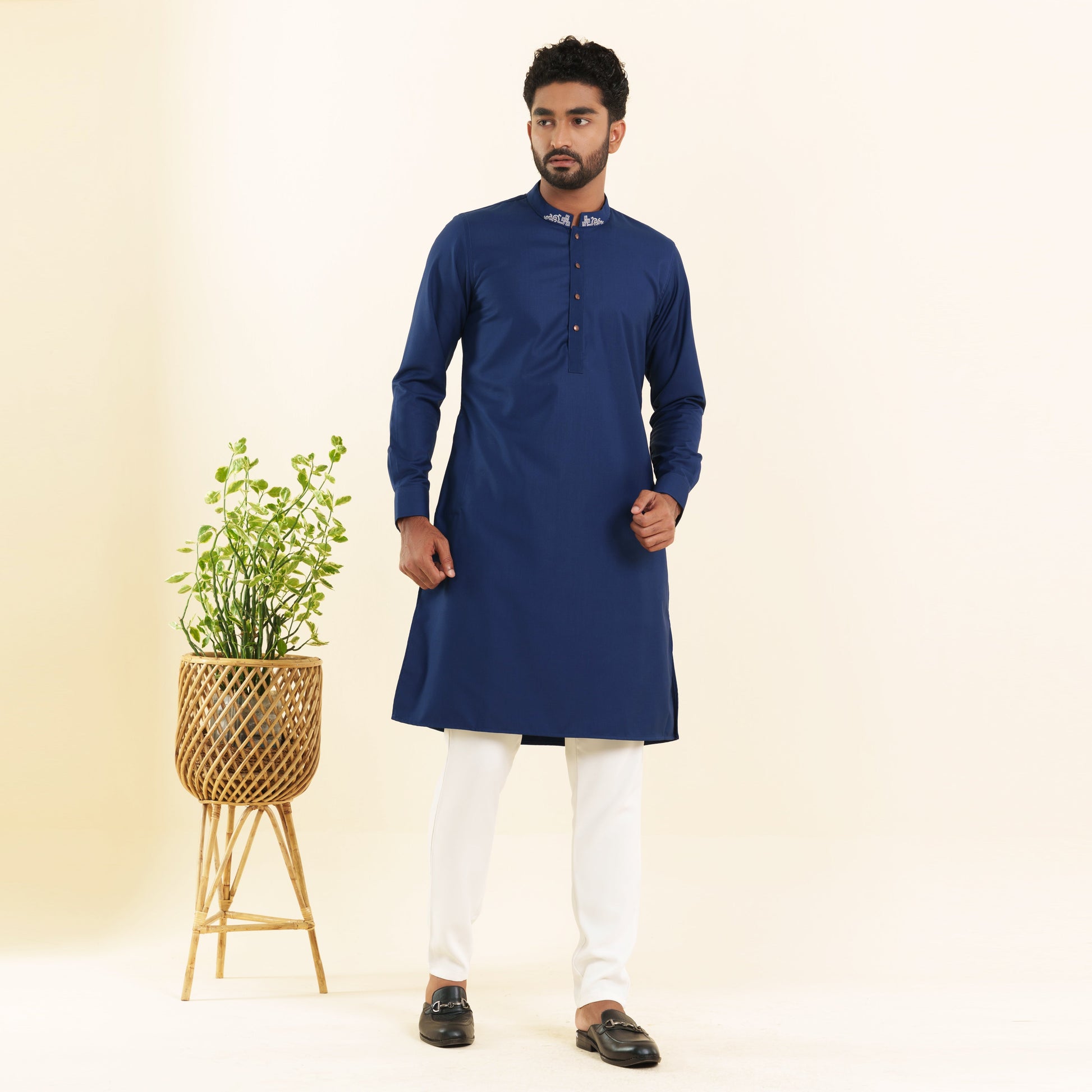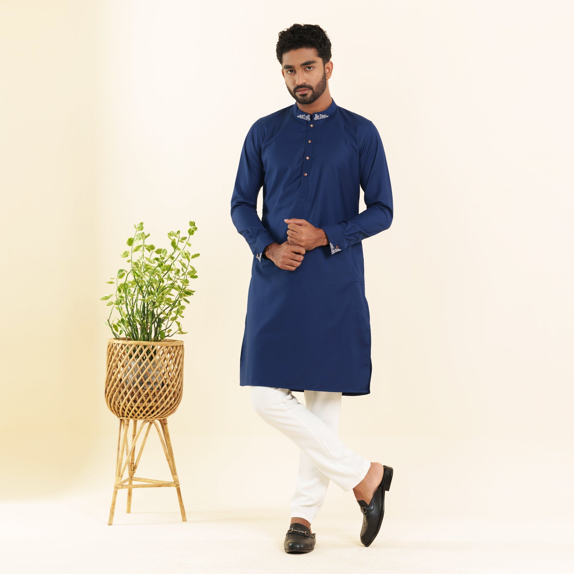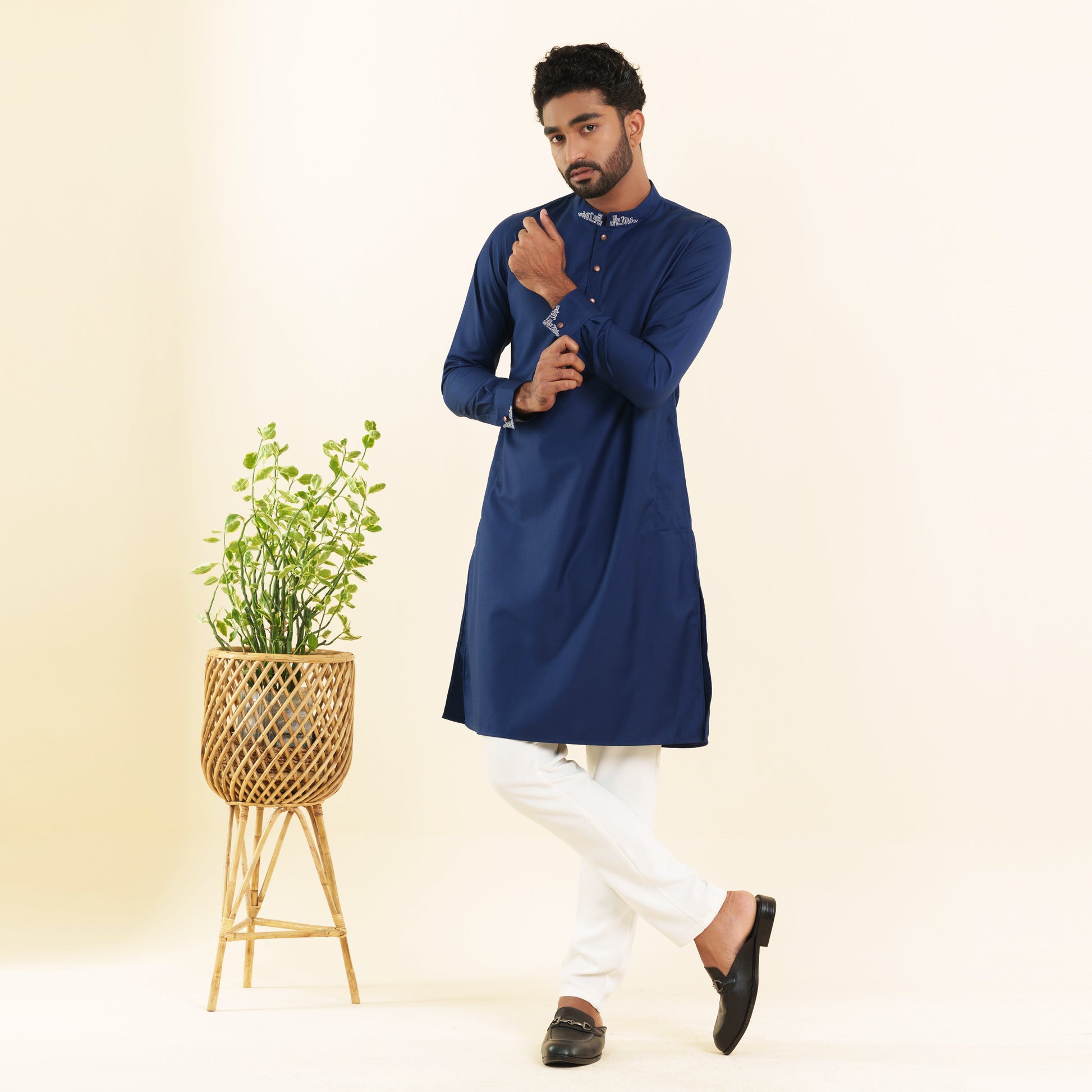 Enhance your traditional wardrobe with this men's deep navy Panjabi. Designed with a mandarin collar featuring elegant embroidery and metal shank buttons, it is made from a poly-cotton blend for a comfortable regular fit. Ideal for cultural events and special occasions, this panjabi combines classic charm with contemporary style.