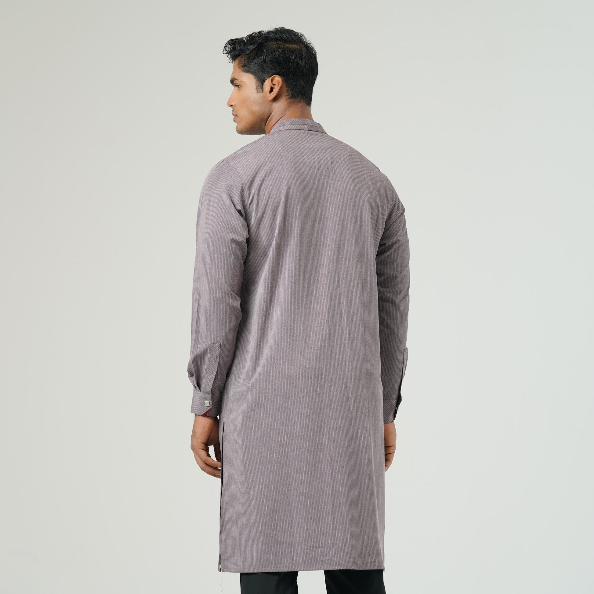 This slim-fit Panjabi in Grey Mauve showcases intricate machine embroidery and expert fabric manipulation for a refined look. Crafted from premium blended fabric, it offers both comfort and sophistication, making it a perfect choice for festive and special occasions. Elevate your traditional wardrobe with this stylish ensemble.