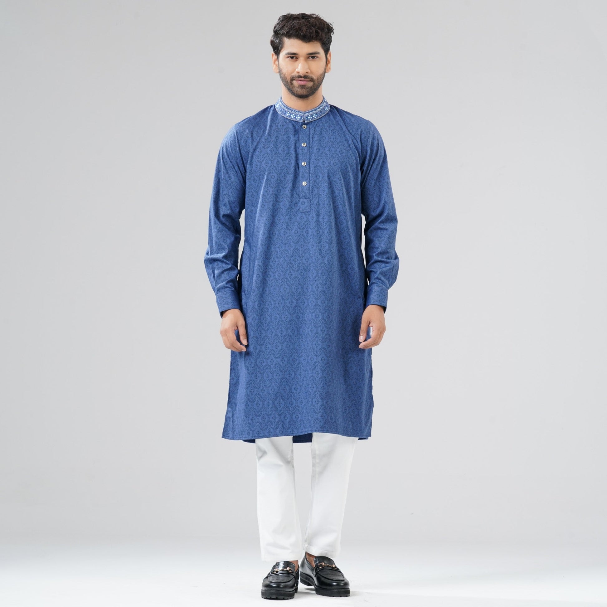 This men’s indigo premium panjabi exudes Mughal-inspired elegance with all-over screen print and computer embroidery featuring thread and sequin detailing. Crafted from soft cotton-based twill fabric, it ensures comfort and a regular fit. Finished with metal snap buttons, this panjabi is perfect for festive occasions and formal events.