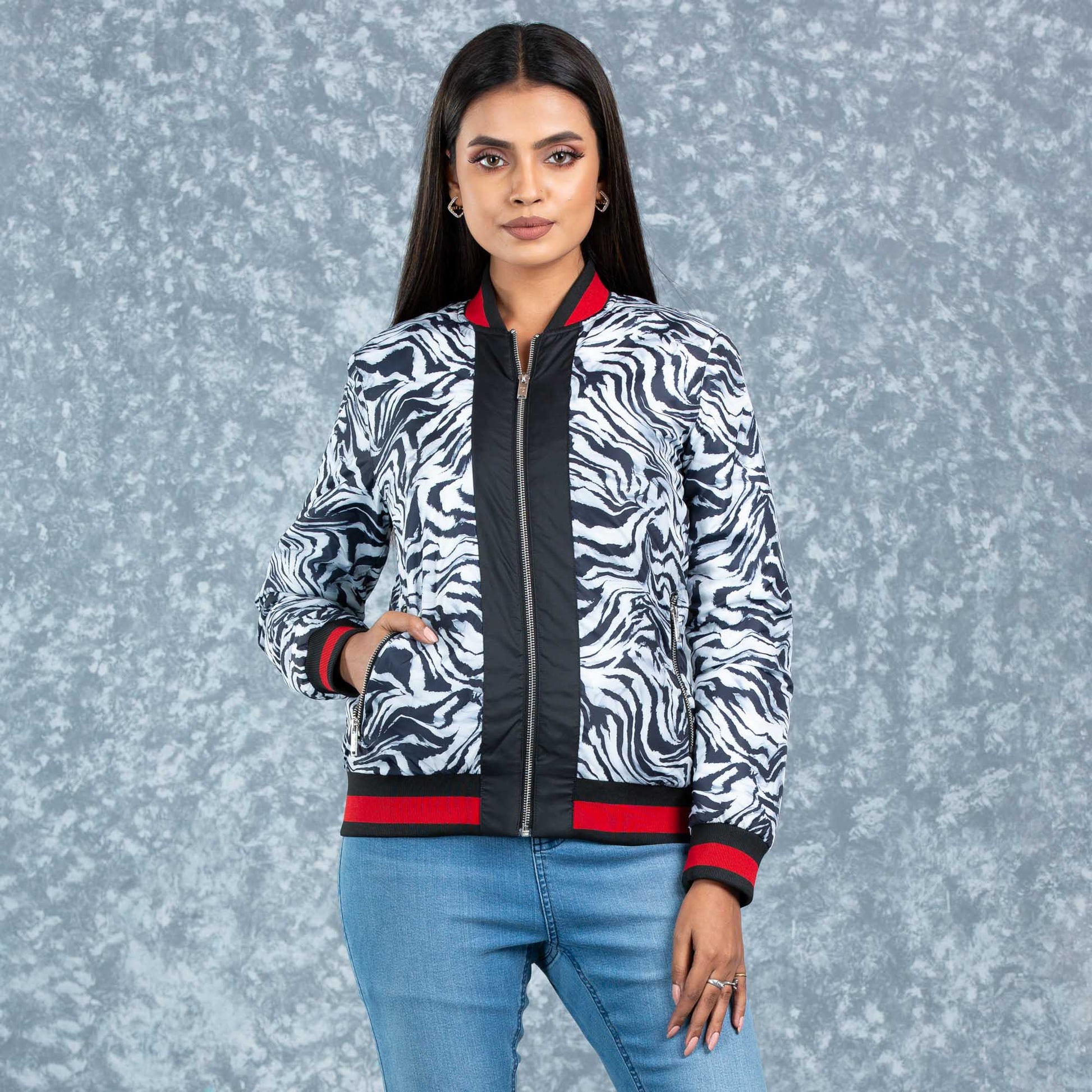 This Women's Bomber Jacket is designed with lightweight and breathable fabric for premium comfort and style. Featuring a black and white allover pattern and an adjustable drawstring waist, this piece is perfect for layering when temperatures drop.