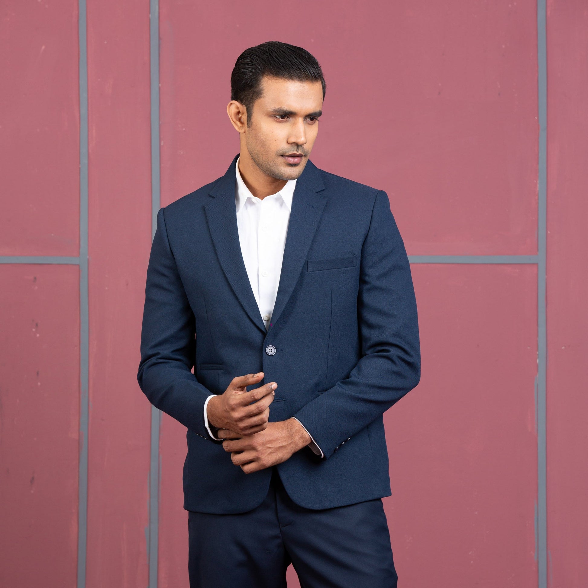 This classic and stylish dark navy men's blazer is perfect for any formal occasion. Crafted from a high-quality fabric, it's a timeless and comfortable piece to add to your wardrobe.