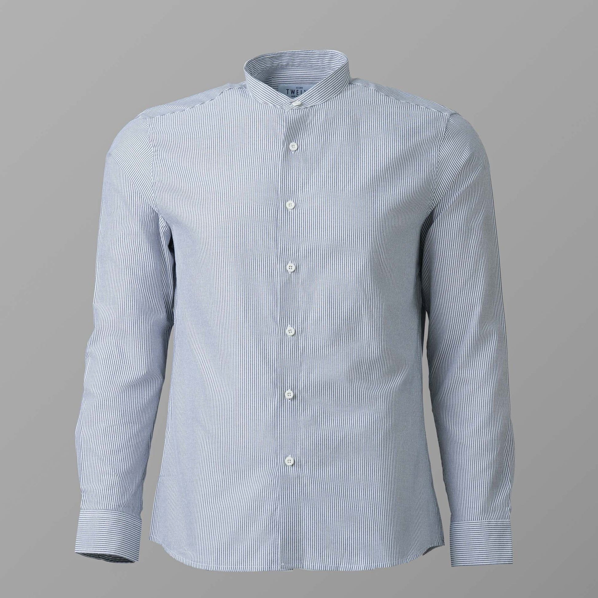 Classic mens formal shirt in a timeless bleck stripe pattern, crafted from soft blended fabric for comfort and durability. Designed with a sleek band collar for a modern twist on traditional formalwear. Perfect for office wear, meetings, or special occasions with a sharp and polished look.