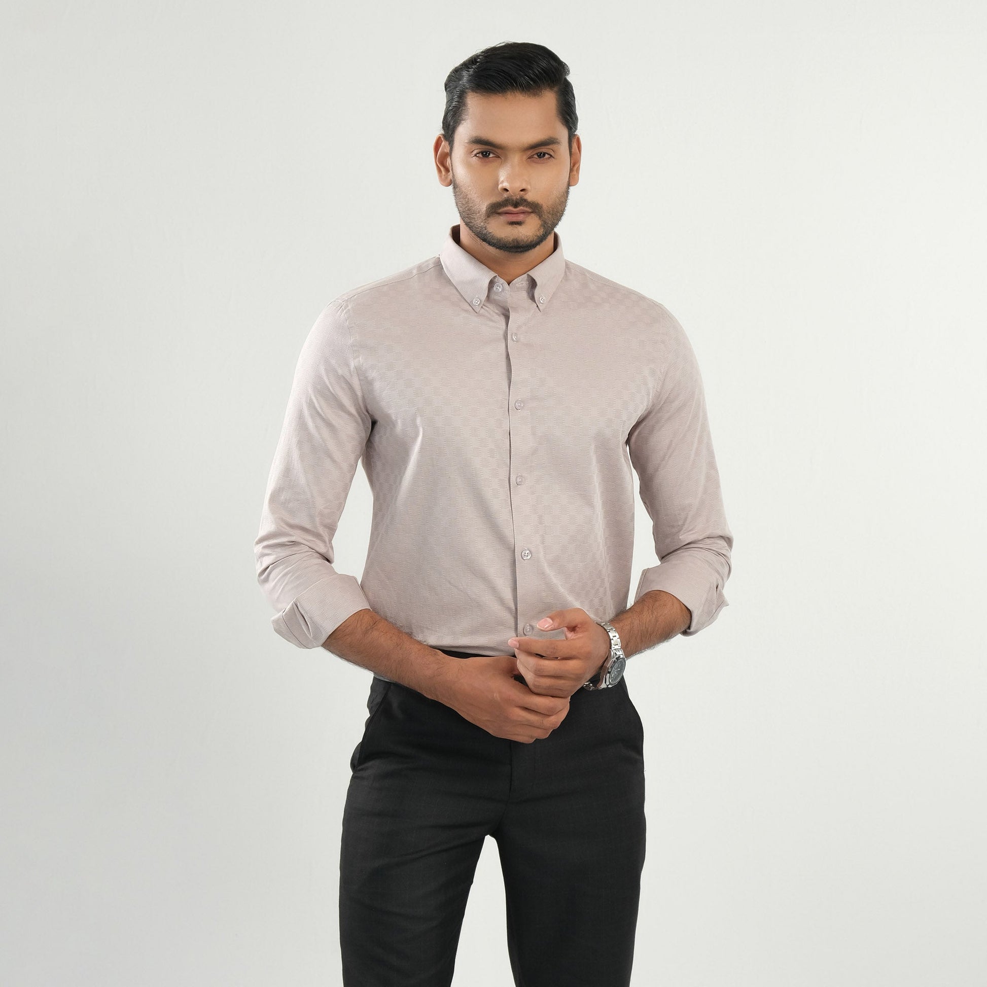 This men's ash formal shirt is crafted from blended jacquard fabric, featuring a button-down collar and classic button placket. The regular fit ensures comfort and a sleek, professional appearance. Ideal for formal events or business meetings, this shirt adds a touch of subtle sophistication to any wardrobe.