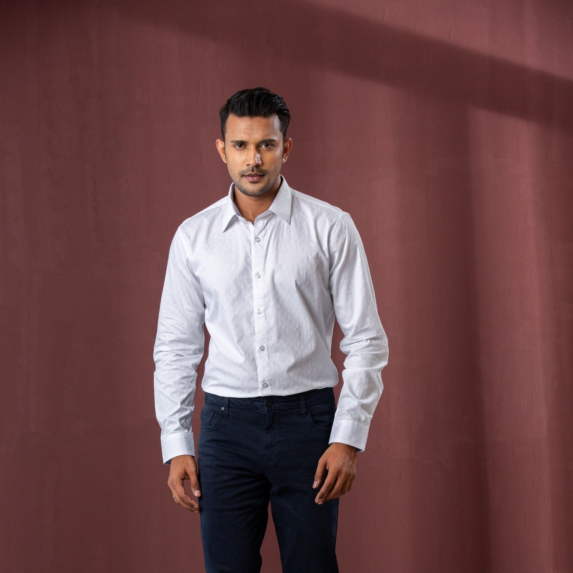 This men's white formal shirt is made from premium cotton jacquard fabric, offering a classic look with a sophisticated feel. It features a classic collar and button placket, ensuring timeless style and comfort. The regular fit is perfect for formal occasions or business settings, making it a versatile addition to any wardrobe.