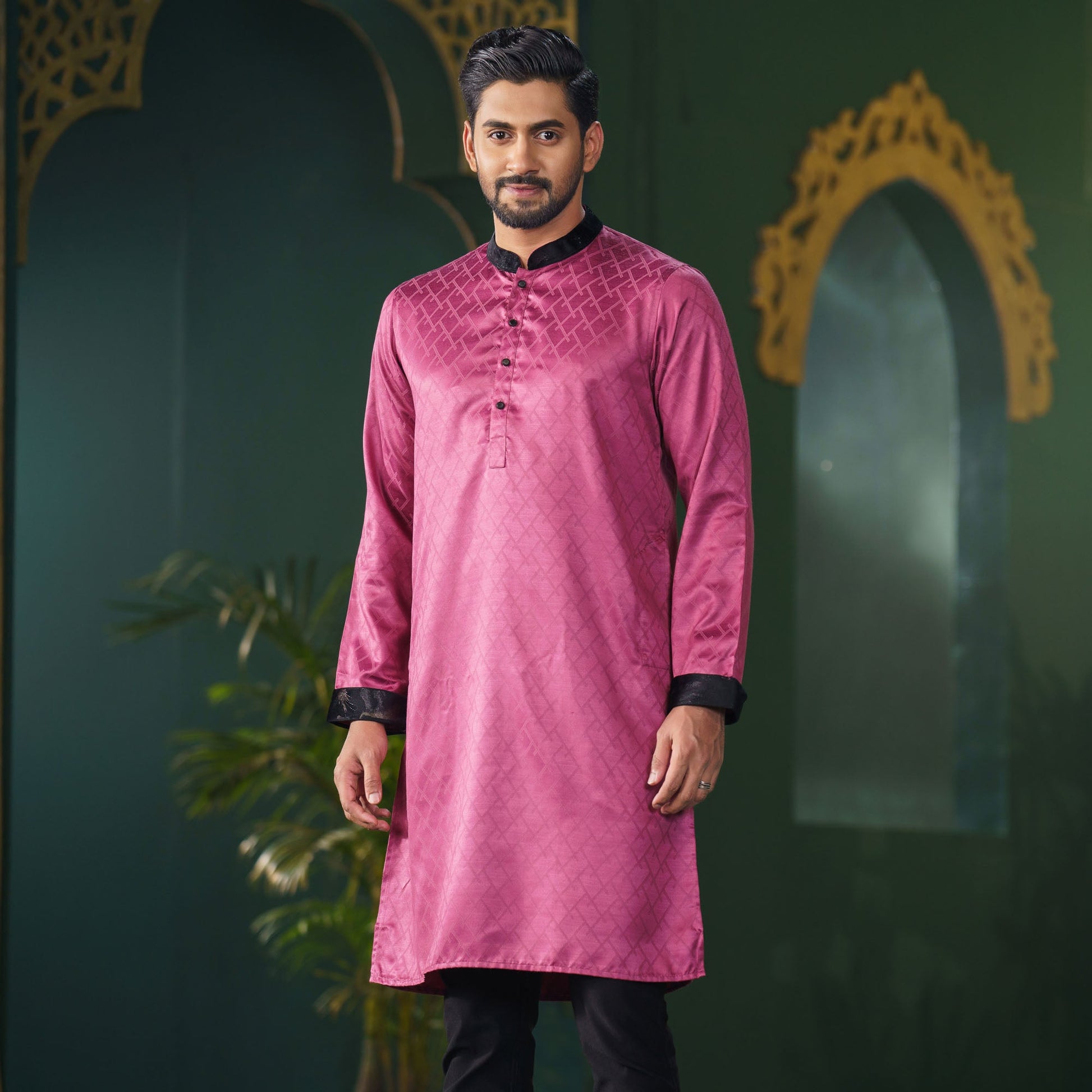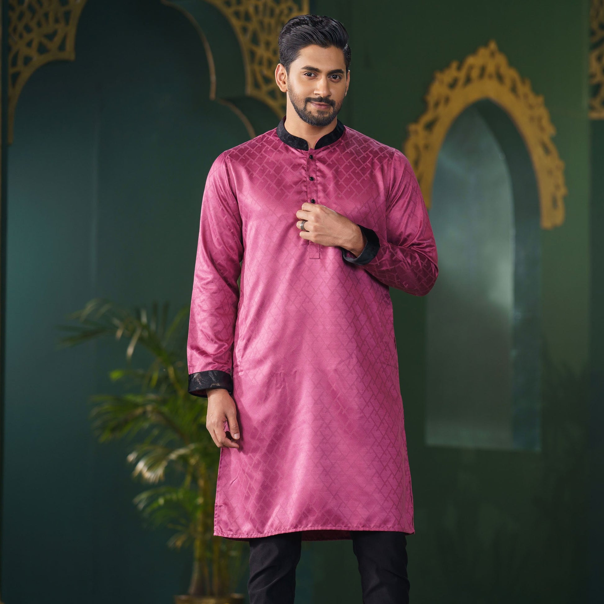 This men’s mauve basic Panjabi features a contrast collar with metal shank buttons, crafted from rich jacquard fabric. Offering a regular fit and available in Panjabi size, it brings a stylish and elegant touch to traditional wear.