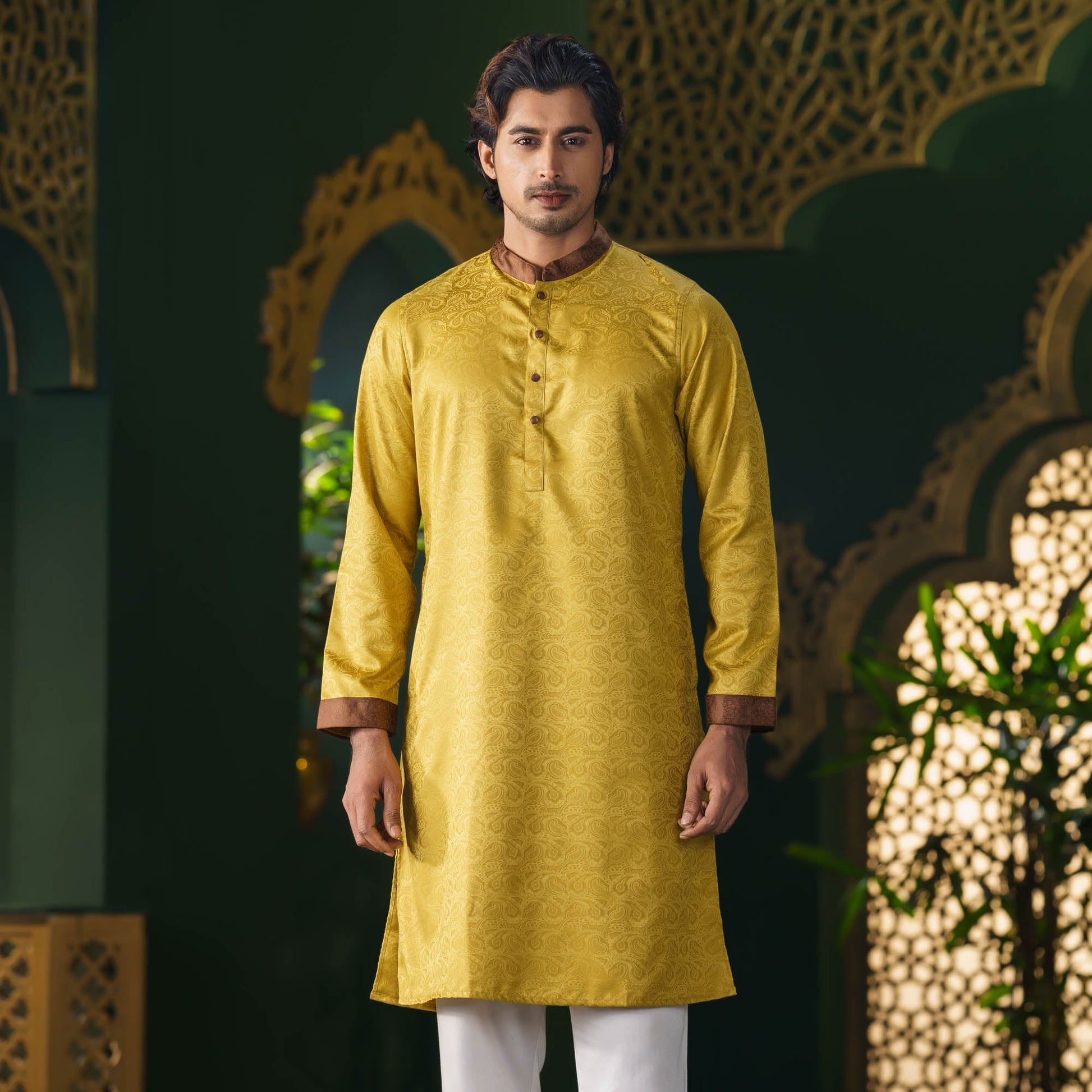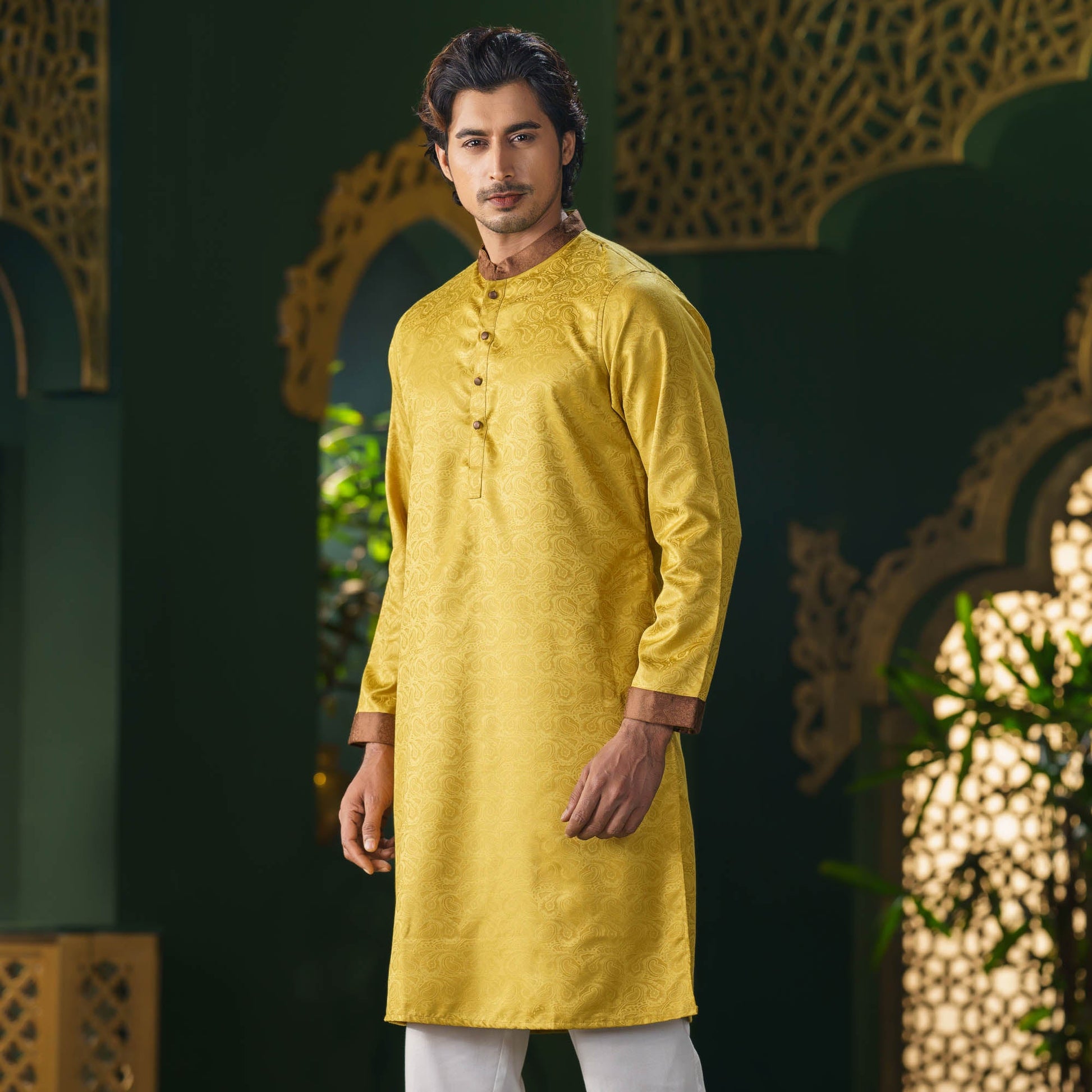 This men’s yellow basic Panjabi features a contrast collar and metal shank buttons, crafted from luxurious jacquard fabric. With a regular fit and available in Panjabi size, it adds a vibrant and elegant touch to traditional wear.