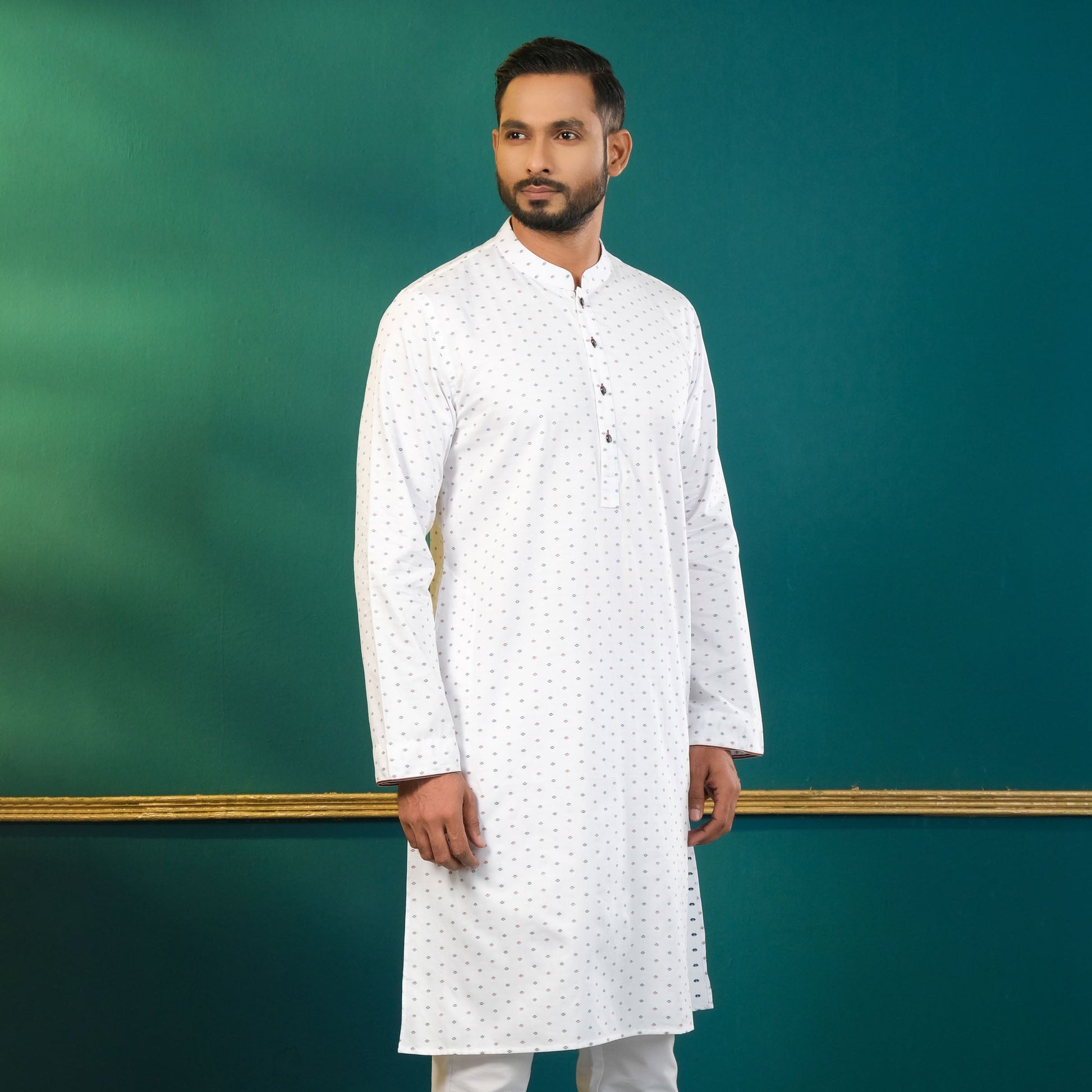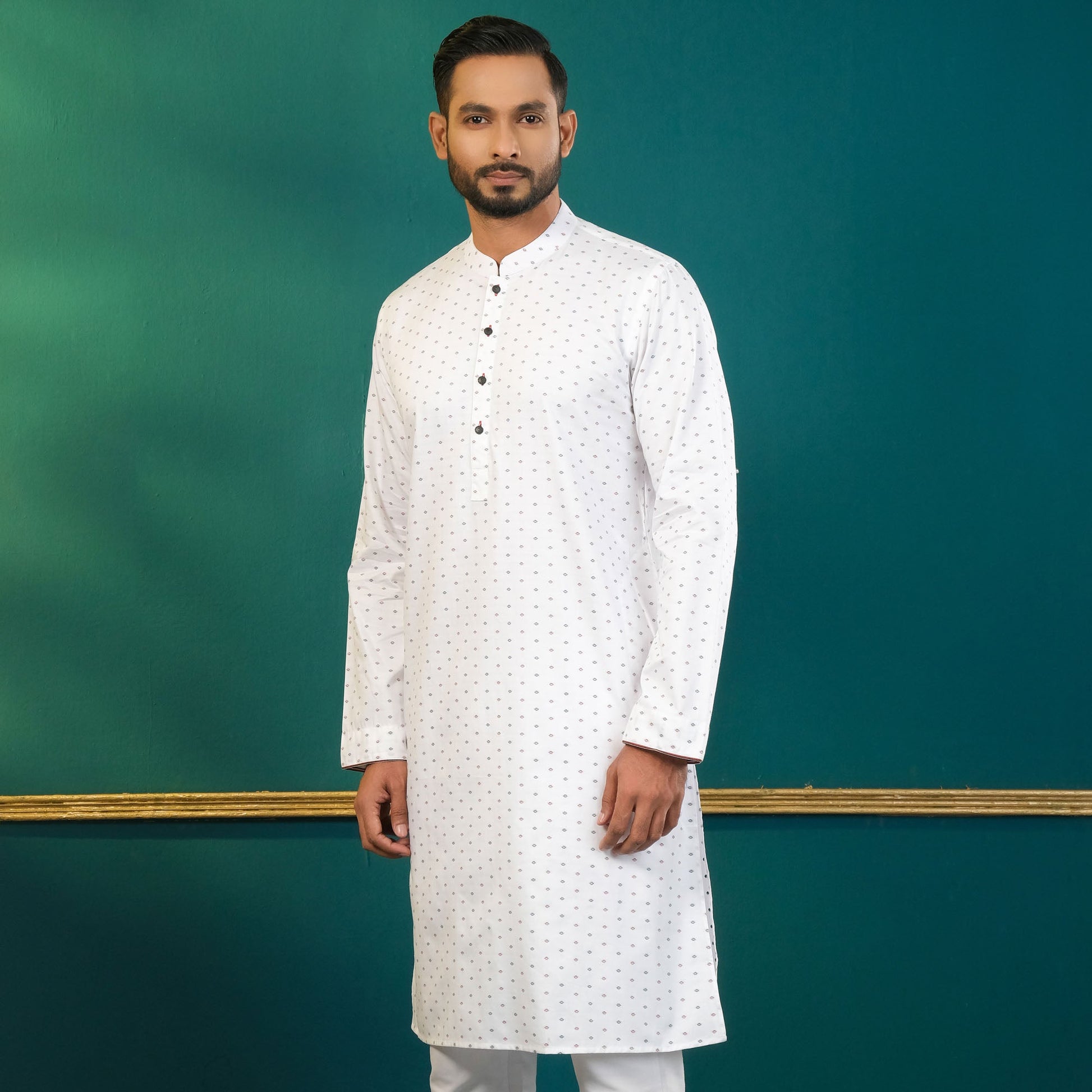 This men's white panjabi features sleek metal shank buttons, adding a touch of sophistication to this timeless piece. Crafted from a poly-cotton blend, it offers a regular fit that ensures both comfort and elegance. Perfect for any traditional or semi-formal occasion, available in multiple sizes.