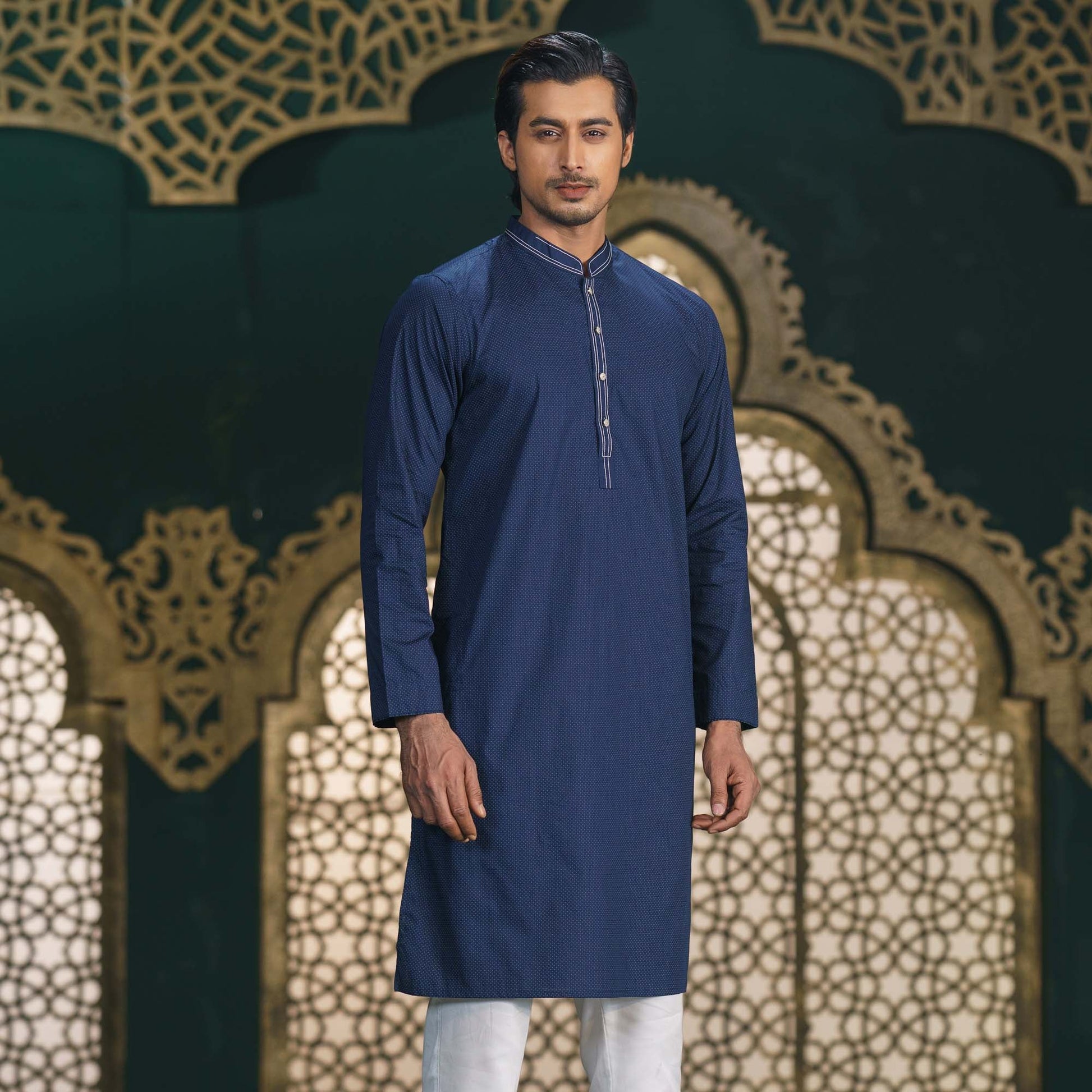 This men’s navy basic Panjabi features metal shank buttons for a subtle touch of sophistication. Crafted from poly cotton, it provides a regular fit, combining comfort and classic style for everyday wear and casual occasions.