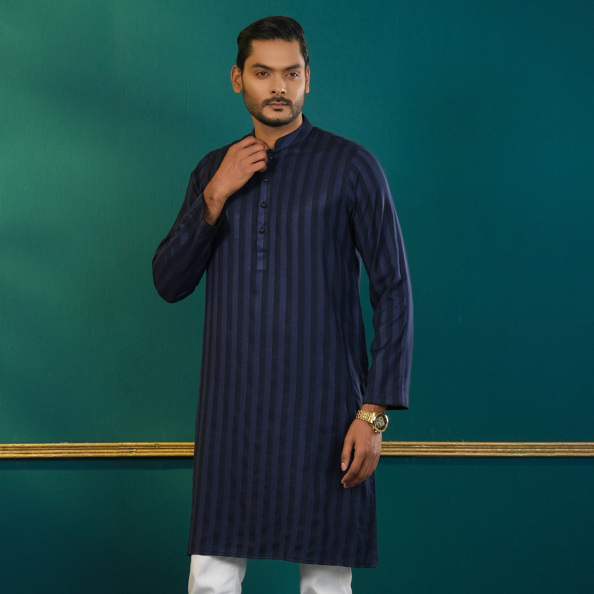 This men's blue Panjabi features classic metal shank buttons, adding a touch of sophistication to its traditional design. Made from a poly-cotton blend, it provides a regular fit that ensures both comfort and style. Available in size A and perfect for various occasions, including cultural and casual events.