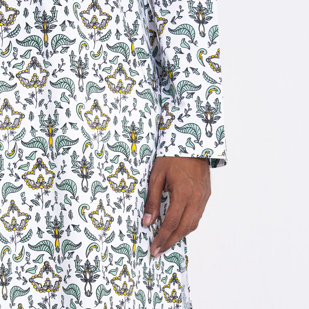 Crafted from a comfortable mixed cotton fabric, this slim-fit Panjabi features a striking black and white screen print. Perfect for traditional occasions, it offers a stylish yet breathable feel for all-day wear.