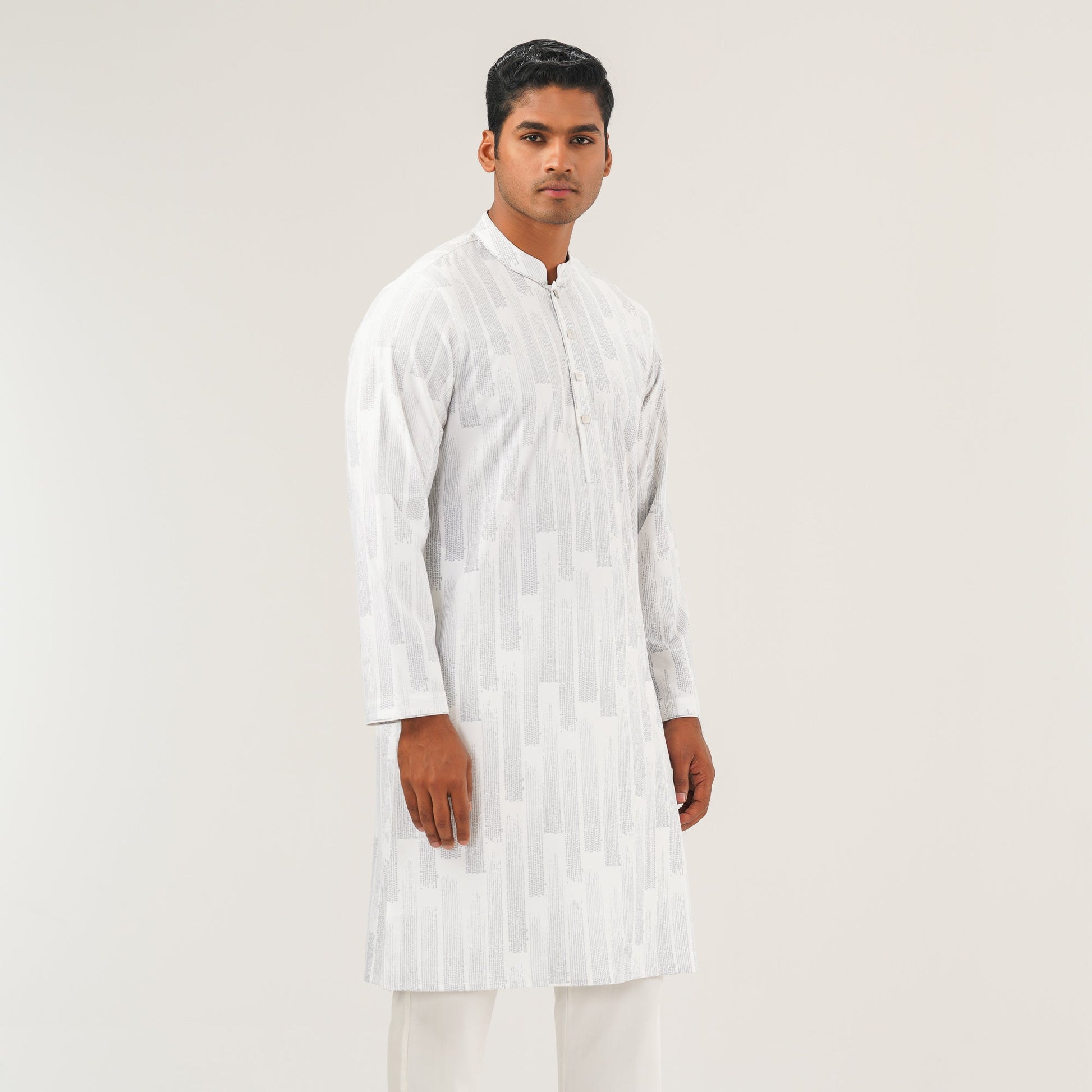 White panjabi crafted from breathable bamboo cotton for all-day comfort. Designed with an all-over print that adds a modern twist to traditional wear. Perfect for festive occasions, cultural gatherings, or special events.